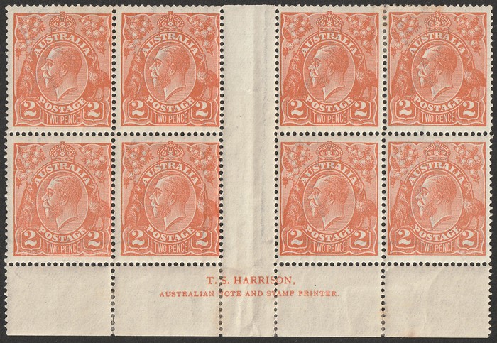 imprint blk of 8, identified as Electro 8A. F-VF 4M/4MNH, sl aging on hinges in selvedge & at top. SG 62(var). ACSC 95E(8A)z cat $3600. Rare imprint. Ex Sandy. (8) (P)