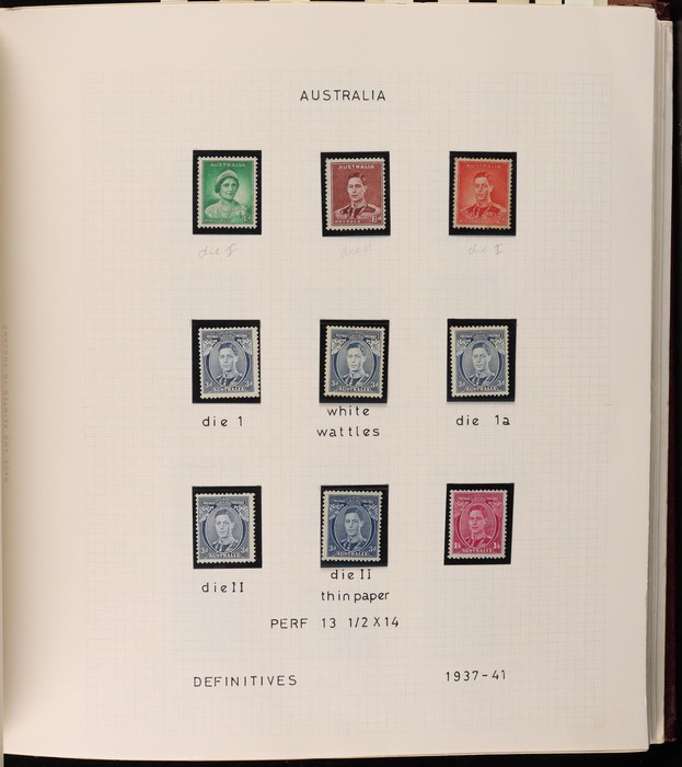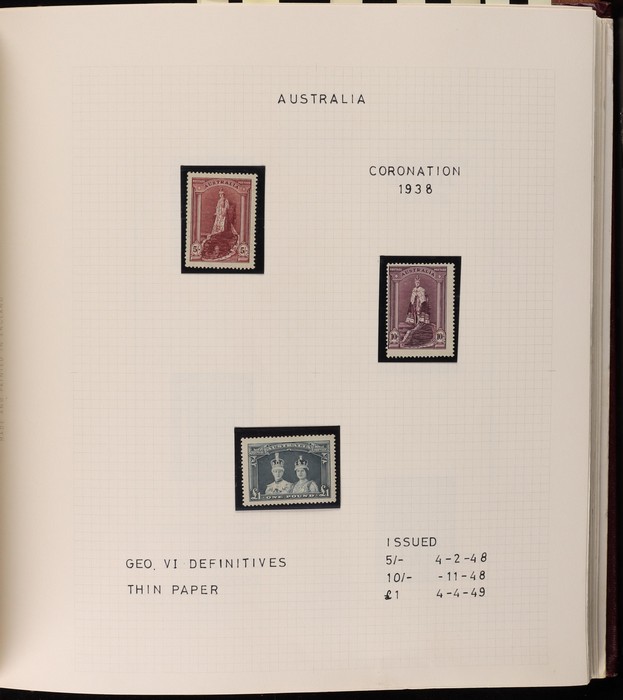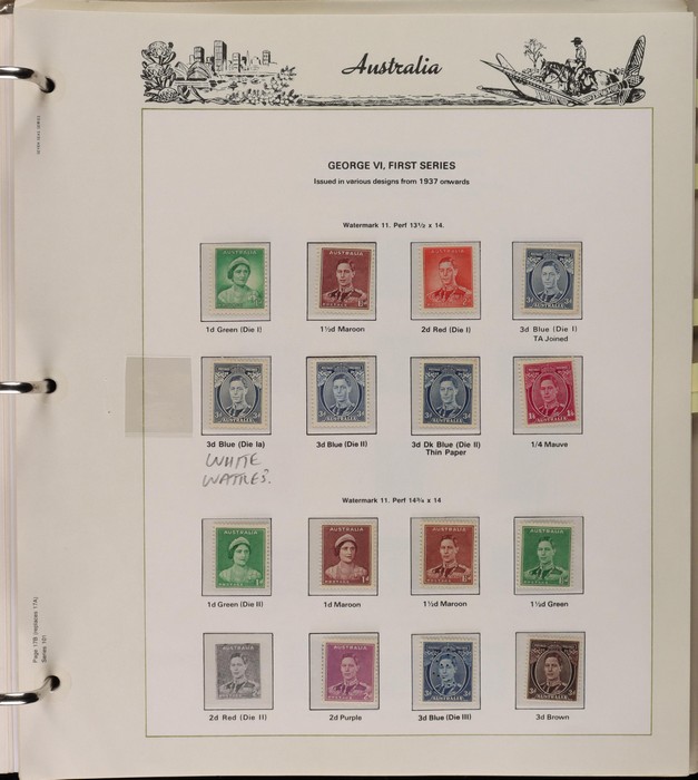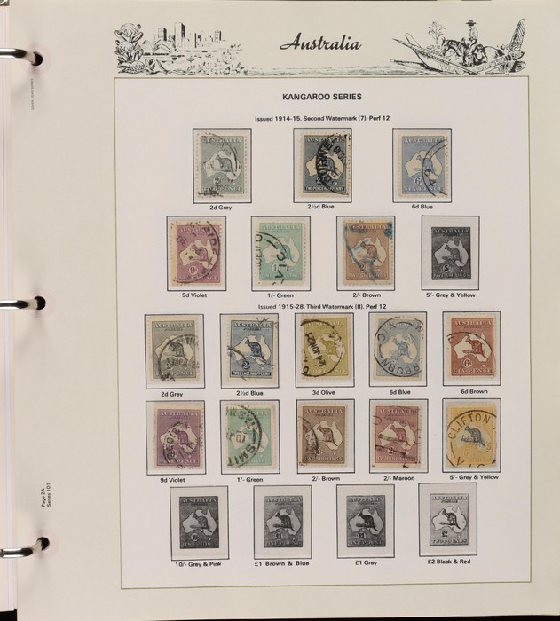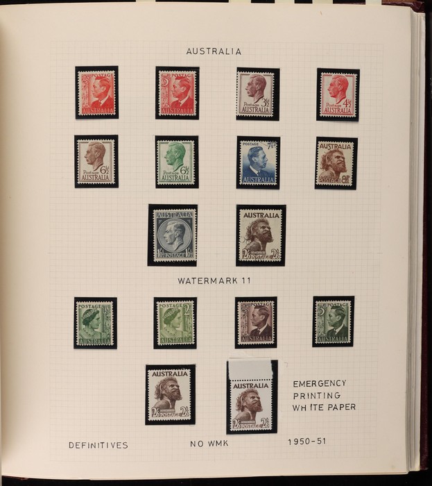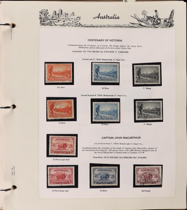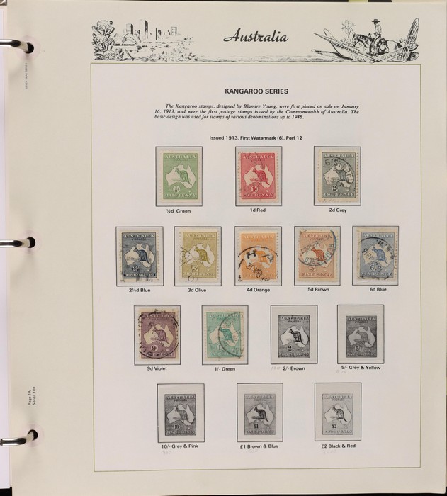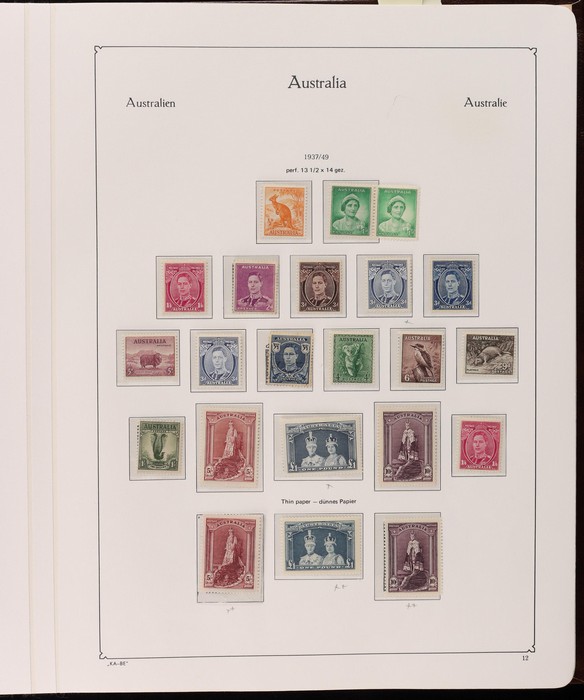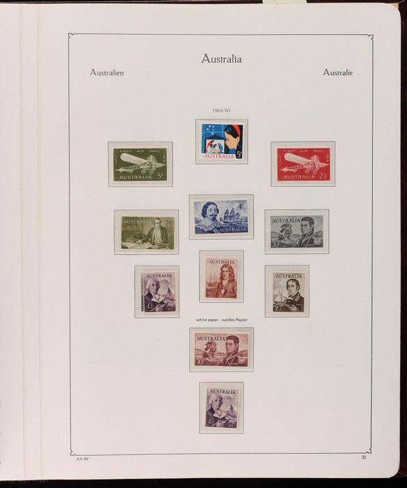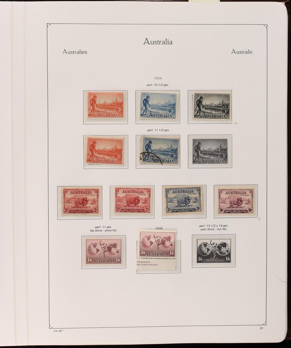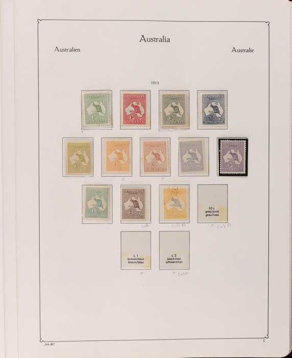 64 image1913-65 MNH/M/U collection in Seven Seas album with Kangaroos 1st wmk to 1/-, 2nd to 2/-, 3rd to 5/-, SM wmk to 2/- & CofA to 10/-, plus £1 grey Telegraph Puncture, all G-FU. KGV set of 72 inc 1d red Die II, Die II, 1d green Die I-II pr, 4½d Die II & OS opt to 5d brown F-VFU, plus perf OS near comp (51) with single wmk to 1/4, no wmk 1d & 1½d, SM wmk perf 14, 2d, 4d, 4½d & 1/4. SM wmk perf 13½x12½ (12) to 1/4, G-FU inc odd CTO (ACSC cat $1500). 1914 Kookaburra 6d Engraved CTO, 1927-30 Commems set of 6 perf OS, 1928 Kookaburra 3d M/sheet M. 1931-37 Commems & Pics F-VFU with OS opt set of 6 to 1/- Lyrebird set. 1934 VIC Cent & Macarthur sets, 1935 ANZAC 1/- & KGV SJ to 2/-, 1936 SA & 1937 NSW Sesqui set. KGVI 1937-50 near comp M inc 3d blue 'white wattles' Robes set to £1, plus 10/- opt SPECIMEN. 1940 AIF set & 1949 Arms set to £2. 1951-65 Pics, Defs & Commems comp inc 1950 KGVI Defs to 2/6, 1959-61 Pics to 5/- Cattle white paper, 1964 Navigators set of 8 to £2 & 1964 Birds to 3/-. MNH/M/U as noted, ACSC cat $6850, plus extra for £1 Kangaroo. (450) (P) (Image1) (Image2) (Image3) (Image4) (Image5) (Image6) (Image7) (Image8) (Image9) (Image10) (Image11) (Image12) (Image13) (Image14) (Image15) (Image16) (Image17) (Image18) (Image19) (Image20) (Image21) (Image22) (Image23) (Image24) (Image25) (Image26) (Image27)