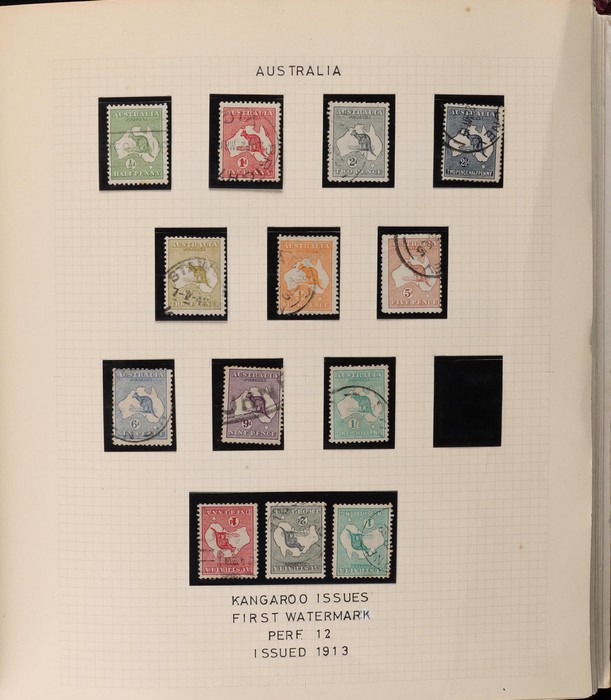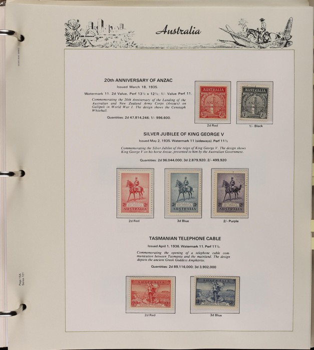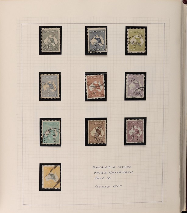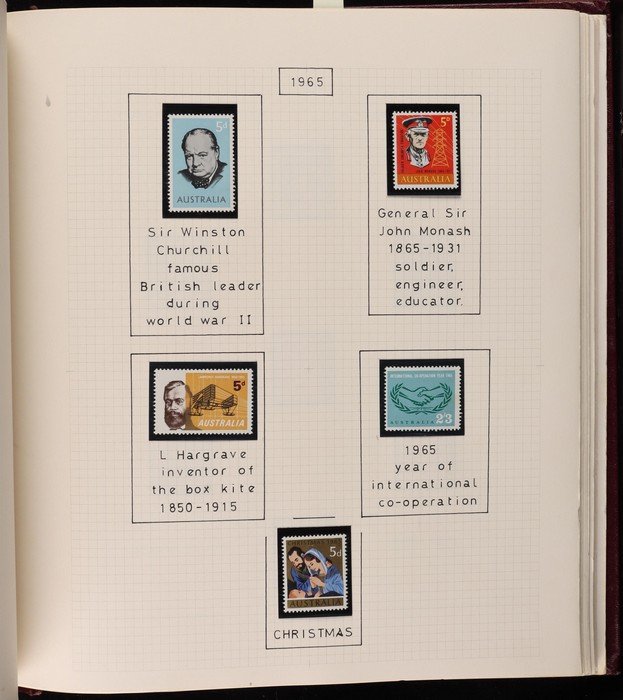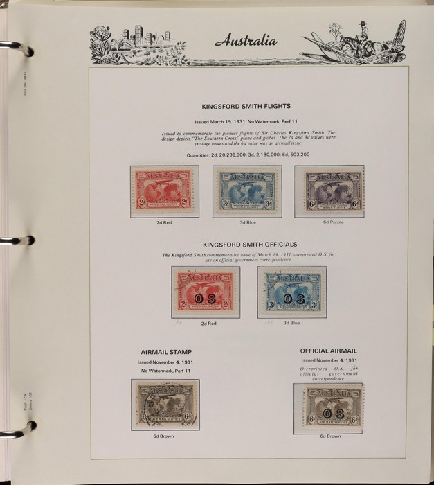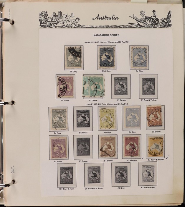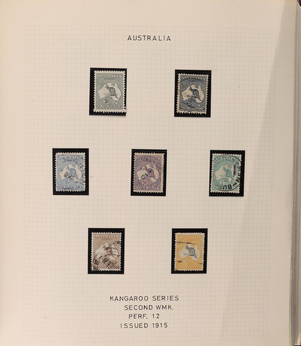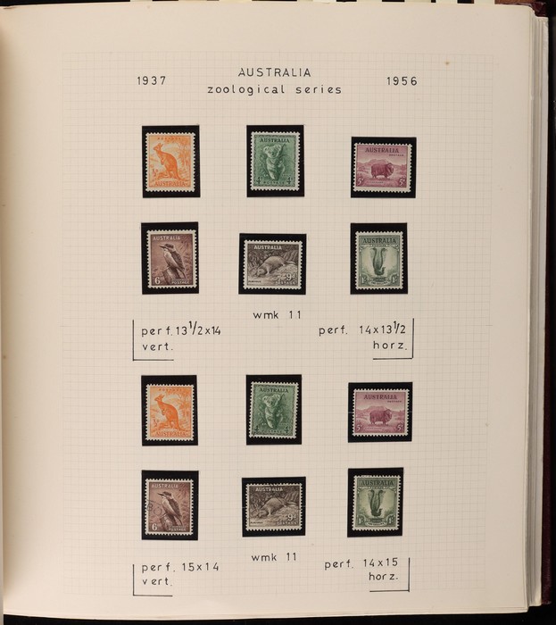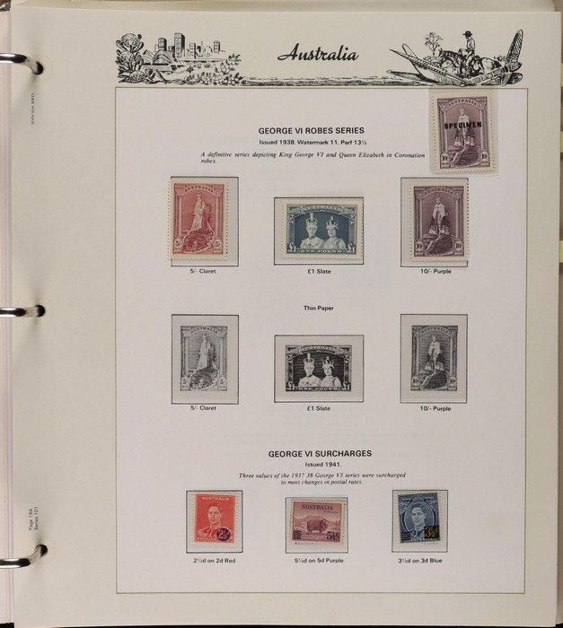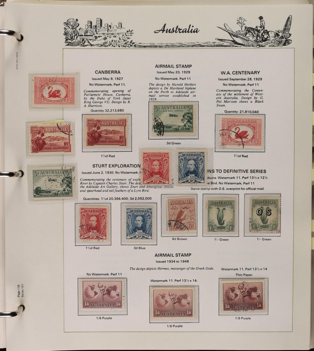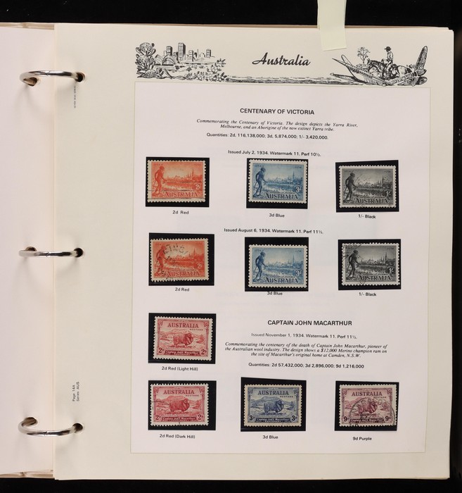 64 image1913-65 MNH/M/U collection in Seven Seas album with Kangaroos 1st wmk to 1/-, 2nd to 2/-, 3rd to 5/-, SM wmk to 2/- & CofA to 10/-, plus £1 grey Telegraph Puncture, all G-FU. KGV set of 72 inc 1d red Die II, Die II, 1d green Die I-II pr, 4½d Die II & OS opt to 5d brown F-VFU, plus perf OS near comp (51) with single wmk to 1/4, no wmk 1d & 1½d, SM wmk perf 14, 2d, 4d, 4½d & 1/4. SM wmk perf 13½x12½ (12) to 1/4, G-FU inc odd CTO (ACSC cat $1500). 1914 Kookaburra 6d Engraved CTO, 1927-30 Commems set of 6 perf OS, 1928 Kookaburra 3d M/sheet M. 1931-37 Commems & Pics F-VFU with OS opt set of 6 to 1/- Lyrebird set. 1934 VIC Cent & Macarthur sets, 1935 ANZAC 1/- & KGV SJ to 2/-, 1936 SA & 1937 NSW Sesqui set. KGVI 1937-50 near comp M inc 3d blue 'white wattles' Robes set to £1, plus 10/- opt SPECIMEN. 1940 AIF set & 1949 Arms set to £2. 1951-65 Pics, Defs & Commems comp inc 1950 KGVI Defs to 2/6, 1959-61 Pics to 5/- Cattle white paper, 1964 Navigators set of 8 to £2 & 1964 Birds to 3/-. MNH/M/U as noted, ACSC cat $6850, plus extra for £1 Kangaroo. (450) (P) (Image1) (Image2) (Image3) (Image4) (Image5) (Image6) (Image7) (Image8) (Image9) (Image10) (Image11) (Image12) (Image13) (Image14) (Image15) (Image16) (Image17) (Image18) (Image19) (Image20) (Image21) (Image22) (Image23) (Image24) (Image25) (Image26) (Image27)