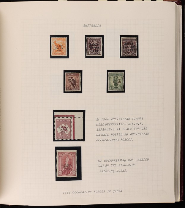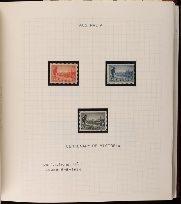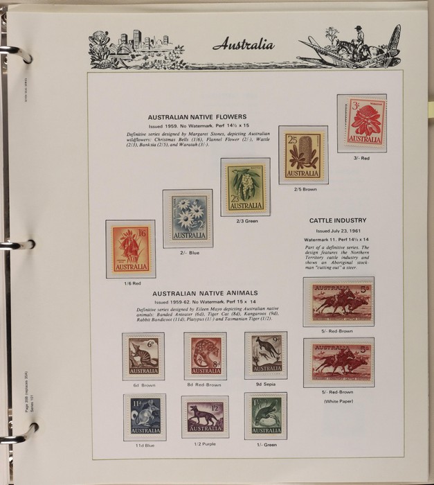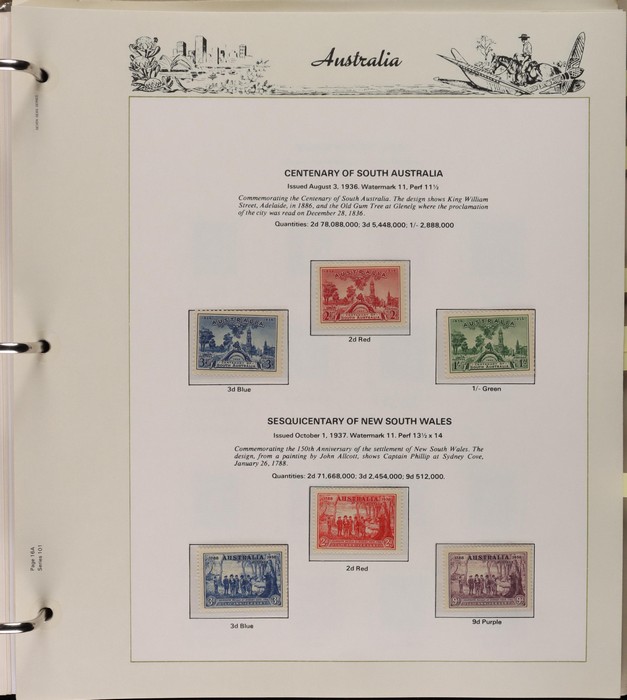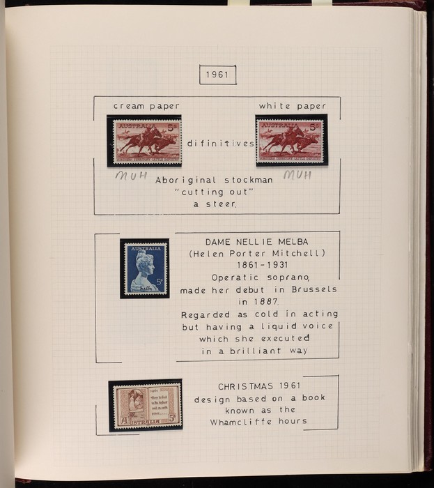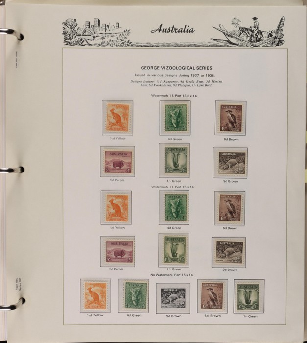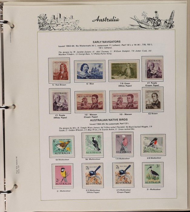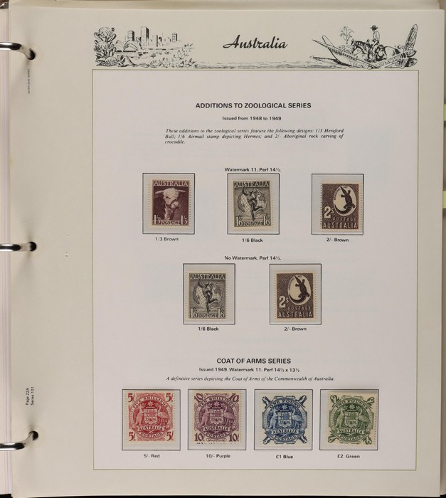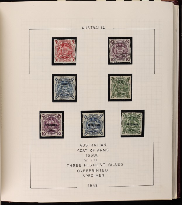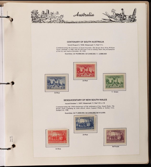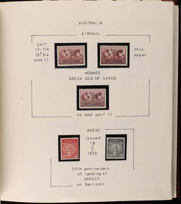 64 image1913-65 MNH/M/U collection in Seven Seas album with Kangaroos 1st wmk to 1/-, 2nd to 2/-, 3rd to 5/-, SM wmk to 2/- & CofA to 10/-, plus £1 grey Telegraph Puncture, all G-FU. KGV set of 72 inc 1d red Die II, Die II, 1d green Die I-II pr, 4½d Die II & OS opt to 5d brown F-VFU, plus perf OS near comp (51) with single wmk to 1/4, no wmk 1d & 1½d, SM wmk perf 14, 2d, 4d, 4½d & 1/4. SM wmk perf 13½x12½ (12) to 1/4, G-FU inc odd CTO (ACSC cat $1500). 1914 Kookaburra 6d Engraved CTO, 1927-30 Commems set of 6 perf OS, 1928 Kookaburra 3d M/sheet M. 1931-37 Commems & Pics F-VFU with OS opt set of 6 to 1/- Lyrebird set. 1934 VIC Cent & Macarthur sets, 1935 ANZAC 1/- & KGV SJ to 2/-, 1936 SA & 1937 NSW Sesqui set. KGVI 1937-50 near comp M inc 3d blue 'white wattles' Robes set to £1, plus 10/- opt SPECIMEN. 1940 AIF set & 1949 Arms set to £2. 1951-65 Pics, Defs & Commems comp inc 1950 KGVI Defs to 2/6, 1959-61 Pics to 5/- Cattle white paper, 1964 Navigators set of 8 to £2 & 1964 Birds to 3/-. MNH/M/U as noted, ACSC cat $6850, plus extra for £1 Kangaroo. (450) (P) (Image1) (Image2) (Image3) (Image4) (Image5) (Image6) (Image7) (Image8) (Image9) (Image10) (Image11) (Image12) (Image13) (Image14) (Image15) (Image16) (Image17) (Image18) (Image19) (Image20) (Image21) (Image22) (Image23) (Image24) (Image25) (Image26) (Image27)