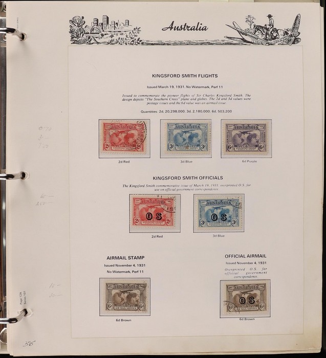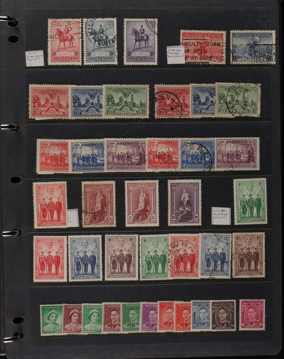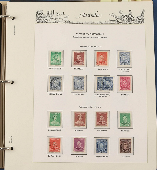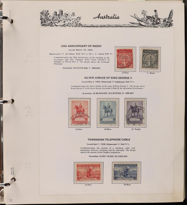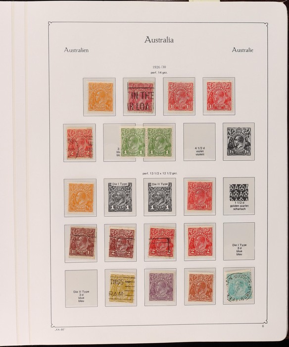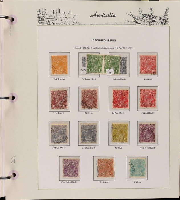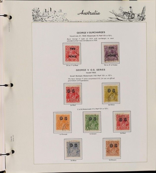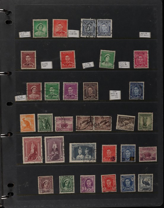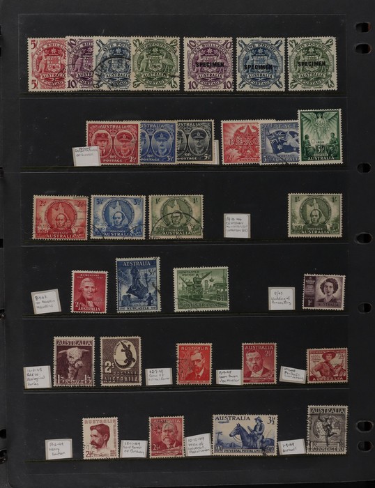 69 image1913-98 Used Collection on Seven Seas illustrated hingeless pages noted Roos (40) to 5/-, various wmks, inc few perf OS, KGV (60+) to 1/4 inc opt OS to 5d, some perf OS inc 5d chestnut since line perf rough paper, fairly comprehensive 1937-65 inc 1928 Kooka M/Sheet (sl flts) 1932 Harbour Bridge set to 5/-, 1932 Kingsford Smith set inc opt OS, 1934 Vic Cent set to 1/- both perfs, 1935 ANZAC set to 1/-, 1935 Jubilee set to 2/- 1937 Zoological set to 1/4, Robes 5/- to £1 (both papers), 1949 Arms set to £2, 1963 Navigators set to £2 (both papers), 1946 BCOF set to 5/-, few varieties. 1966-98 fairly comp. Plus 1971 Christmas blk of 25 (MNH), small selection of postage dues 1902-40s to 1/-. (2000 + 5 M/S). (P) (Image1) (Image2) (Image3) (Image4) (Image5) (Image6) (Image7) (Image8) (Image9) (Image10) (Image11)