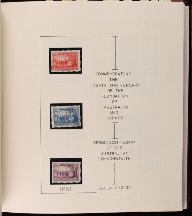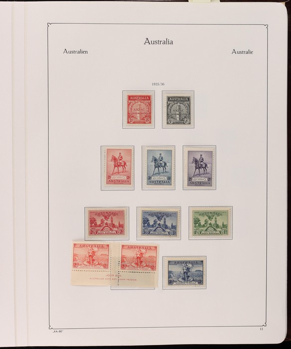 72 image1914-86 collection in hagner album with 1914 Kookaburra 6d engraved, 1931 Kingsford Smith sets M & U, 1932 Lyrebird 1/- opt OS, 1934 VIC Cent sets to 1/- (both) & Macarthur to 9d. 1935 ANZAC 1/- & 1936 Cable set Ash imprint blks of 4, cat $100, KGV Silver Jubilee set to 2/- U. 1936 SA & 1937 NSW Sesqui sets M & U. 1937 KGVI to 10/- M & Robes 5/-, 10/-, £1 VFU. 1949 Arms set to £1 FU, plus 10/-, £1, £2 opt SPECIMEN. 1940s-50s imprint blks of 4 (24) inc 1950 KGVI Defs to 2/6 Aborigine. 1952 KGVI 3½d brown, 1963 QEII 5d green & 1965 QEII 5d red 'exploded' booklets (cat $210). 1964 Navigator set to £2 & Birds to 3/-, plus decimals to mid 1980s inc Paintings to $10. Generally F-VF M/MNH/U. ACSC cat $1900. SG cat £1200 = A$2400. (970) (Image1) (Image2) (Image3) (Image4) (Image5) (Image6) (Image7) (Image8) (Image9) (Image10) (Image11) (Image12) (Image13)
