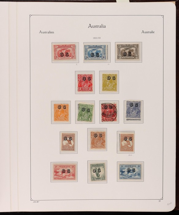 62 image1913-65 collection in KABE hingeless album, Kangaroos 1st wmk to 5d, 3rd wmk 2d to 2/-, 10/- & £2 CofA wmk opt SPECIMEN, CofA 5/- CTO, KGV to 1/4 M/MNH (25), U (24) inc SM wmk 1d Die II/I pr, CofA set to 1/4 M, 1930-36 Commemoratives inc VIC Cent, Macarthur, ANZAC, Silver Jubilee, 1937-49 Zoological series & Robes to £1 with both papers (thin paper MNH), fairly complete to 1964 Navigators 4/- to £2 with £1 both papers, OS opt 1931-33 comp, 2d CofA U, others M/MNH, the KS OS MLH (genuine opts), 1946 BCOF set to 5/- MLH, decimal pages 1966-80 but no stamps. Mainly F-VF MLH, about 5% FU. SG cat £3000+ = A$6000. ACSC cat $4500+, plus album with pages replacement retail $500. (420+) (P) (Image1) (Image2) (Image3) (Image4) (Image5) (Image6) (Image7) (Image8) (Image9) (Image10)