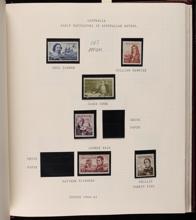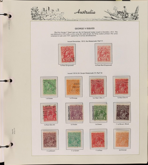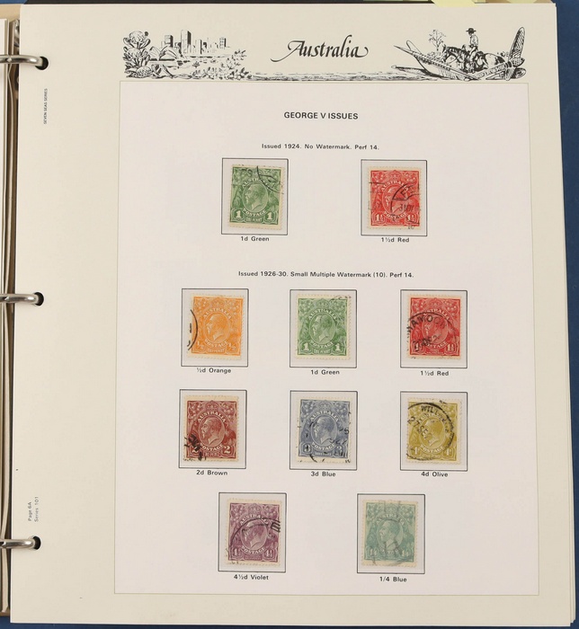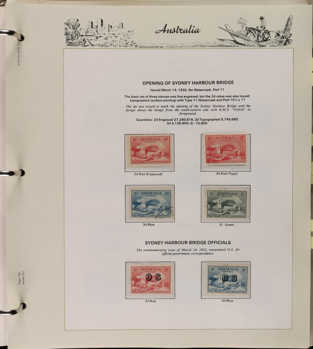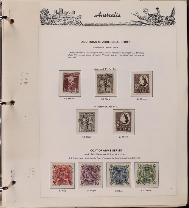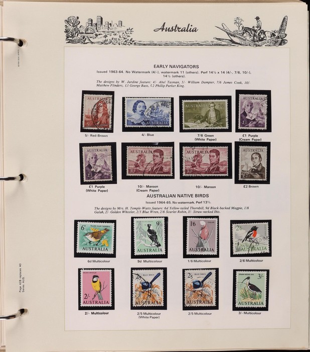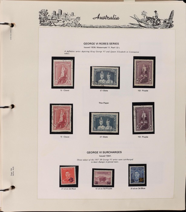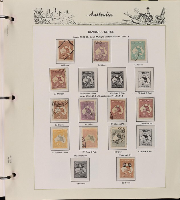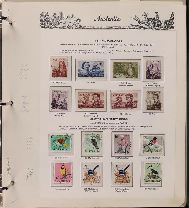 67 image1913-80s collection in Seven Seas album with illustrated hingeless pgs. Inc Kangaroos to 2/- maroon, KGV Heads to 1/4, fairly complete 1935-40 Commemorative sets complete, 1938 Robes 5/- to £1, both paper sets, 1949 Arms 5/- to £2, 1964 Navigators 4/- to £2 set with both papers, sparse in decimals, few errors in classifications. Mainly FU-VFU, about 10% F-MLH. SG cat £1350+ = A$2700. ACSC cat $2200+. Reserved at the replacement cost of the album. (400+) (Image1) (Image2) (Image3) (Image4) (Image5) (Image6) (Image7)