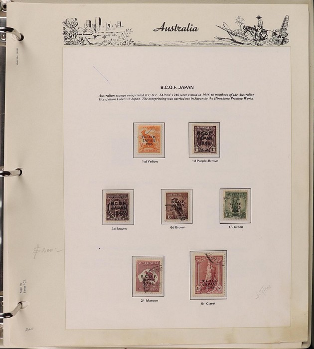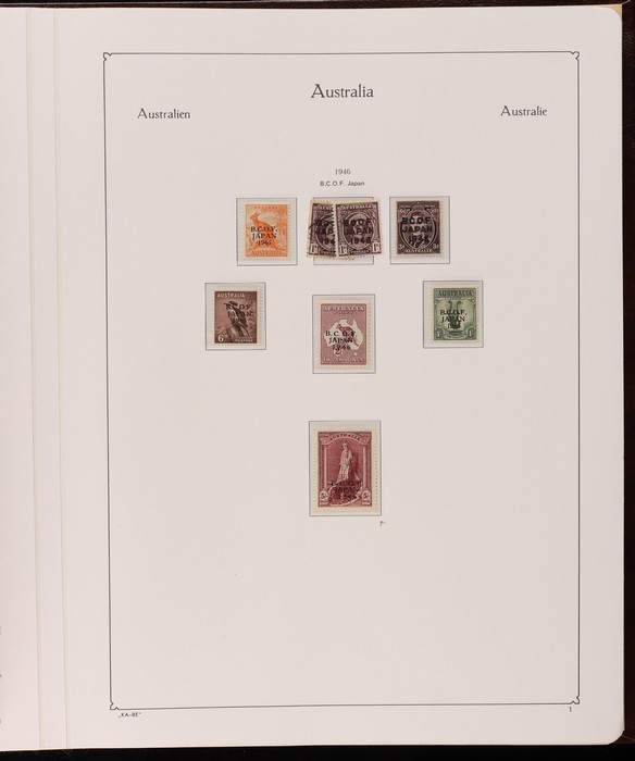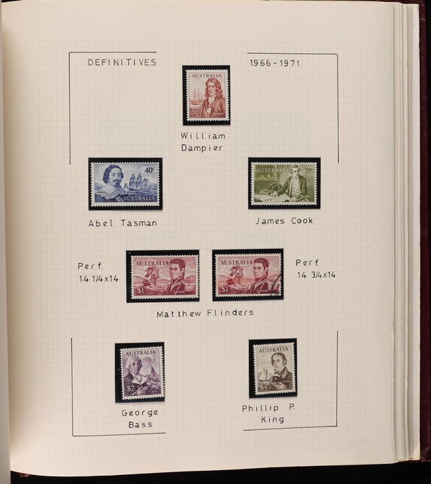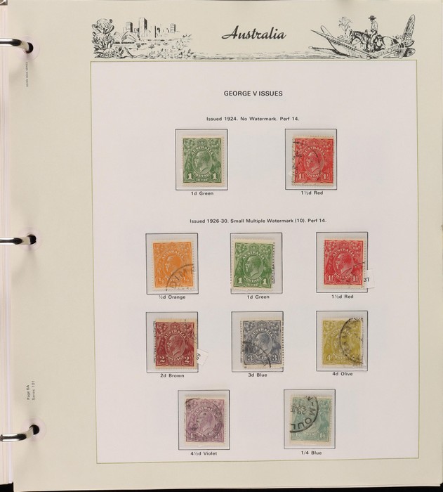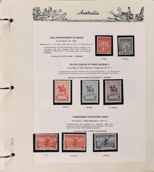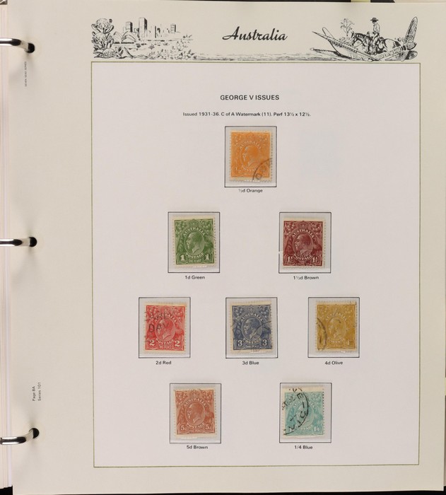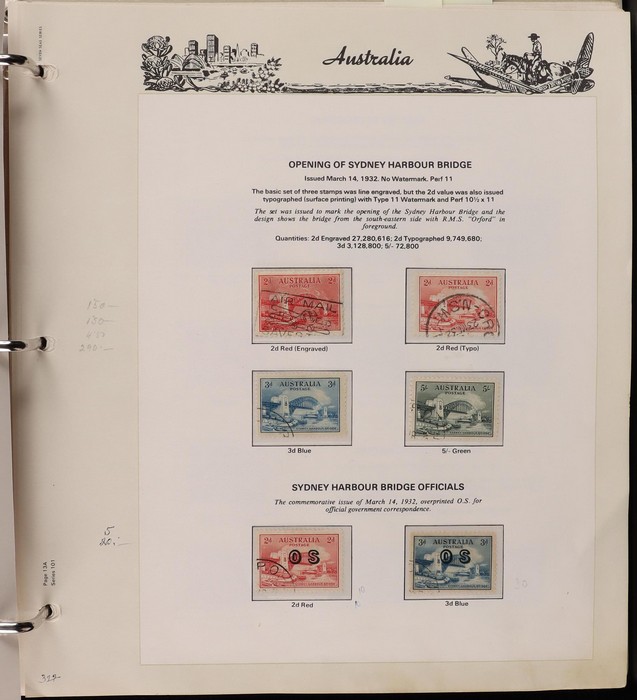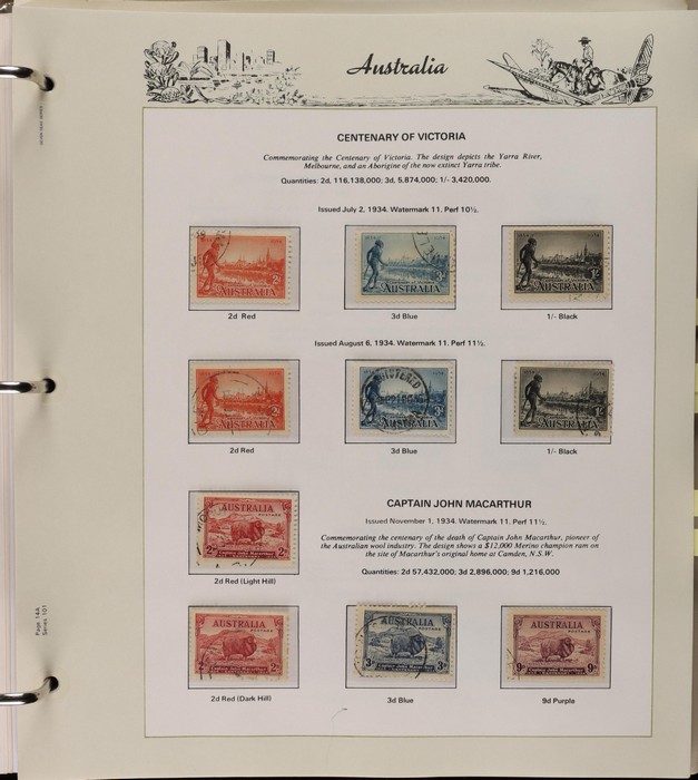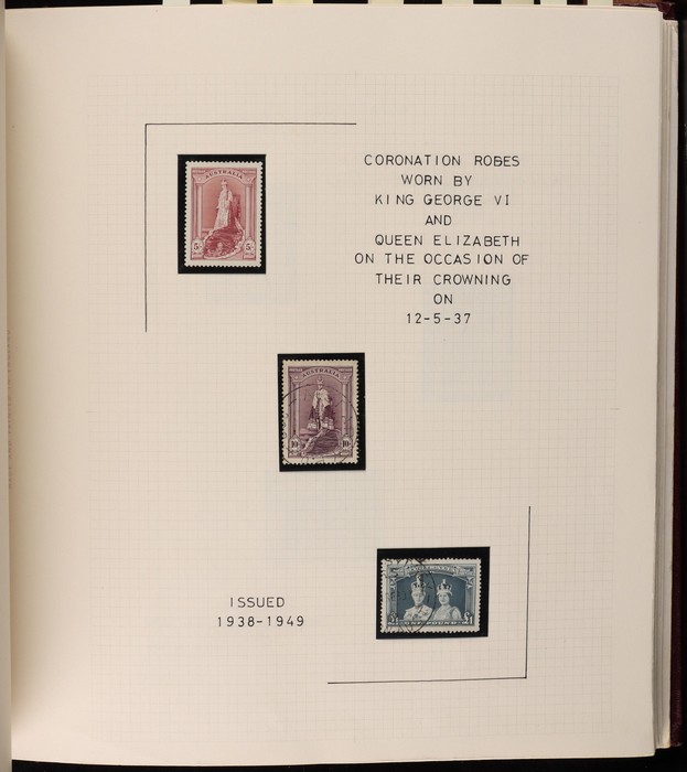 67 image1913-80s collection in Seven Seas album with illustrated hingeless pgs. Inc Kangaroos to 2/- maroon, KGV Heads to 1/4, fairly complete 1935-40 Commemorative sets complete, 1938 Robes 5/- to £1, both paper sets, 1949 Arms 5/- to £2, 1964 Navigators 4/- to £2 set with both papers, sparse in decimals, few errors in classifications. Mainly FU-VFU, about 10% F-MLH. SG cat £1350+ = A$2700. ACSC cat $2200+. Reserved at the replacement cost of the album. (400+) (Image1) (Image2) (Image3) (Image4) (Image5) (Image6) (Image7)