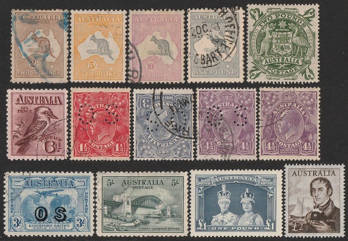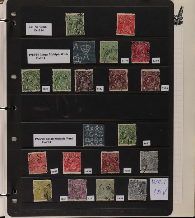 65 image1913-70 Collection on Seven Seas pages Roo's mixed wmks, 1st wmk 4d & 5d, CofA wmk 5/- & £1, noted 6d 1st wmk perf Large OS very small stamp caused by double perf, KGV various wmks to 1/4, 1914 6d engraved Kooka, 1930 Commems, 1938 Robes set to £1 thick paper, 10/- is specimen, 1949 Arms to £2, 1964 Navigators set of 6 to £1, some decimals inc 1966-71 set to $4. Postage due's various series to 5/-, some states inc Victoria 1d Half length pr on piece with cancel in pen. Mostly GU-VFU, some mixed. SG cat £1300+ = A$2600. ACSC cat $2100+. (500+). (Image1) (Image2) (Image3) (Image4)