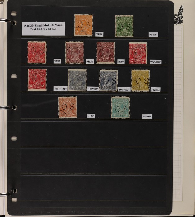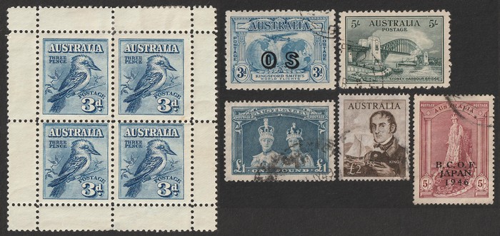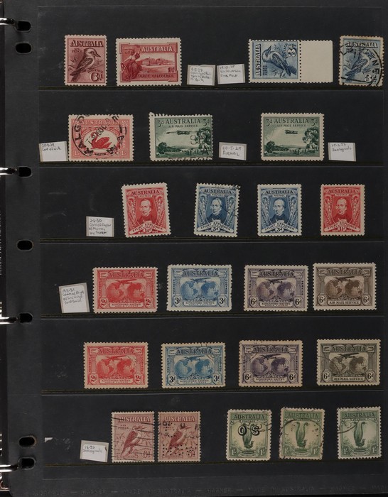 77 image1928-66 collection on hagners inc 1937 KGVI 3d blue prs - Die I, IA, II (thick & thin papers), Die III, 1949 Arms 5/- to £2 (3 sets), 10/- Arms blk of 4, 5/- Arms thin paper, 1938 10/- Robes John Ash imprint pr, range of CTO perf OS 1920s-30s inc 1928 3d blue Kookaburra, 1929 3d green Airmail (both type A & B) etc. Also 1941 KGVI 2d mauve cds late 13 FE 47 on piece. 7/6 Navigators - 2 blks of 4 CTO Melbourne, few NWPI to 5/-. GU-VFU. SG (var). ACSC cat $1200+. Interesting collection. (70+) (Image1) (Image2) (Image3) (Image4)