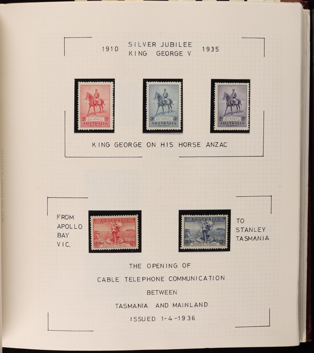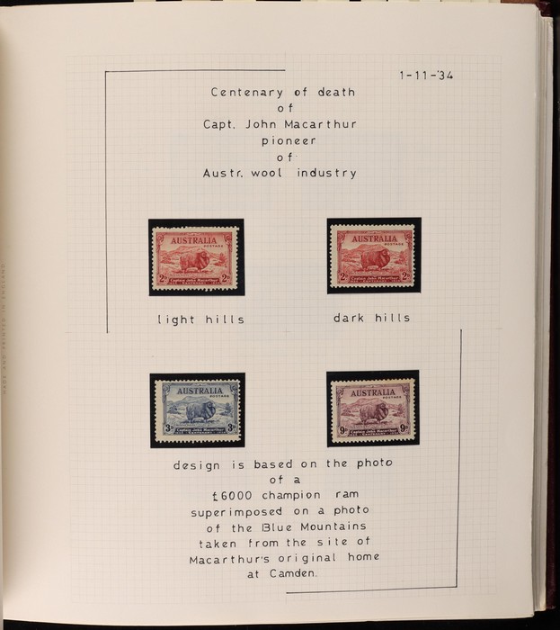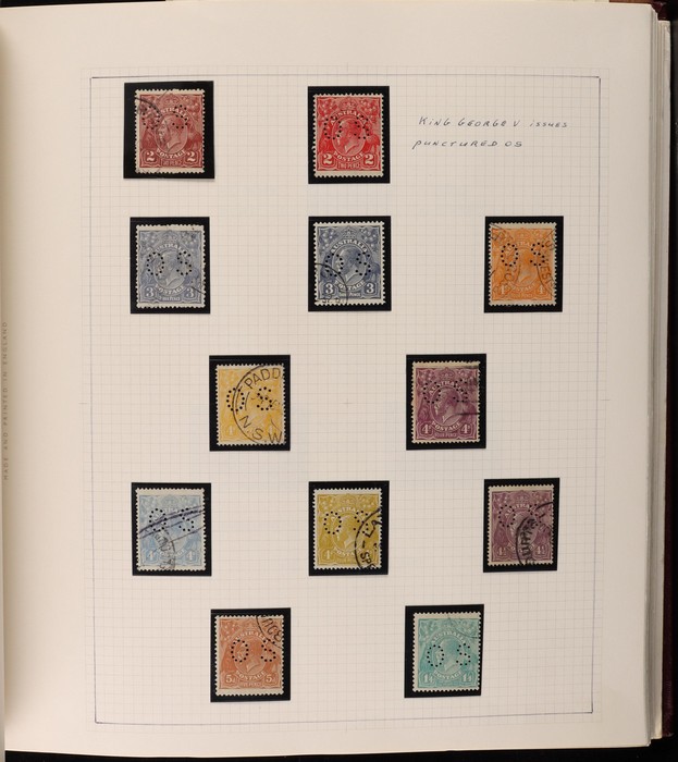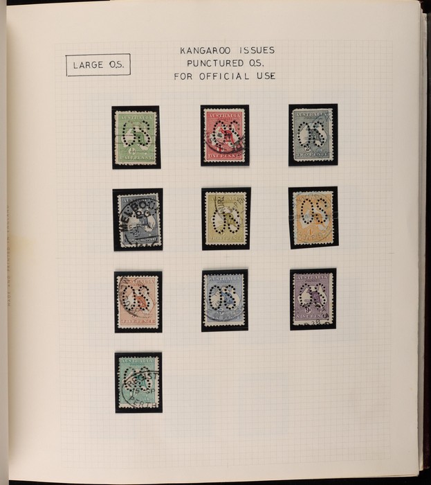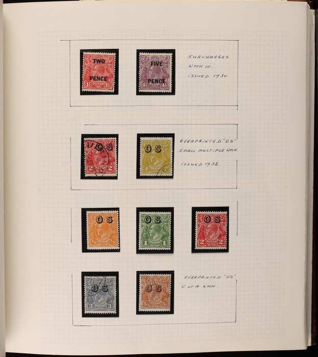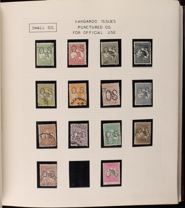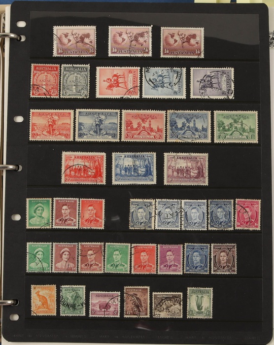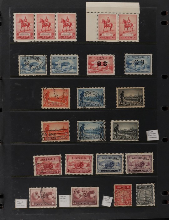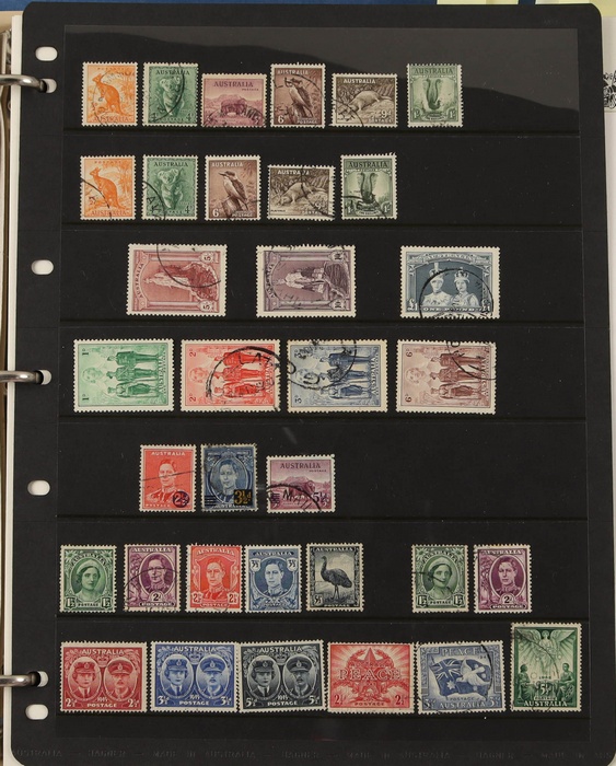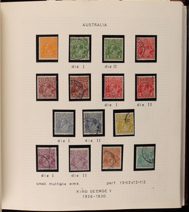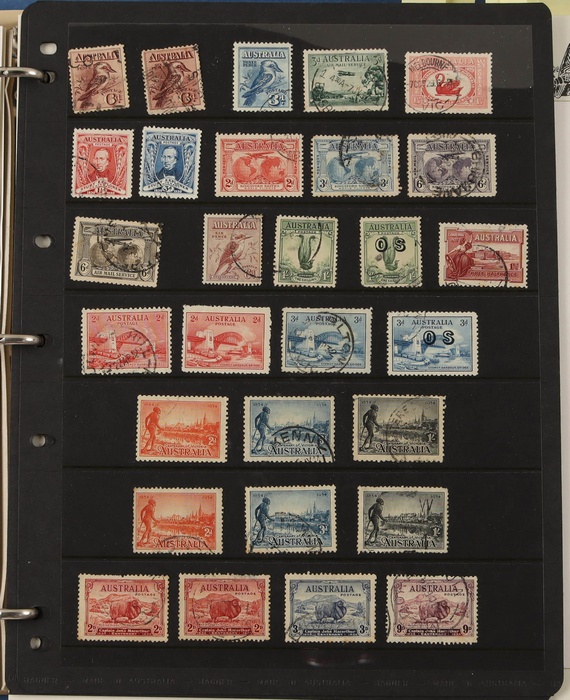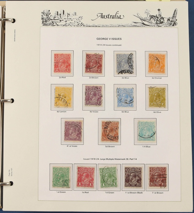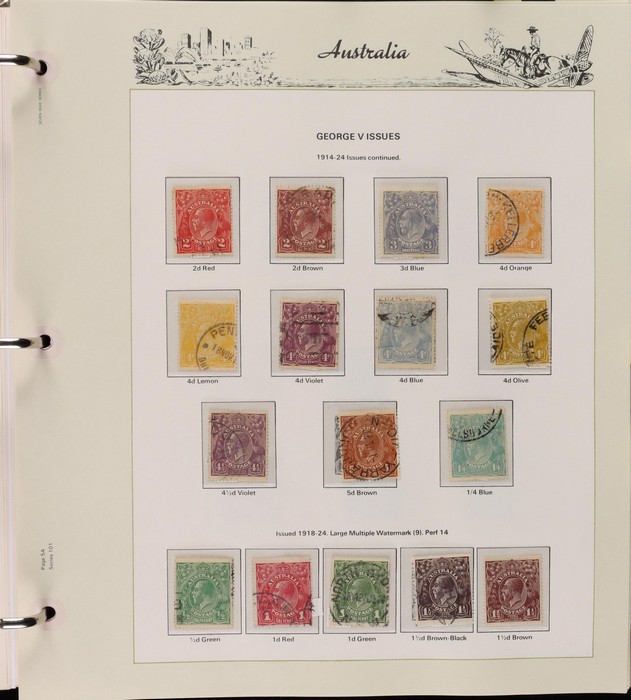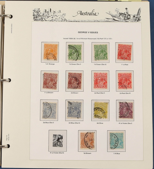 66 image1913-75 collection in SG Devon loose leaf album with Kangaroos (60) to 10/- inc 1st wmk to 1/- inc 1d, 2d, 1/- wmk inv, 2nd wmk set to 5/-, 3rd wmk to 5/- inc 2/- maroon. SM to 2/- inc 6d opt OS & CofA to 5/- inc 6d opt OS. Large OS Perfin set (ex 2½d) to 1/- cat $650. Small OS to 2/- maroon F-VFU, plus 10/- 3rd wmk CTO. All G-F/VFU, ACSC cat $3960. 1913-35 KGV set of 72 (cat $1200) inc 1d red Die III, 1d green Die II, 4½d Die II & OS opts to 5d. Also perf OS (22) to 1/4 (cat $900) inc 2d brown, 4d lemon & 4½d Die II. 1914 Kookaburra 6d Engraved. 1927-30 Commems perf OS set of 6 VFU (cat $175). 1931-37 Commem sets comp inc 1931 Kingsford Smith trio blks of 4 M/MNH & 2d, 3d opt OS. Bridge set of 6 to 5/-. KGVI appears comp inc 1937 3d blue Dies set of 6 M (cat £500) inc 'white wattles'. 1938 Robes set 5/-, 10/-, £1 M & U, 1946 BCOF opt set to 5/- UN, 1949 Arms to £2 U, plus 10/-, £1, £2 opt SPECIMEN. Comprehensive QEII Pics to 1975 inc 1959 Pics to 5/- Cattle white paper MNH, 1963-64 Navigators set of 6 & decimal mostly MNH Pics inc 1966 Defs to $4 & better early 1970s Commem sets. Mostly F-VFU/M/MNH. ACSC cat $9000. SG cat £5300 = A$10,600. (980) (Image1) (Image2) (Image3) (Image4) (Image5) (Image6) (Image7) (Image8) (Image9) (Image10) (Image11) (Image12) (Image13) (Image14) (Image15) (Image16) (Image17) (Image18) (Image19) (Image20) (Image21) (Image22) (Image23) (Image24) (Image25) (Image26) (Image27) (Image28) (Image29) (Image30)