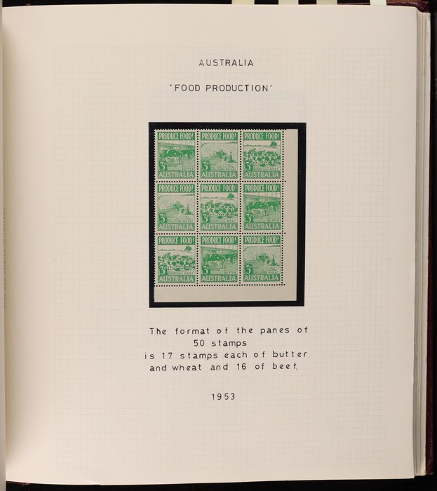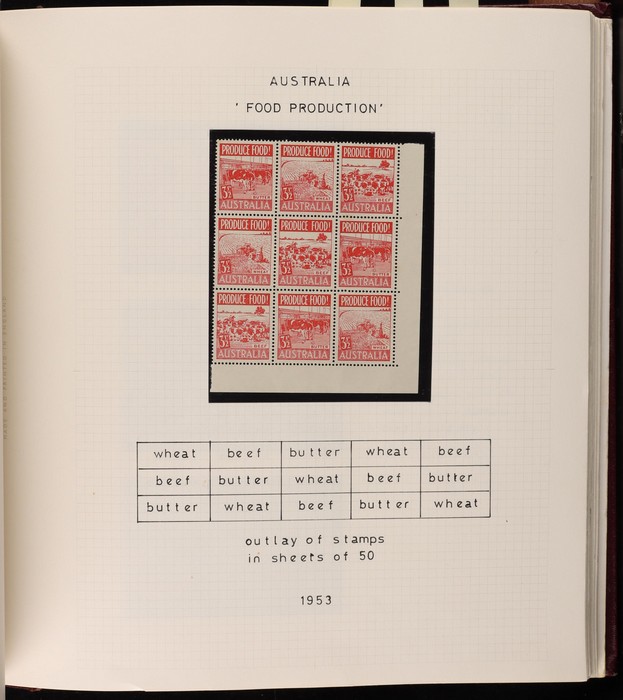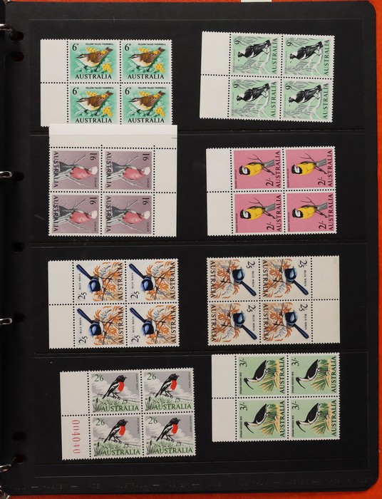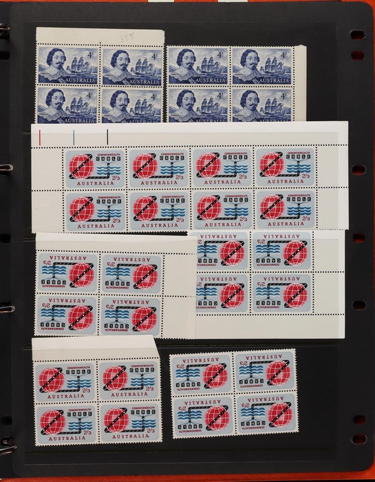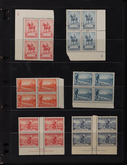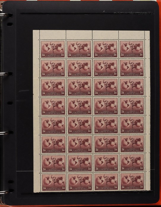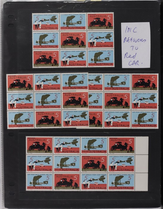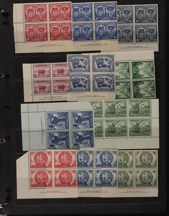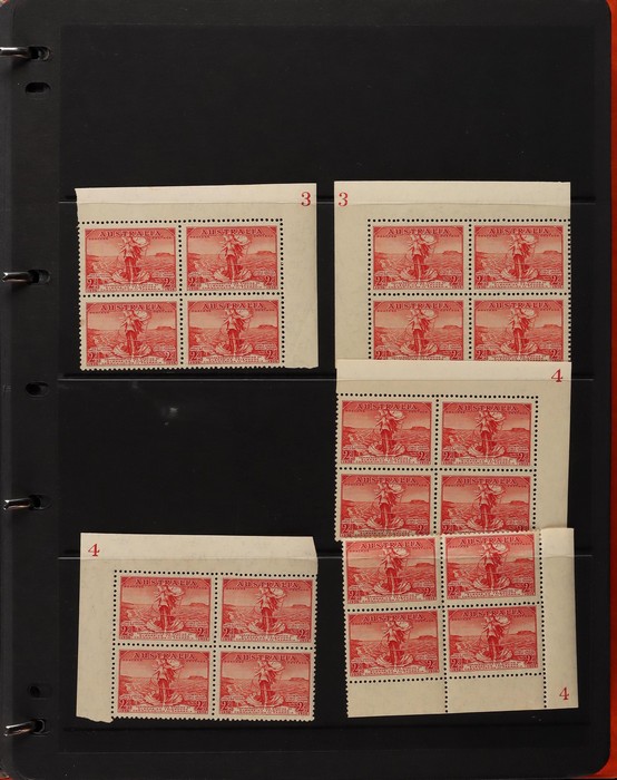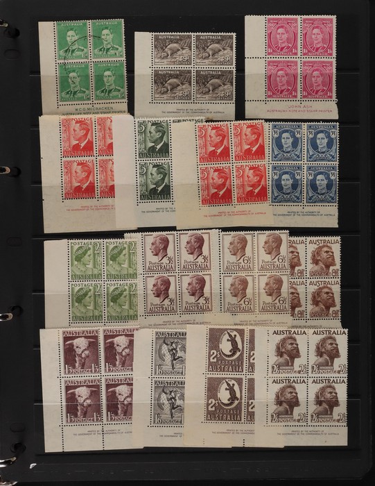 71 image1914-65 collection/accumulation on 30+ hagners. Kangaroos 1st wmk 4d, 5d & 1/-, other wmks to 1/-, KGV to 1/4 inc 1d green no wmk 'secret mark'. 1934 VIC Cent 2d, 3d imprint blks & 1/- imprint pr (gum tone). 1936 2d Cable various plate blks (13) plates 1-4. Various 1930 Commems inc 1934 1/6 Airmail no wmk. 1938 2d NSW Sesqui variety 'man with tail', 9d (2), 1936-49 Definitives ½d to 1/- inc 2d violet blk of 4, medal flaw, various imprint blks, 1938 ½d Kangaroo pr FDC, 1932-49 1/6 Hermes Airmail blk of 32 with perf pip (cat $200+), 1948 Hereford Bull blk of 30, duplicated range 1953-60s Commems in blks of 4-10 inc 2/- (107) inc Coronation, Royal Visit, 1956 Olympics, 2/- QANTAS, 1958 5½d Canberra left marginal blk of 12, 1959-66 Definitives to 5/- Cattle (2 papers). Airmails 10 sets, Flowers 9 sets, Birds 12 sets, 2/3 Commems (106) plus much more. Mainly fresh VF MNH. ACSC cat $4500+. (1100+) (Image1) (Image2) (Image3) (Image4) (Image5) (Image6) (Image7) (Image8) (Image9) (Image10) (Image11) (Image12) (Image13) (Image14) (Image15) (Image16) (Image17)