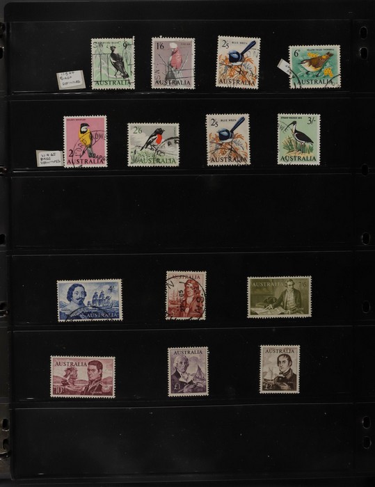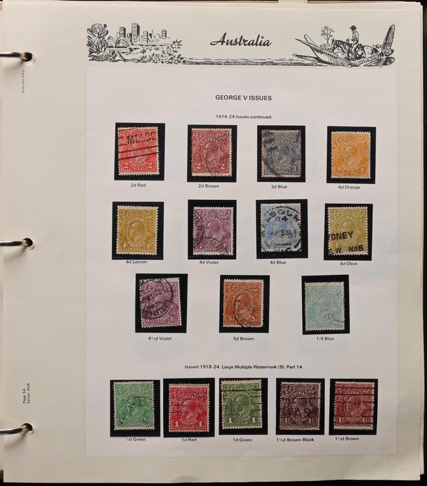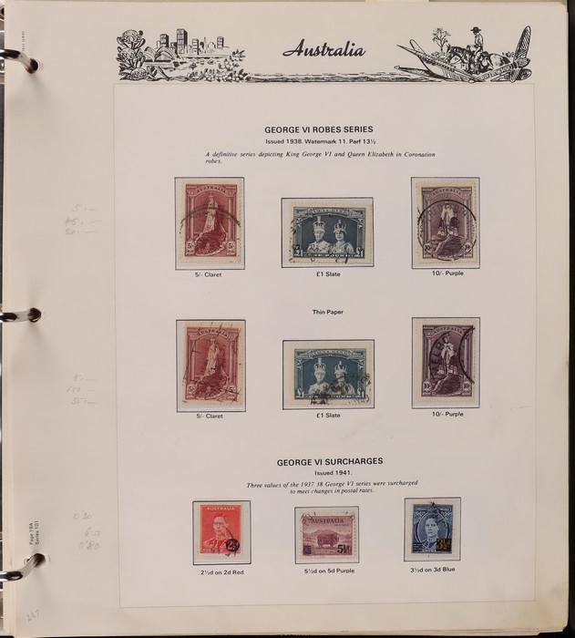 63 image1913-65 Used Collection on Seven Seas illustrated hingeless album. Roo's 1st wmk to 5/- (5/- is CTO), 3rd wmk to 5/-, 1st wmk Large OS to 1/-, small OS mixed wmks to 10/- (3rd), KGV single wmk completed to 1/4, small multi perf 14 complete to 1/4, CofA completed t 1/4, various commem sets complete inc 1931 Kingsford Smith set, 1934 Macarthur set, 1935 ANZAC & 1935 Silver Jubilee sets, 1936 South Australia Centenary, 1937 NSW Sesqui set, 1937 Zoological series, mainly complete to £1 thick paper, 1949 Arms set to £2, fairly complete to 1965, 1963 Navigators set to £2 with both papers. GU-VFU. SG cat £3000=A$6000. ACSC cat $5600. (400+). (Image1) (Image2) (Image3) (Image4) (Image5) (Image6) (Image7) (Image8)