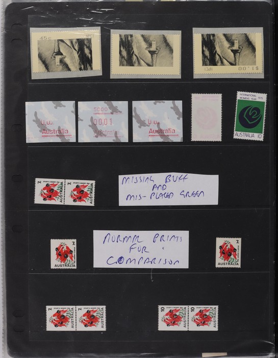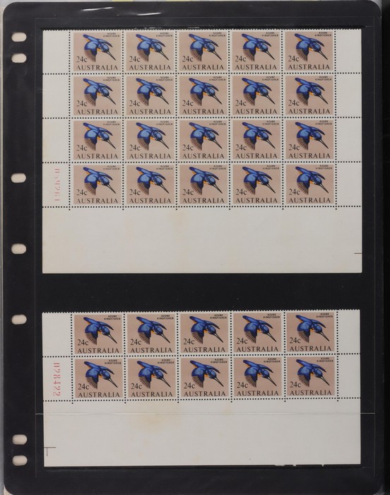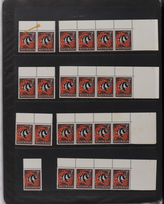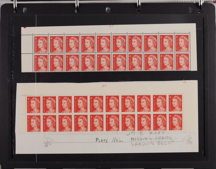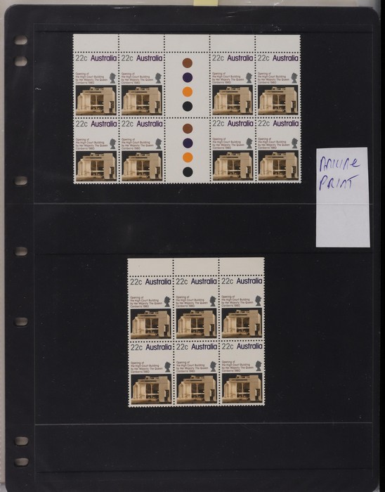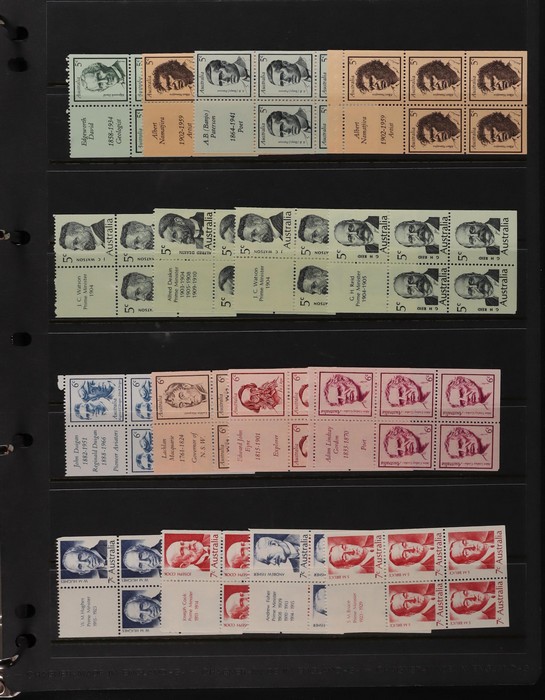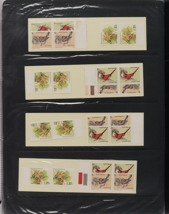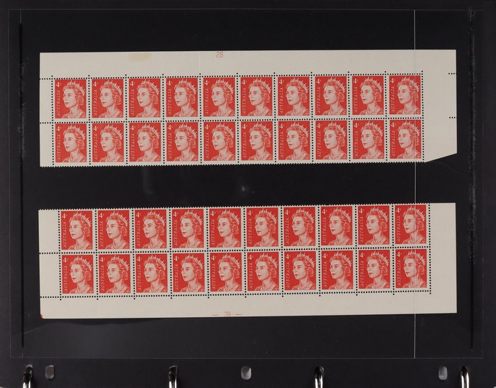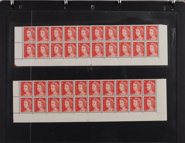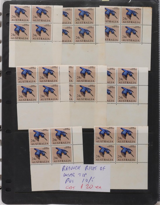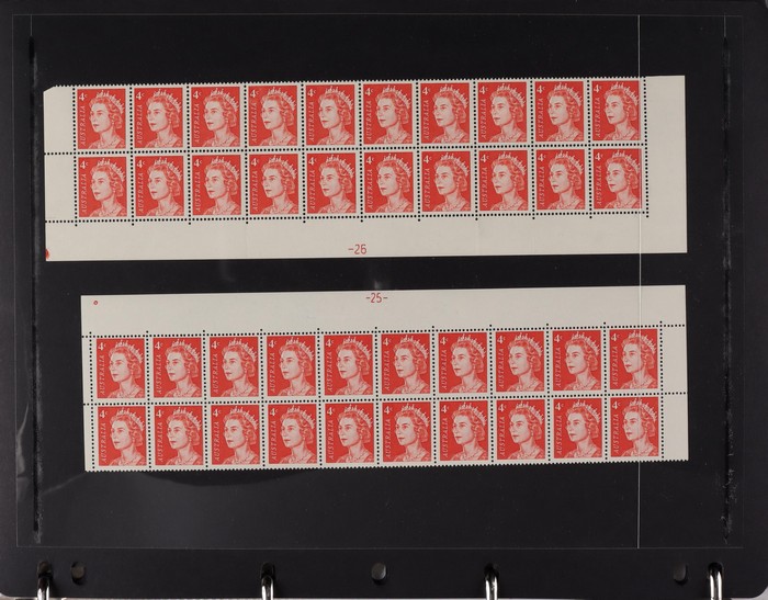 81 image1966-1986 semi-specialised collection in hagners inc 1966 Crab photographic design essays (2), QEII 4c Plate num blks of 20 (19, cat $570), 7c Humbug Fish with variety 'Retouch at UL cnr (pos LP 7/10) in UR cnr strips of 4 (4), 8c Coral Fish autotron & sheet num multiples, 24c Bird ACSC listed variety 'retouch right of wing tip (pos 10/5) cnr blks of 4 (8, ACSC cat $160). 1967-1970 constant plated varieties in prs & singles with many listed in ACSC. 1969 Flight blks of 9 (6) inc 3 diff retouches (cat $150), 1971 Coil 7c Sturt's Desert Pea, Error 'missing buff & misplaced green vert pr MNH (ACSC 536ce cat $600). 1971-75 Coil Wrappers (14, variable condition cat $25ea, $350). 1974 Newspaper 7c study inc 'Cigar' varieties. 1970s booklets inc 1979 80c Little Grebe miscut cover with split Aust Post logo & NSW Football booklets for Bexley, Parramatta & Rockdale (retail $700). 1980 22c High Court aniline print gutter blk of 8 (cat $280). 1993 Counter printed stamps 'Painting with Candlestick' UNISSUED Design trials in black with 45c, $1. NVI set of 3(retail $300). 1996 Indonesia Joint issue Cuscus booklets (2, cat $100 ea) plus others mostly MNH with some M/U or CTO sighted. ACSC cat/retail $4200 plus 2000 Olympics set of 53 individual 45c Portraits plus imperf tab proofs, retail $60. (1350). (Image1) (Image2) (Image3) (Image4) (Image5) (Image6) (Image7) (Image8) (Image9) (Image10) (Image11) (Image12) (Image13) (Image14) (Image15) (Image16) (Image17) (Image18) (Image19) (Image20) (Image21) (Image22) (Image23) (Image24) (Image25) (Image26) (Image27)