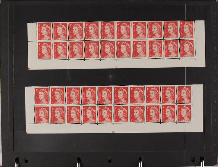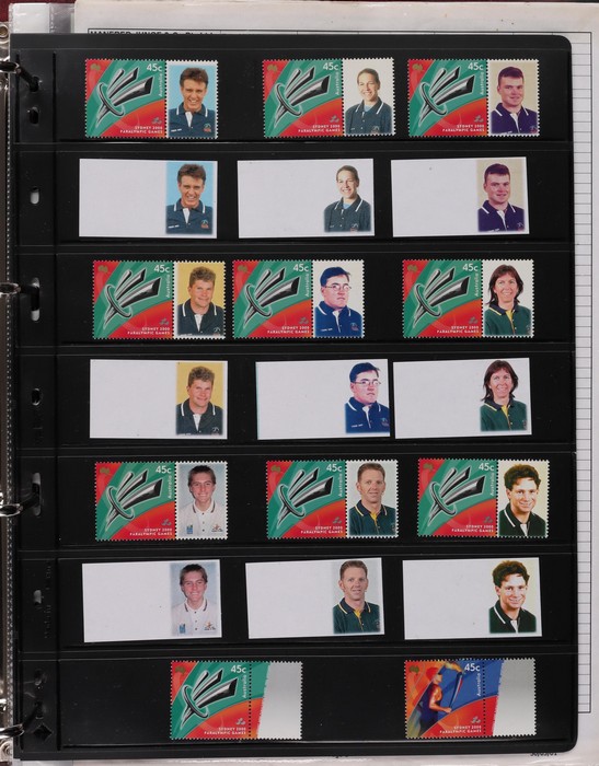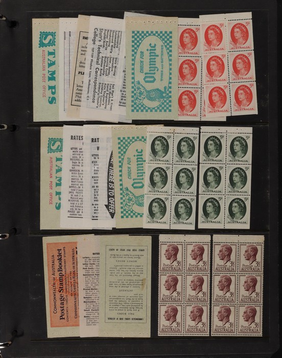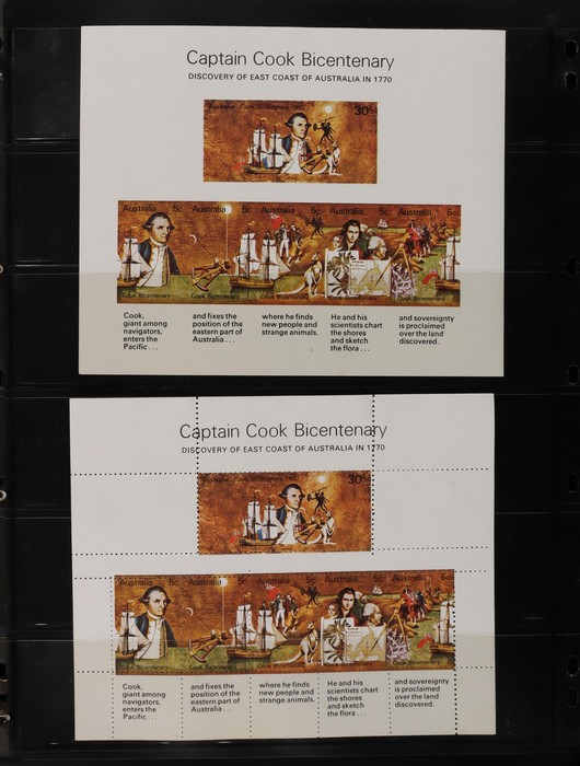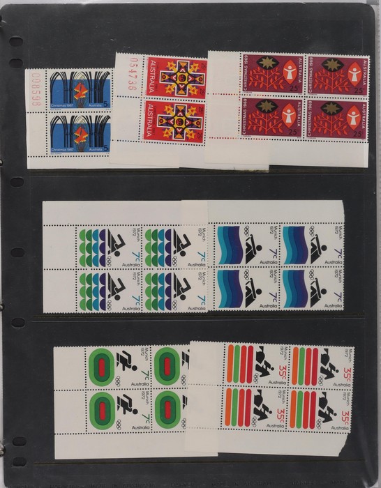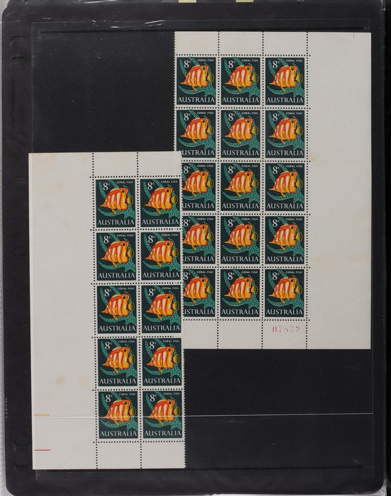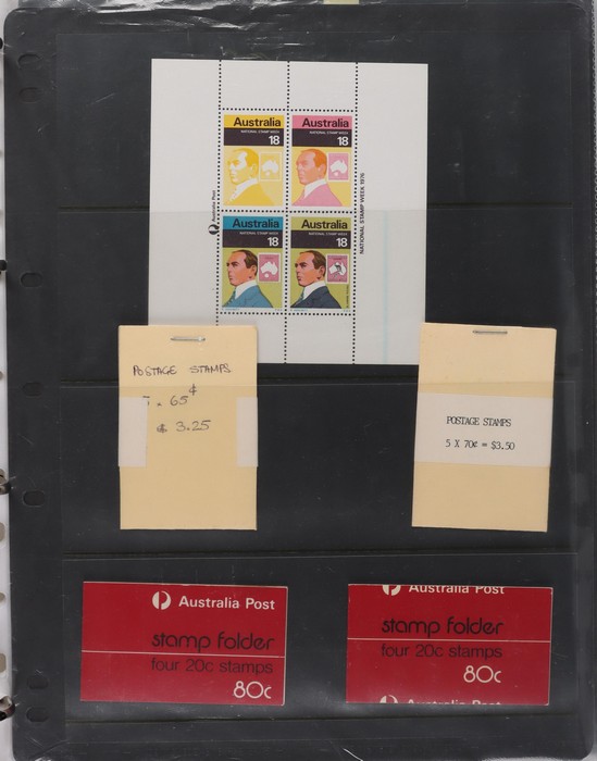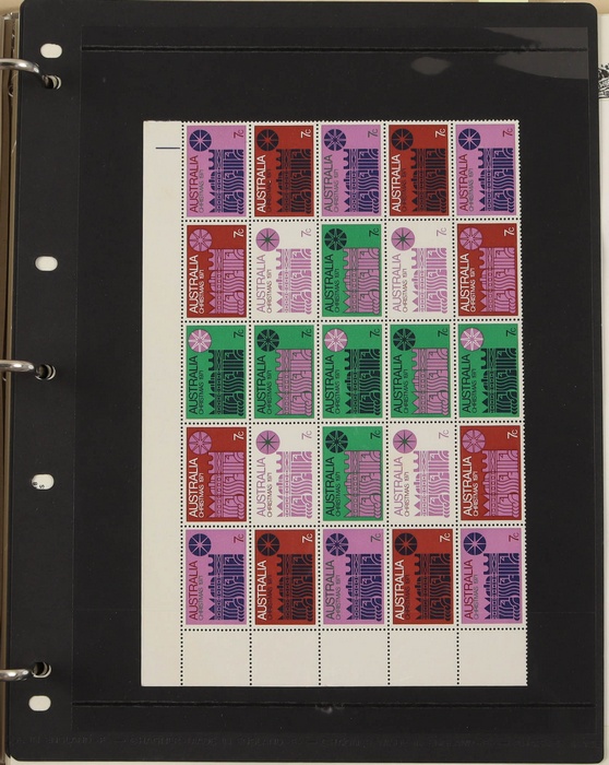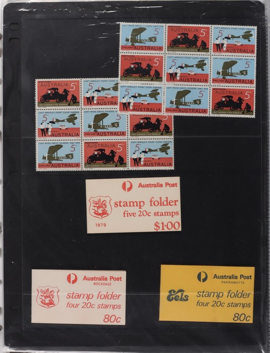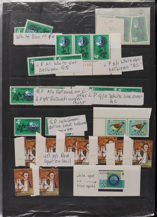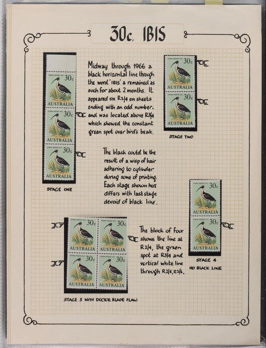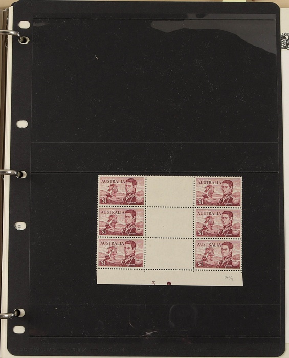81 image1966-1986 semi-specialised collection in hagners inc 1966 Crab photographic design essays (2), QEII 4c Plate num blks of 20 (19, cat $570), 7c Humbug Fish with variety 'Retouch at UL cnr (pos LP 7/10) in UR cnr strips of 4 (4), 8c Coral Fish autotron & sheet num multiples, 24c Bird ACSC listed variety 'retouch right of wing tip (pos 10/5) cnr blks of 4 (8, ACSC cat $160). 1967-1970 constant plated varieties in prs & singles with many listed in ACSC. 1969 Flight blks of 9 (6) inc 3 diff retouches (cat $150), 1971 Coil 7c Sturt's Desert Pea, Error 'missing buff & misplaced green vert pr MNH (ACSC 536ce cat $600). 1971-75 Coil Wrappers (14, variable condition cat $25ea, $350). 1974 Newspaper 7c study inc 'Cigar' varieties. 1970s booklets inc 1979 80c Little Grebe miscut cover with split Aust Post logo & NSW Football booklets for Bexley, Parramatta & Rockdale (retail $700). 1980 22c High Court aniline print gutter blk of 8 (cat $280). 1993 Counter printed stamps 'Painting with Candlestick' UNISSUED Design trials in black with 45c, $1. NVI set of 3(retail $300). 1996 Indonesia Joint issue Cuscus booklets (2, cat $100 ea) plus others mostly MNH with some M/U or CTO sighted. ACSC cat/retail $4200 plus 2000 Olympics set of 53 individual 45c Portraits plus imperf tab proofs, retail $60. (1350). (Image1) (Image2) (Image3) (Image4) (Image5) (Image6) (Image7) (Image8) (Image9) (Image10) (Image11) (Image12) (Image13) (Image14) (Image15) (Image16) (Image17) (Image18) (Image19) (Image20) (Image21) (Image22) (Image23) (Image24) (Image25) (Image26) (Image27)