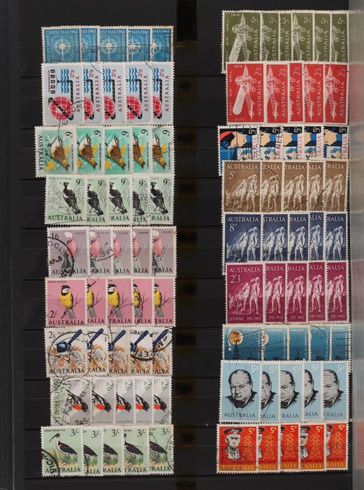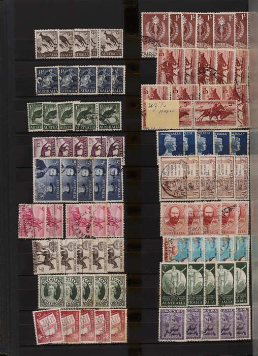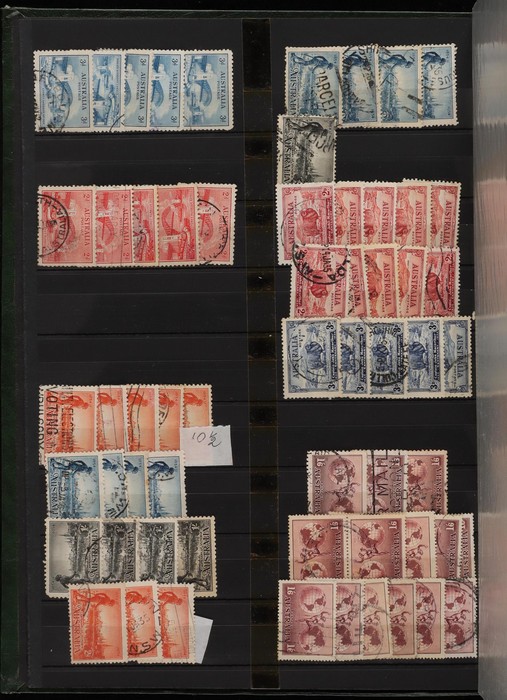 76 image1927-90 extensive ex dealer back-up stock in massive 64pg s/book inc 1928 Kookaburra 3d (10) inc perf OS (5), 1929 Airmail 3d green (10) inc perf OS (5). 1931 Kingsford Smith sets (4) to 6d brown Airmail, 1934 VIC Cent sets to 1/- (5), 1935 ANZAC 1/-, 1936 SA sets (5) & 1937 NSW to 9d (5). 1930s 3d blue Commems (25). 1937 KGVI Robes 5/- (10), 10/- (2) & £1 (2), plus 10/- opt SPECIMEN. 1940 AIF sets to 6d (4). 1949 Arms set to £2 (3), 1950s 2/- Commems (40) inc comp sets. 1959 Cattle 5/- (10). 1964 Navigators sets to £1 (2), plus extra 7/6 (2) & £2 King. 1960s 2/3 Commem (30). Extensive decimals (4000+) to 1989 inc comp collection inc 1970s Paintings to $10. Generally F-VFU, some mostly light tropicalisation. ACSC cat $3300. SG cat £1900 = A$3800. (5200+) (Image1) (Image2) (Image3) (Image4) (Image5) (Image6) (Image7) (Image8) (Image9) (Image10) (Image11)
