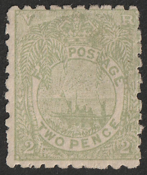 2d green, perf 12½x10. VF M, tiny thin. Scott 41g cat US$800 for used. SG 49a cat £850 for used, unpriced mint & would be est £1700 - £2550 as such. Major rarity in mint condition being the only recorded example. 2015 BPA