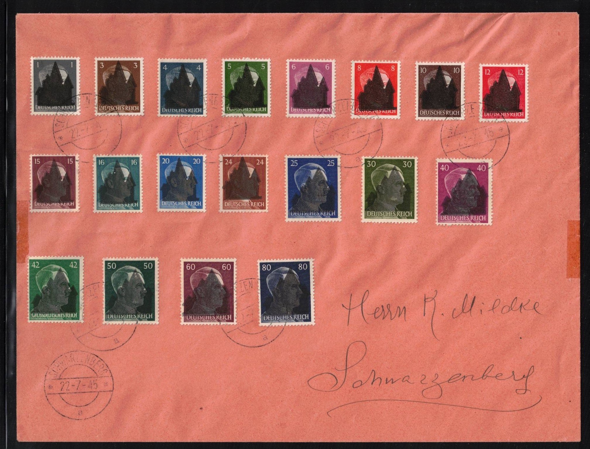 Germany - Schwarzenberg Cover, Michel #1.I-19.I, 1945 - Allied occupation (Soviet Zone- State of Saxony) Schwarzenberg with Michel 1.I-19.I (19 different) tied to large cover by Schwarzenberg July 22, 1945 cancels. Favored