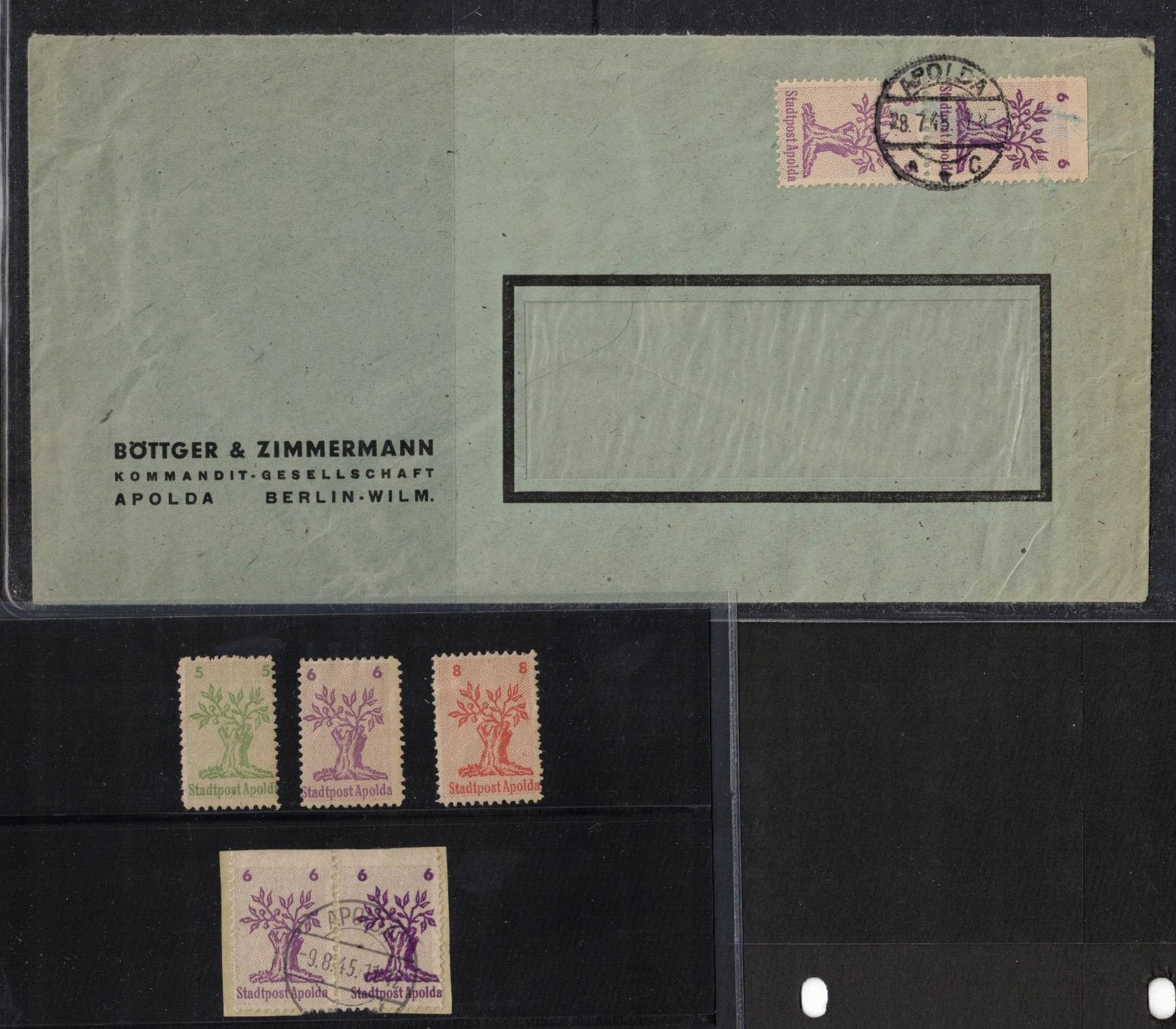 Germany Apolda Local Post Stamps and Cover - Michel 1-3 Mint with hinge remnants, Michel 2 used pair tied to piece, and Michel 2 pair tied to window cover. All opened at top. Fine. Michel €290 (Est $90-120) (Image)