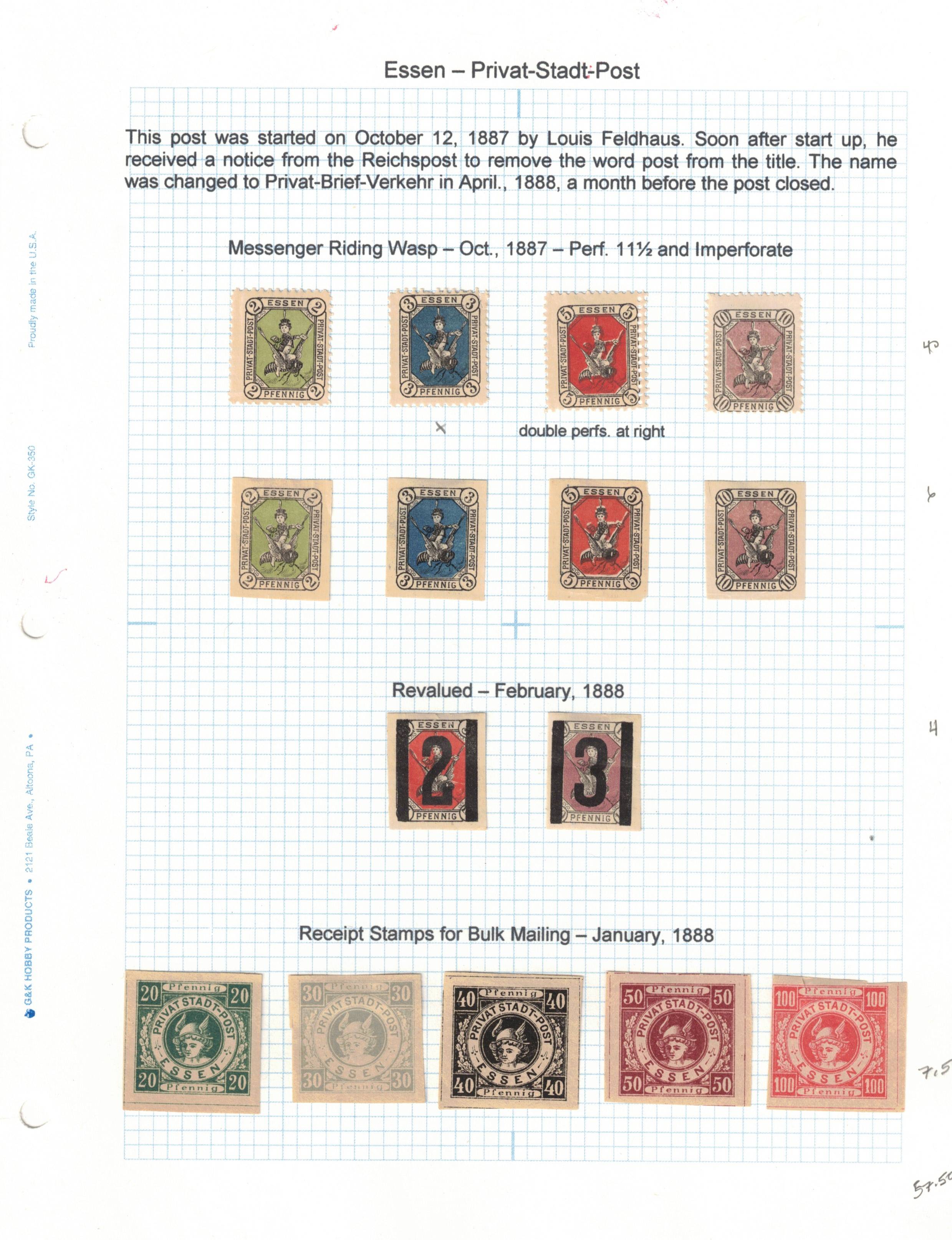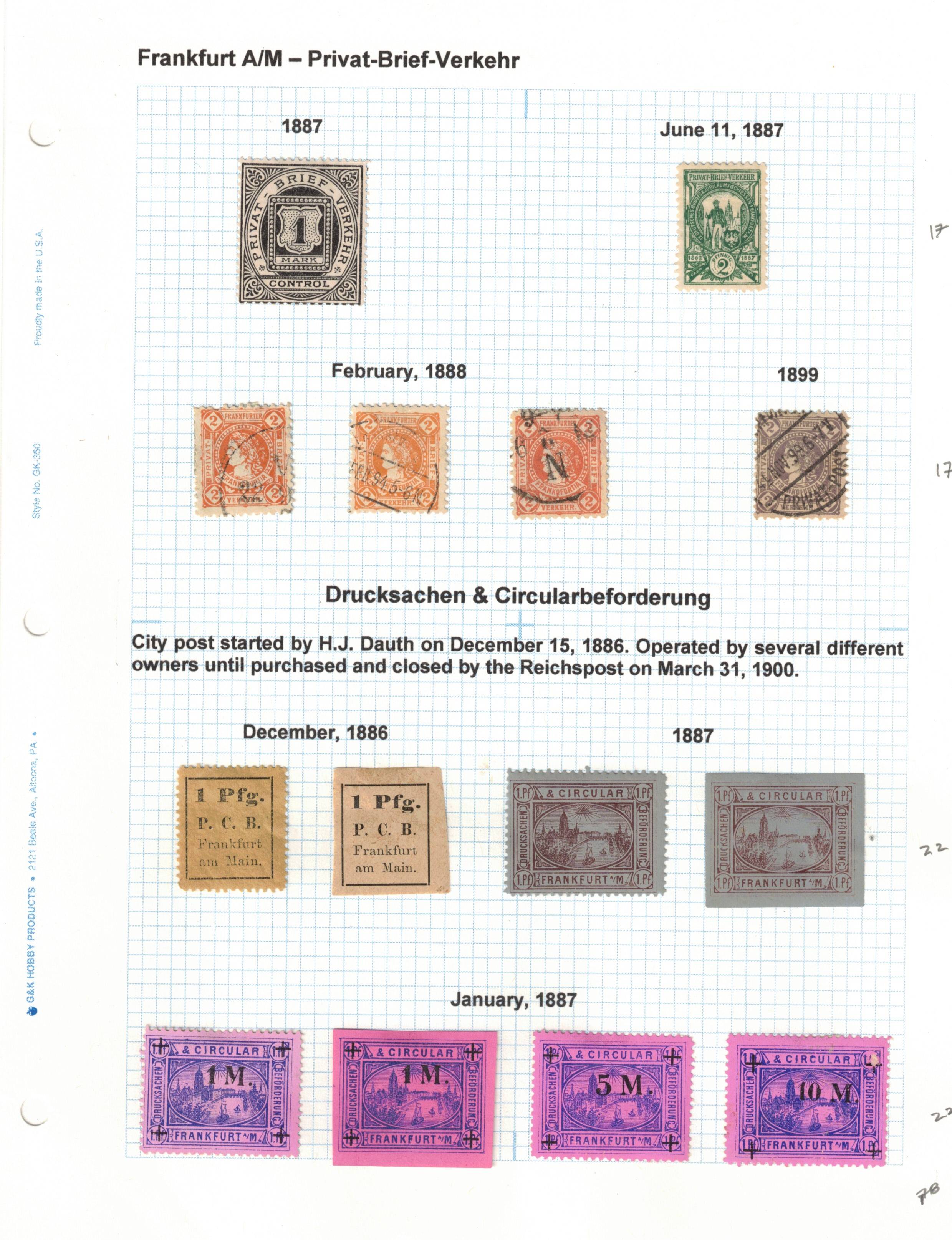 Essen, Frankfurt, and Giessen Locals Stamp Collection, 1880's - 3 different local post collection of around 130+ mostly unused stamps and a postal card. Value is pretty much equally divided. Neatly hinge mounted and annotated