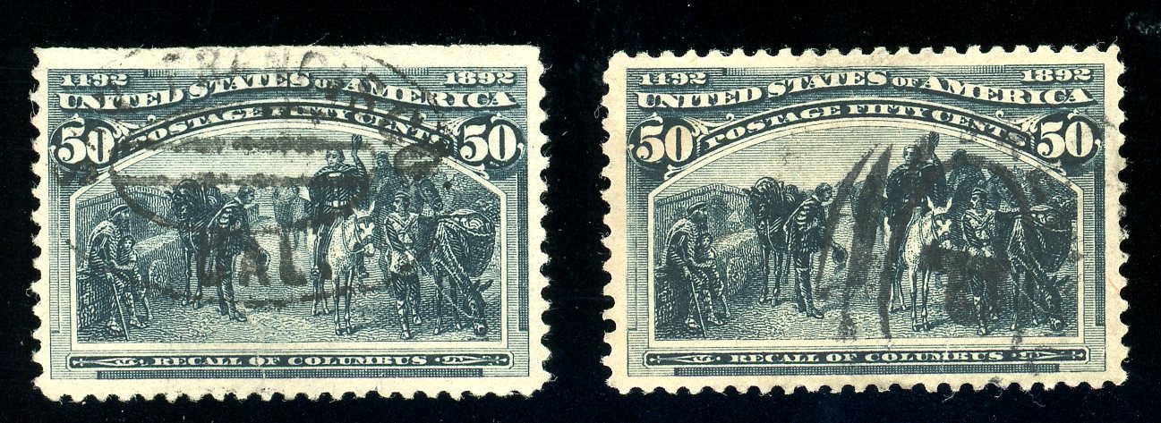 USA Scott 240 Used (x2), 50¢ Columbian, with Faults - Two well centered stamps but both with tears at bottom. One has a straight at top.Nice appearing fillers! (SCV $400) (Image)