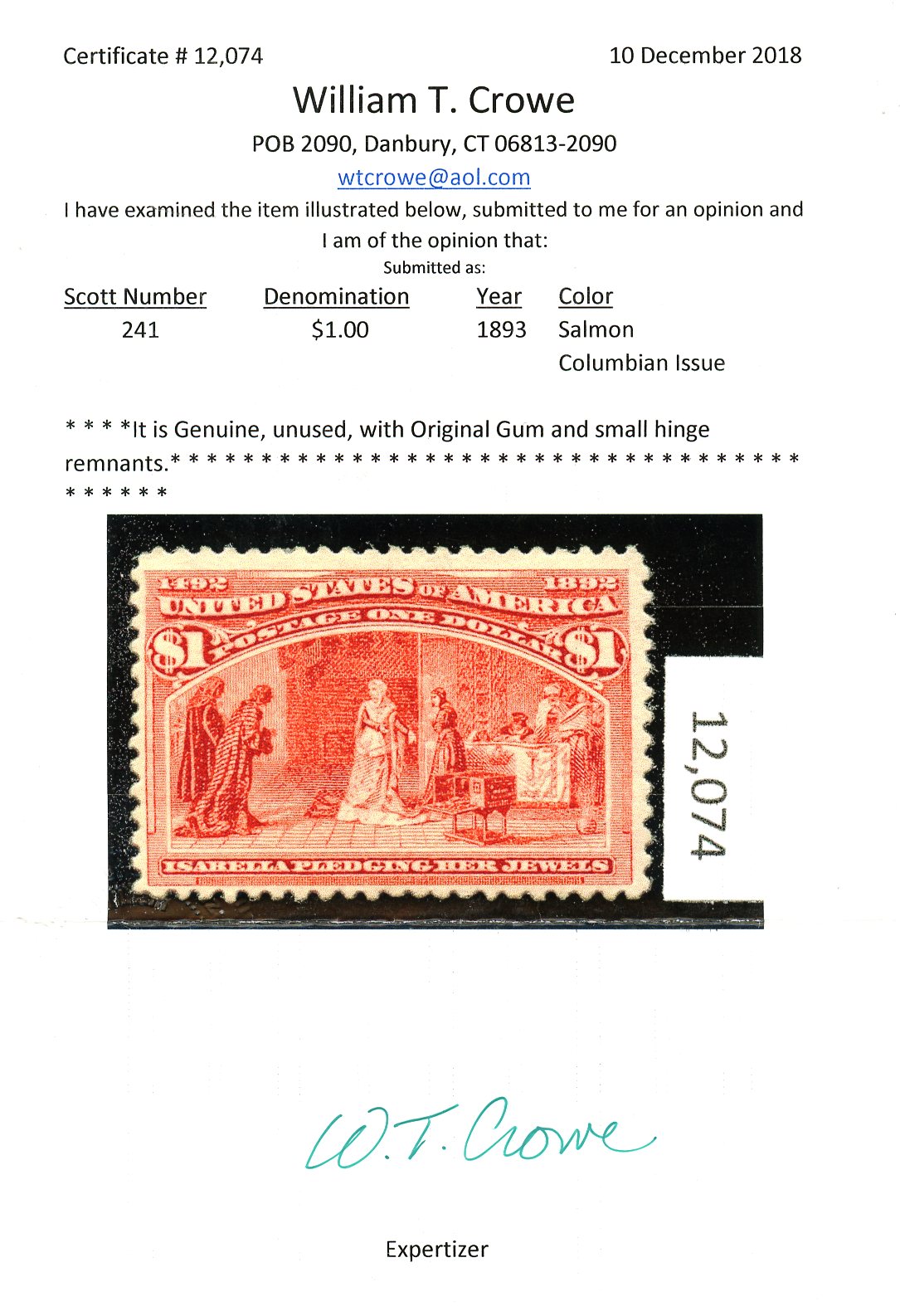 USA Scott 241 MH F-VF, $1 Columbian with 2018 Crowe Cert - Certificate states o.g. and small hinge remnants. F-VF centering. Nice color! (SCV $1000) (Image) (Image2)