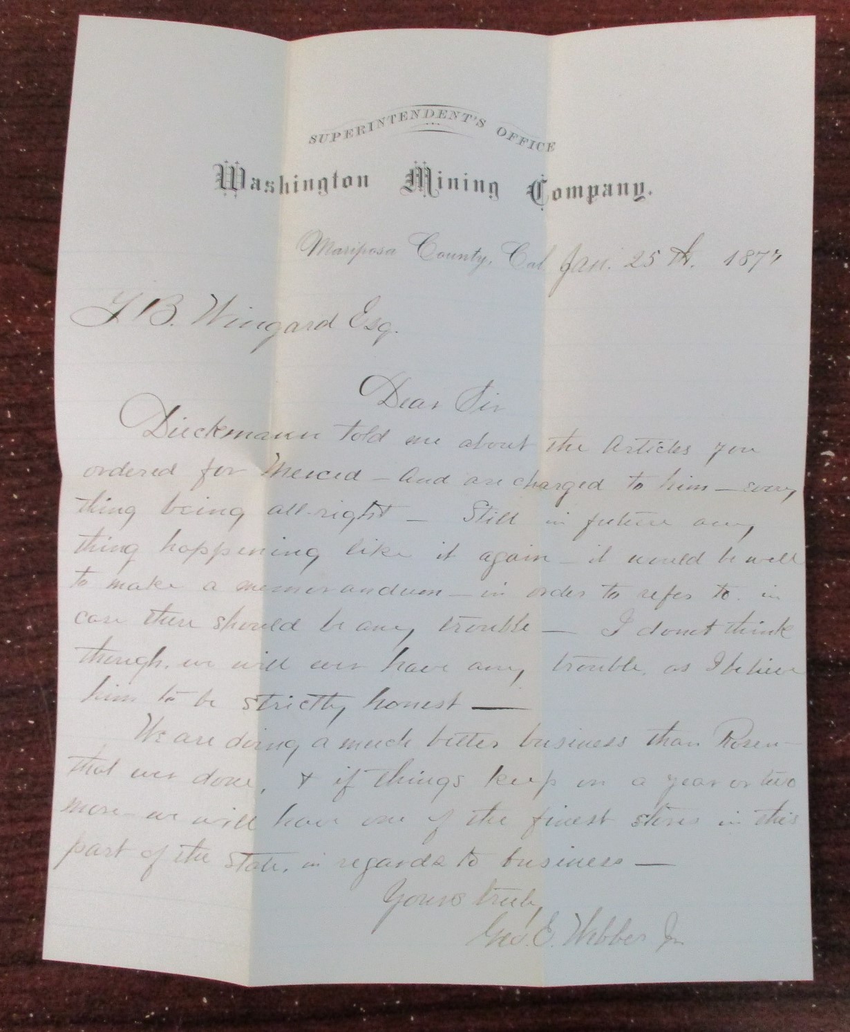 CAL." Dated Jan 25th 1877. Cover has soiling and opened on both ends and top. (Est $40-60) (Image) (Image2)