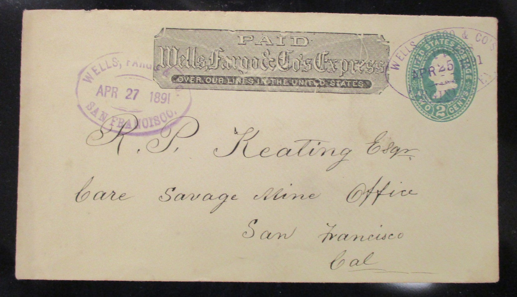 Wells Fargo Cover - Scott U312, "VIRGINIA NEV" 1891 Cancel - Cover with violet oval type 16-2 "VIRGINIA NEV" handstamp cancel and violet oval type 17-13 "SAN FRANCISCO" receiving cancel. VF condition. (Est $40-60) (Image)