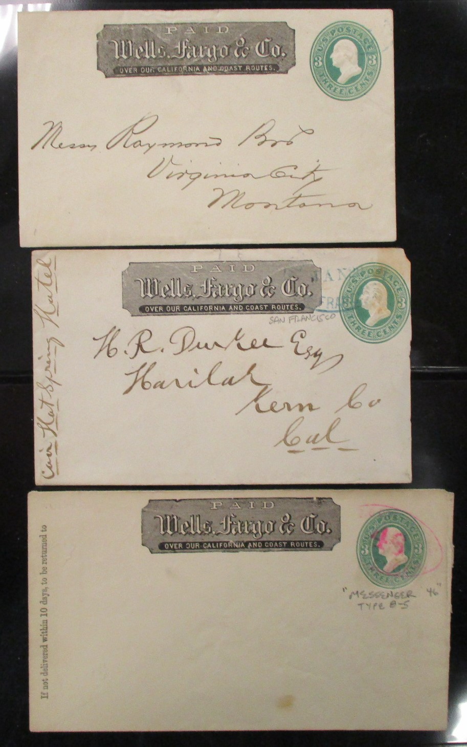 Wells Fargo Cover Lot - 6 Different , Scott U82 (3) and U163 (3) group of 6 Wells Fargo and Co. covers. Includes red Type 8-5 "Messenger 46", and unlisted blue type 11-11 "Truckee", and 3 type 11-9 with Portland", "San