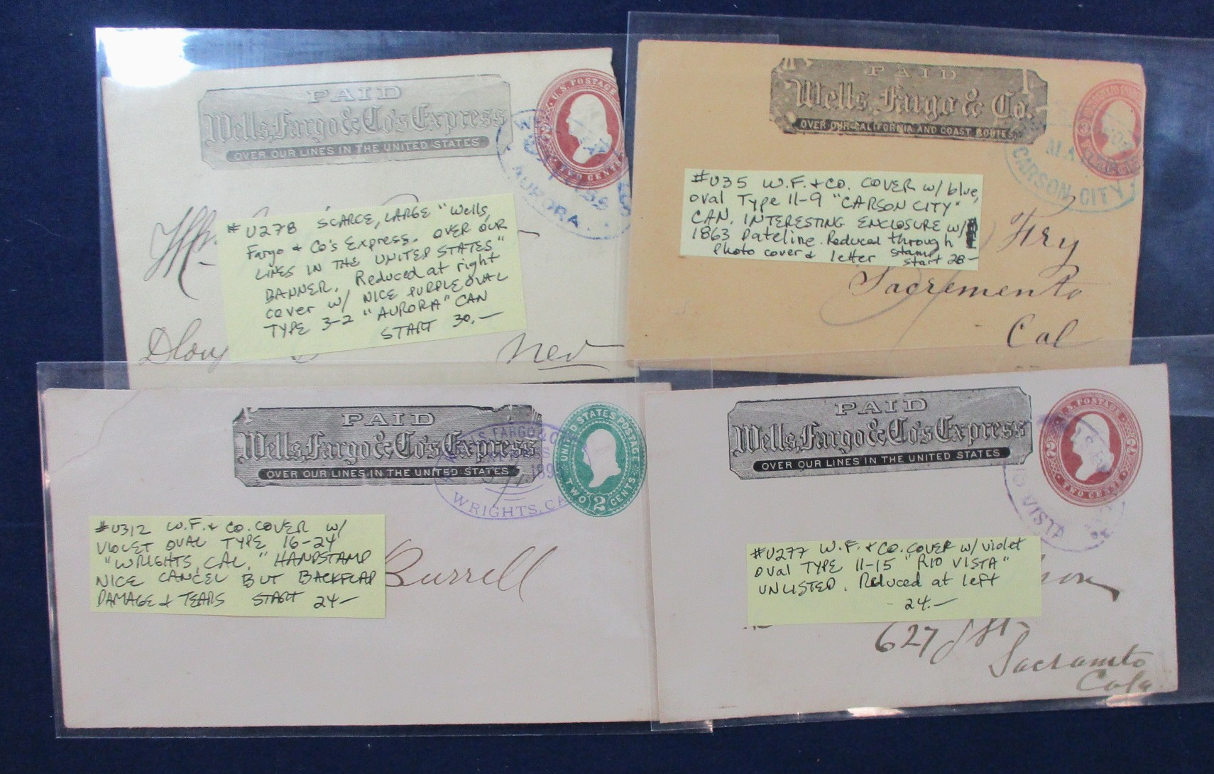 Wells Fargo Cover Lot - 4 Different, Scott U82 and U163 (3) group of 6 Wells Fargo and Co. covers all addressed to California. Includes a blue oval Type 11-9 with either "Eureka, H.B.", "Petaluma", "Red Bluffs", and "Reno"