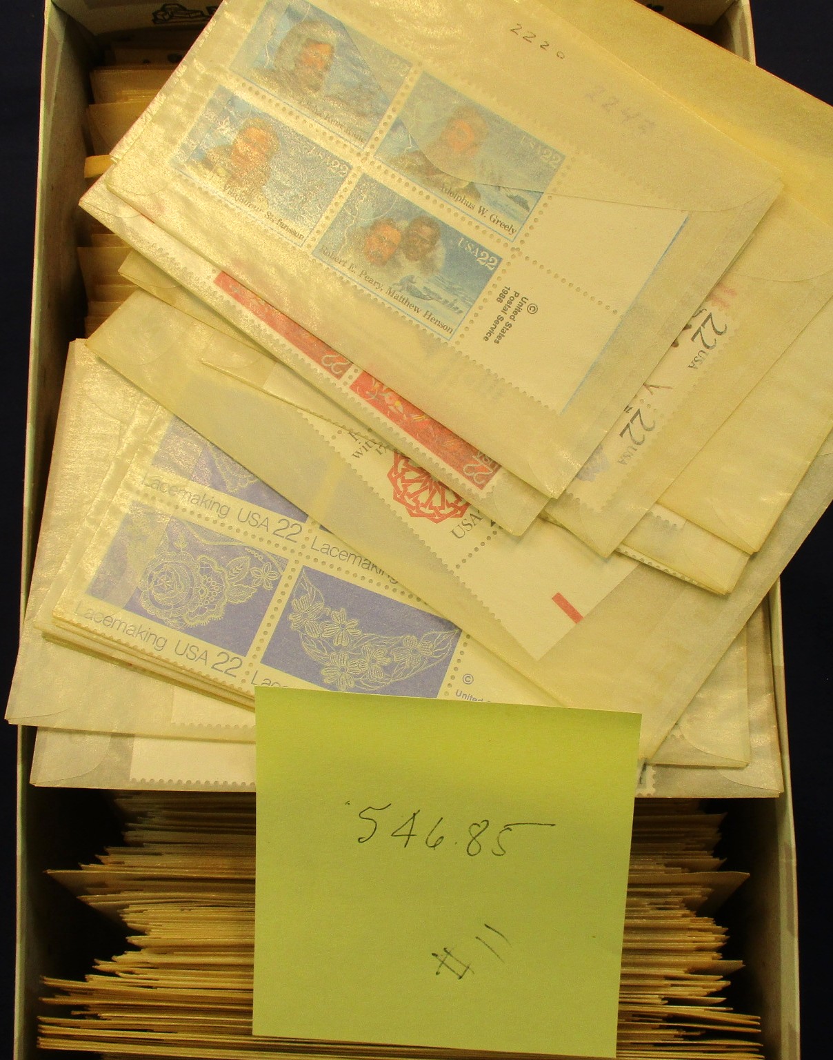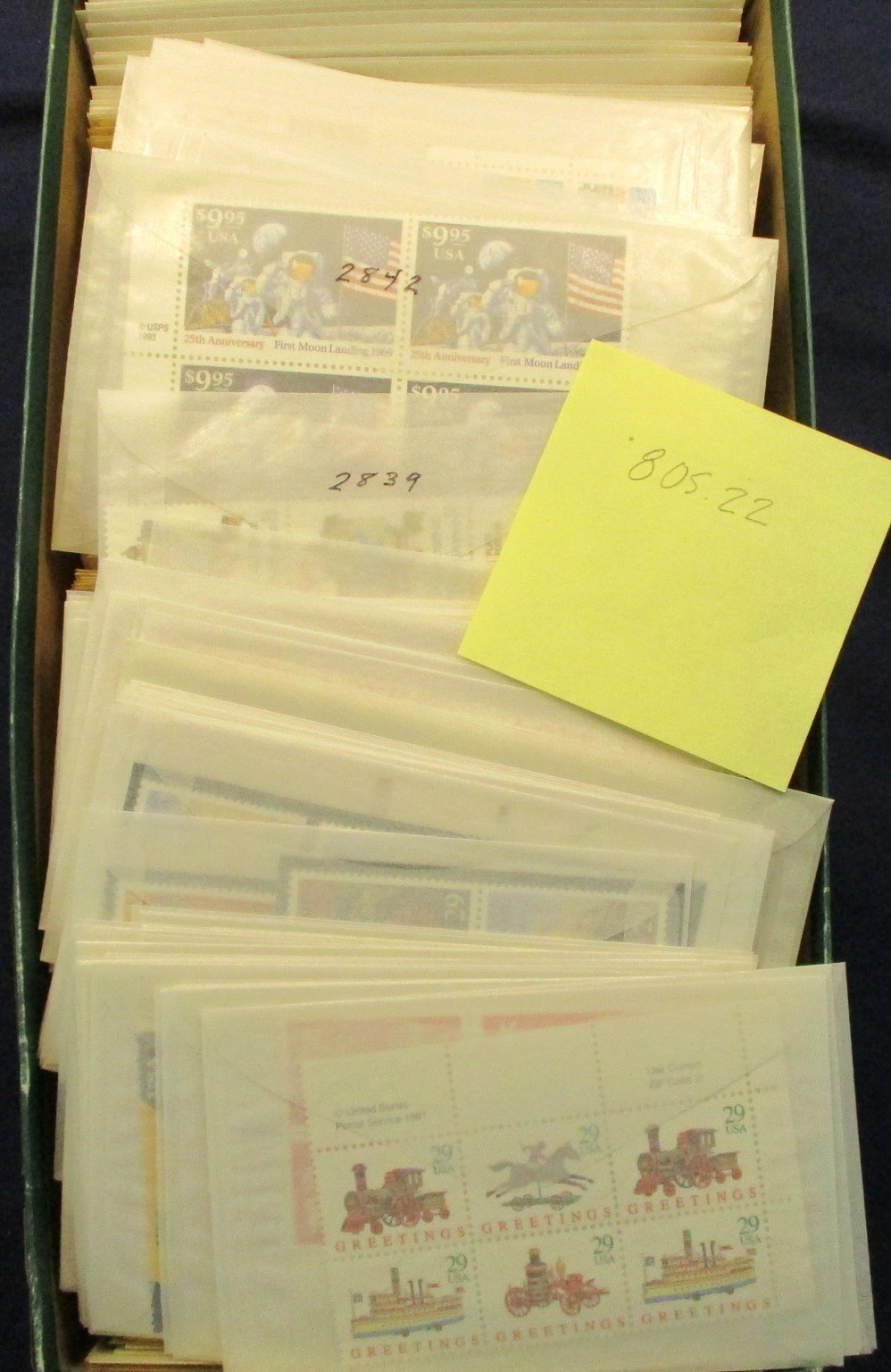 142 og imageHoard of Postage - 2 shoeboxes of plate blocks and multiples mostly identified in glassines, a few high values to $5, and then 10 large format plate block files filled. Clean, usable postage. (Face $2200+) (Image) (Image2) (Image3) (Image4) (Image5) (Image6) (Image7) (All Images)