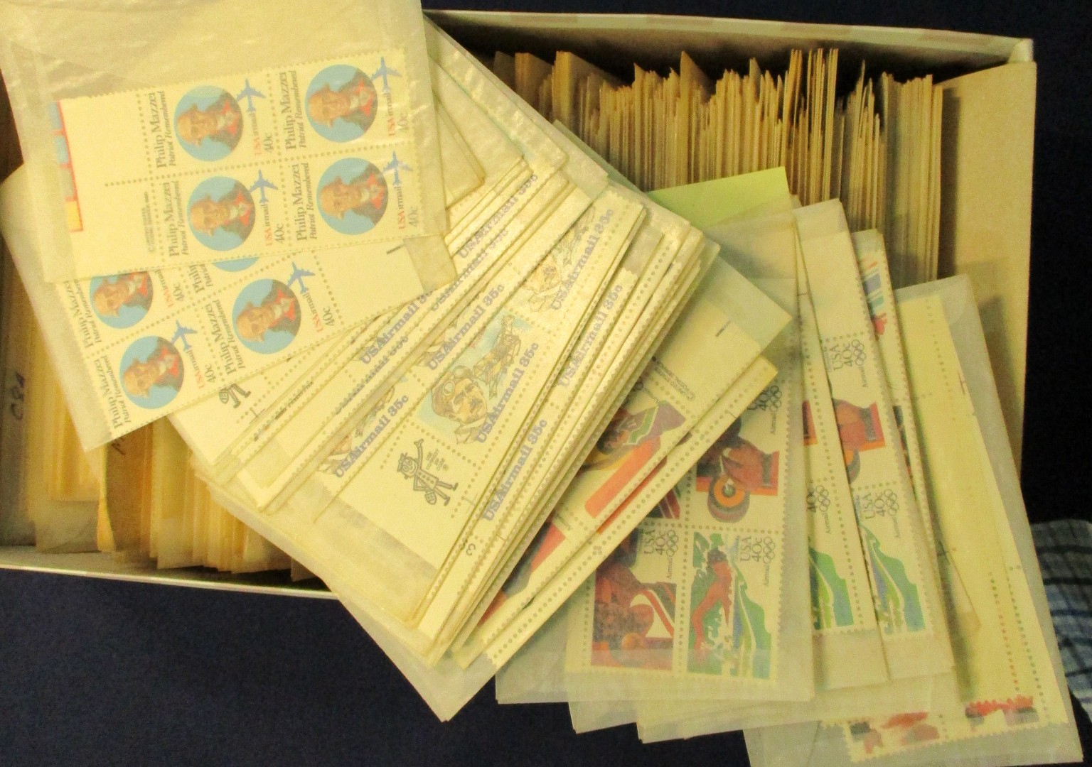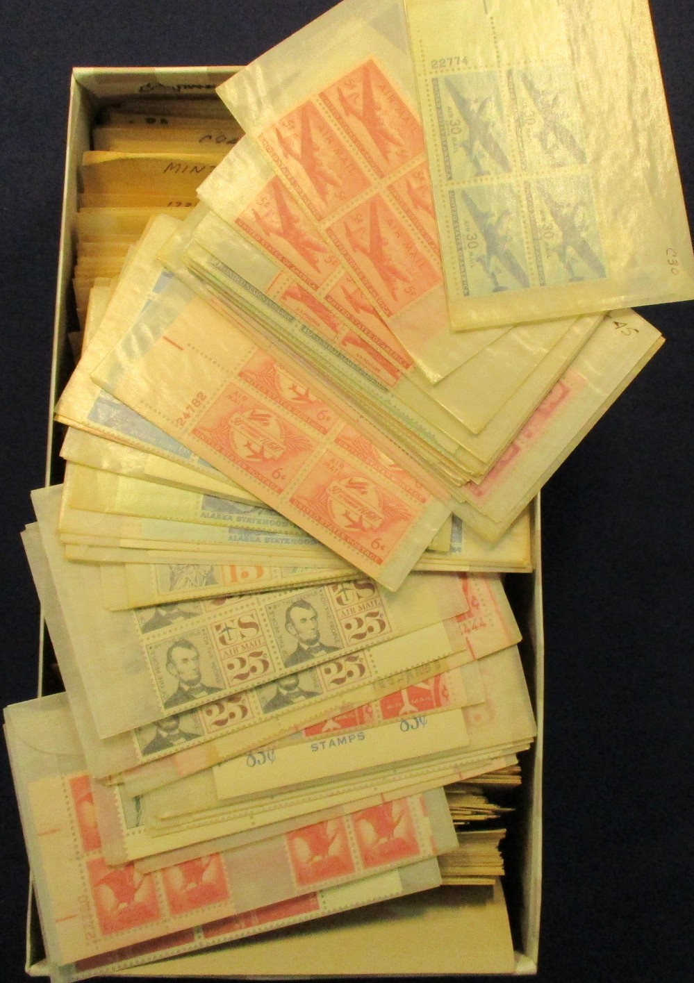 160 og imageUSA Mint Assortment in a Medium Box - Medium box holds plate blocks in a binder, USPS commem year sets 1977-94 and 1997-9, and blocks and larger multiples in glassines and envelopes. There is some better value in the plate blocks with some early airmails, special delivery, and a few pre 1940. Face around $450-500. F-VF. (Est $300-400) (Image) (Image2) (Image3) (Image4) (Image5) (Image6) (Image7) (All Images)