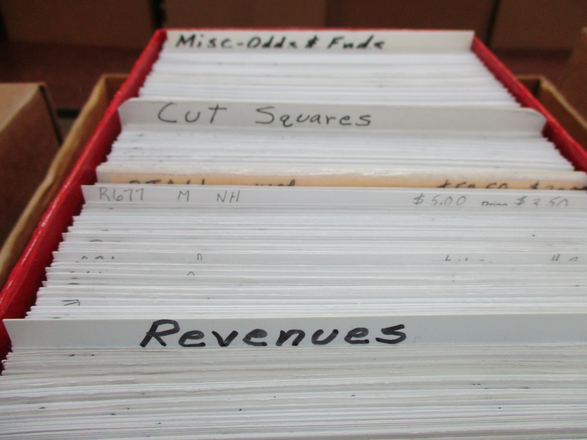 153 imageRetired Dealer "Bargain" Stock in 3 Dealer 107 Boxes - 3 filled red boxes labeled "U.S. Bargain Box". Most are retailed at 1/2 SCV or lower based on quality and centering. Great mix of early to modern issues along with strength back of book. We spotted most in the $10-50 range, and several stamps with values over $200. Owner states SCV is $39K in general issues, $1360 in cut squares, and $7400 in revenues (total $47,000+). Great lot for the dealer to sell at further discount. Expect mixed condition. Viewing recommended. (Est $4000-5000) (Image) (Image2) (Image3) (Image4) (Image5) (Image6) (Image7) (All Images)
