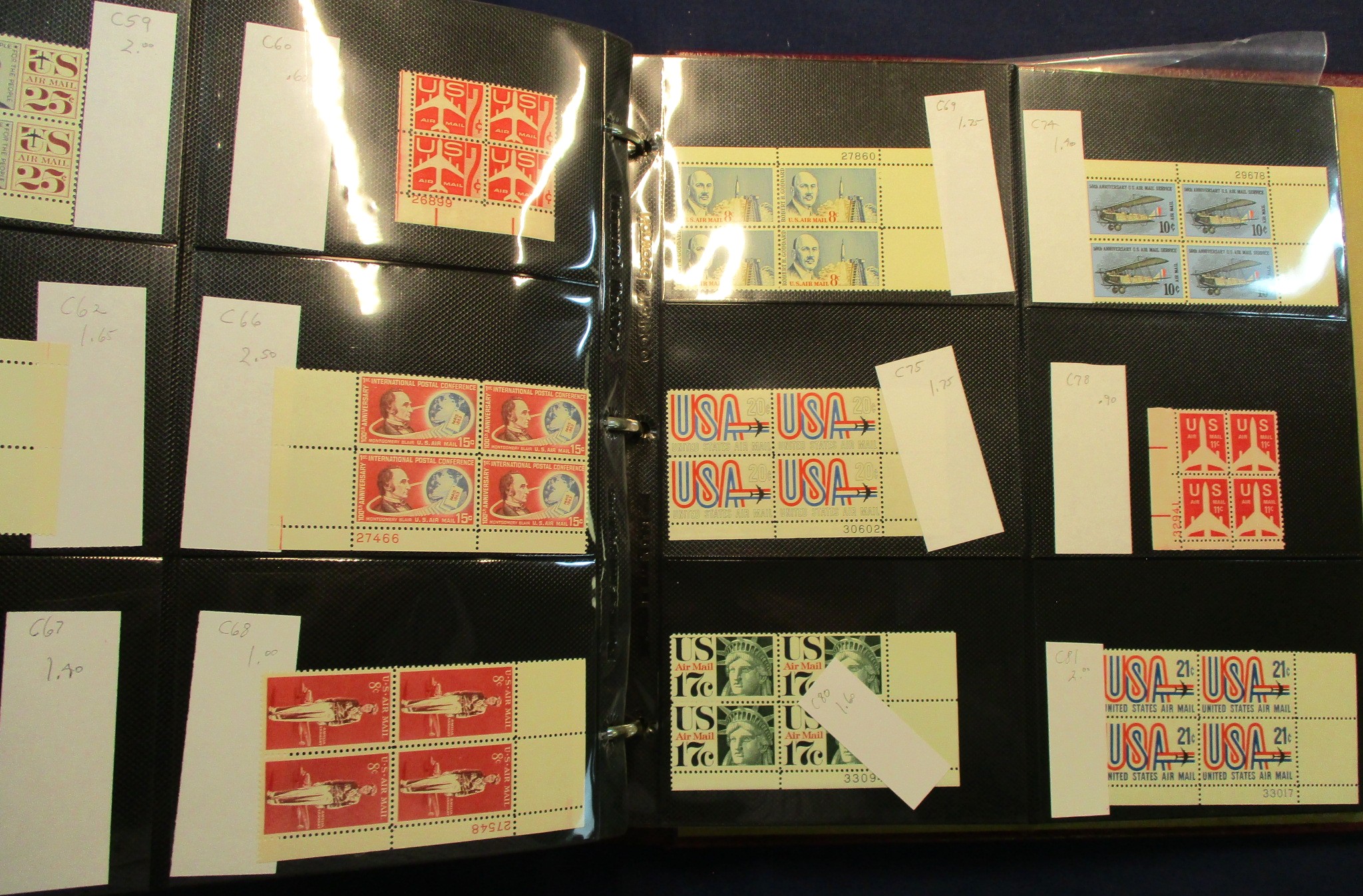 156 imageUSA Collections of Airmails, Commemoratives, Definitives - 2 binders with manila stockpages and a stockbook all holding mint singles, blocks, booklets, booklet panes, and more. Then an airmail collection on White Ace pages in appropriate binder with a MNH Baby Zepp, and booklets BKC1, BKC3-4, BKC7-8, and BKC10, airmail plate blocks beginning with the 6¢ Globe and going to the 1983 Olympics. Face value over $1100 but take into account the premium items when bidding. Generally F-VF throughout. (Est $900-1200) (Image) (Image2) (Image3) (Image4) (Image5) (Image6) (Image7) (Image8) (All Images)