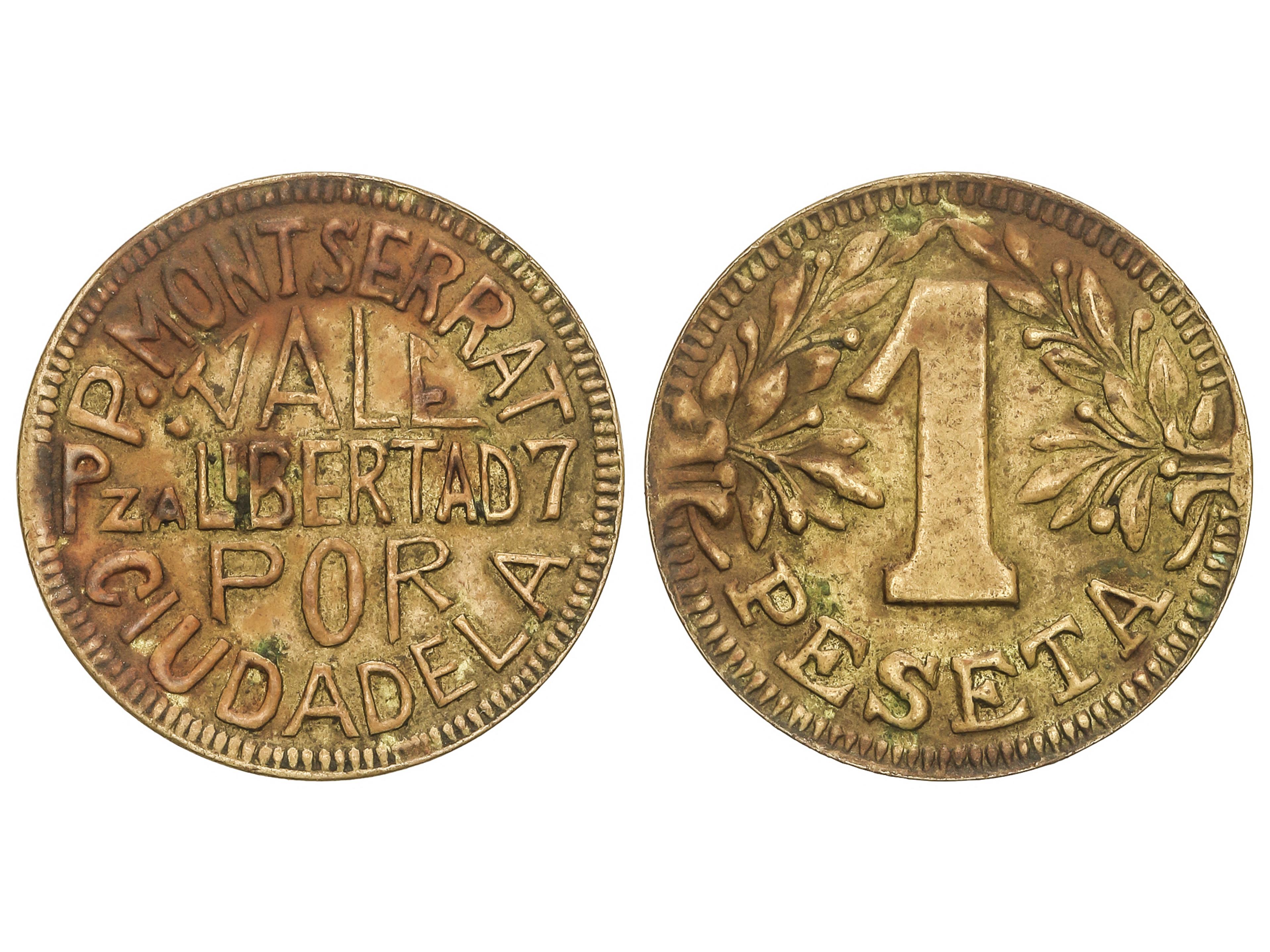 1 Peseta. P. MONTSERRAT. PZA. LIBERTAD 7. CIUDADELA. MENORCA. Latón. RARA. Turró-AN26, No.9. MBC+. (Image1)