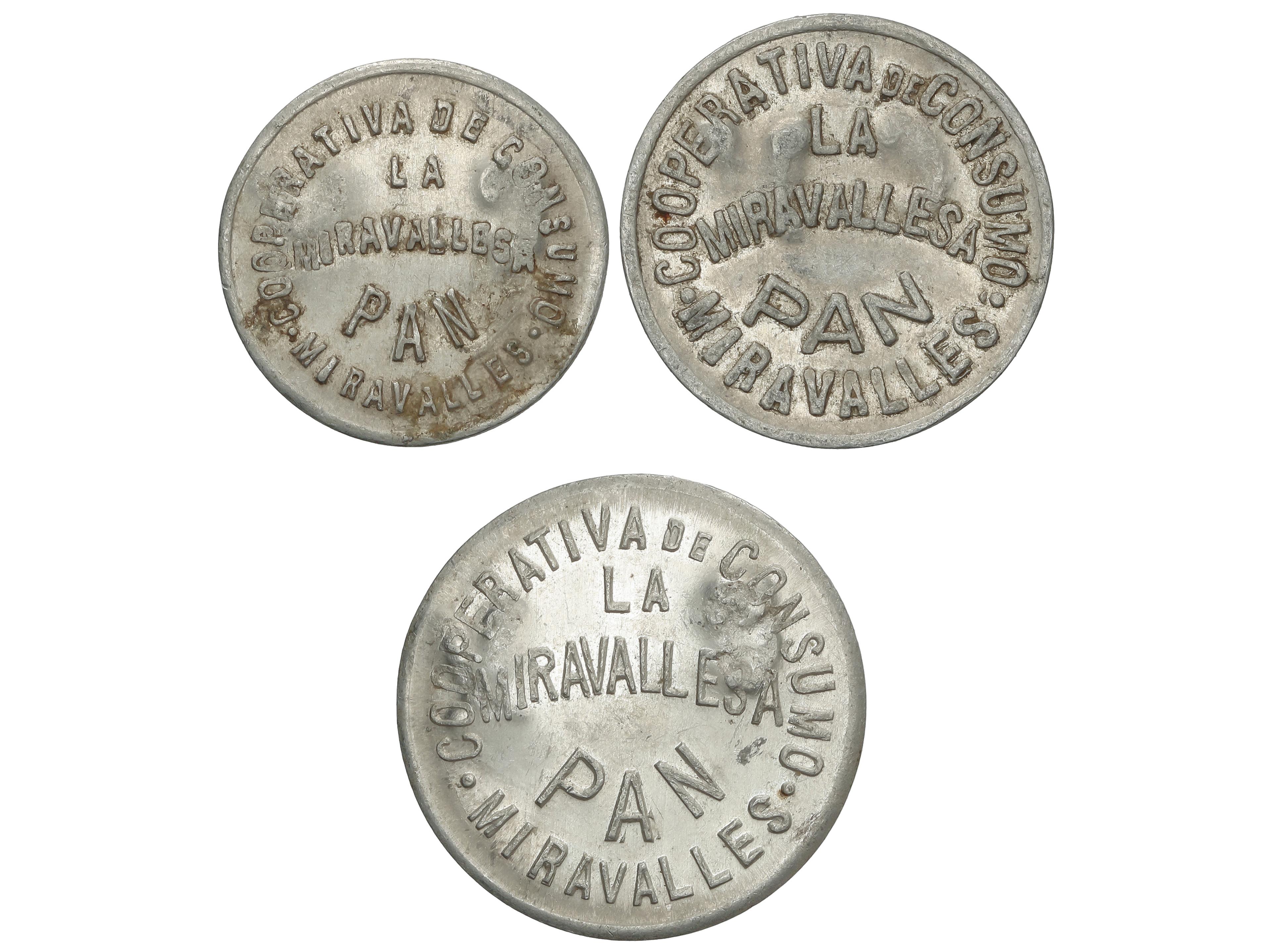 Lote 3 fichas 10 Céntimos, 1 y 2 Kilos. COOPERATIVA DE CONSUMO LA MIRAVALLESA. MIRAVALLES (Vizcaya). 1,07 y 1,44 y 1,66 grs. Al. MBC+ a EBC. (Image1)