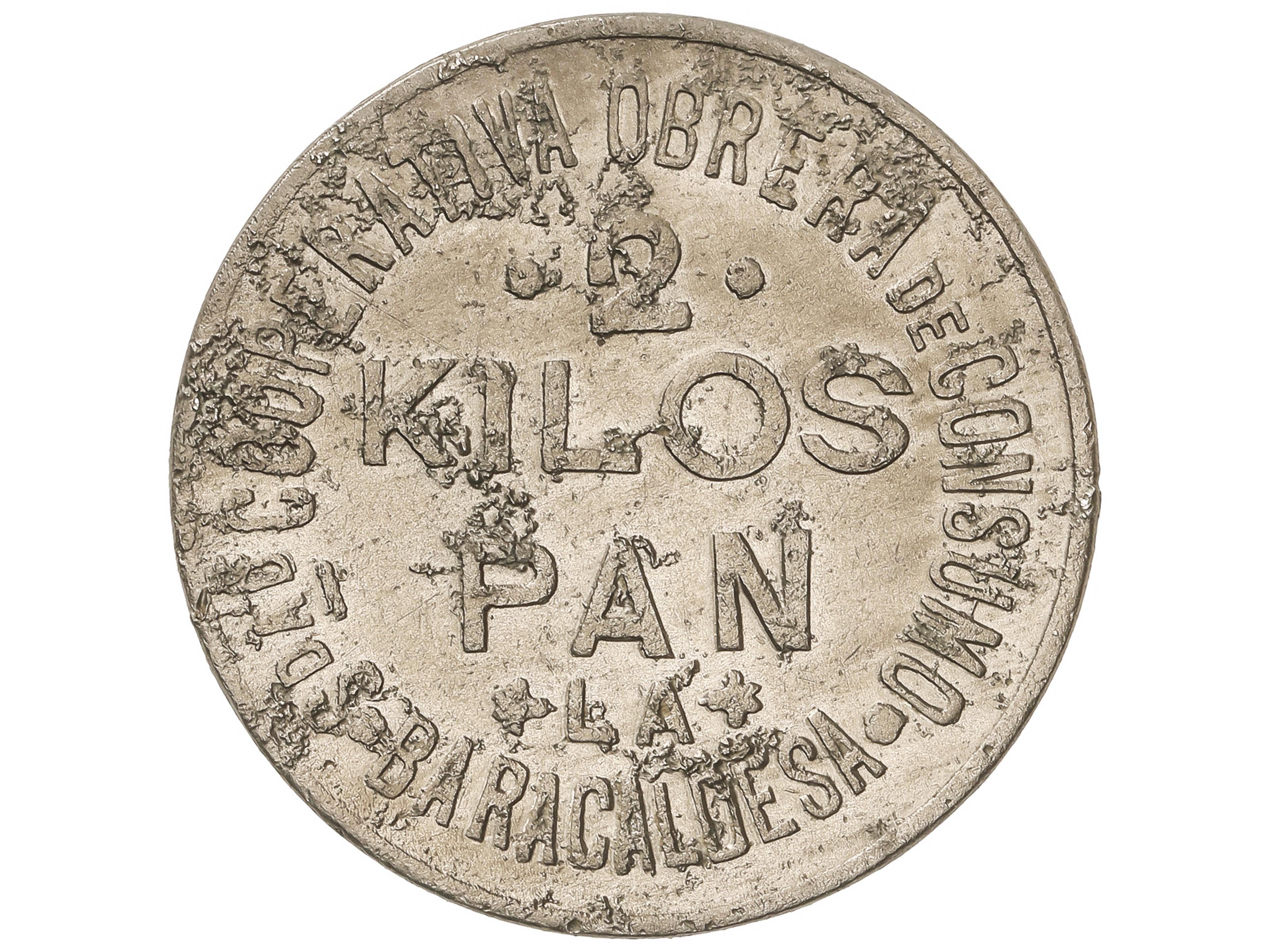 2 Kilos de Pan. COOPERATIVA OBRERA DE CONSUMO LA BARACALDESA. BARACALDO (Vizcaya). 2,36 grs. Al. (Oxidaciones). MBC+.