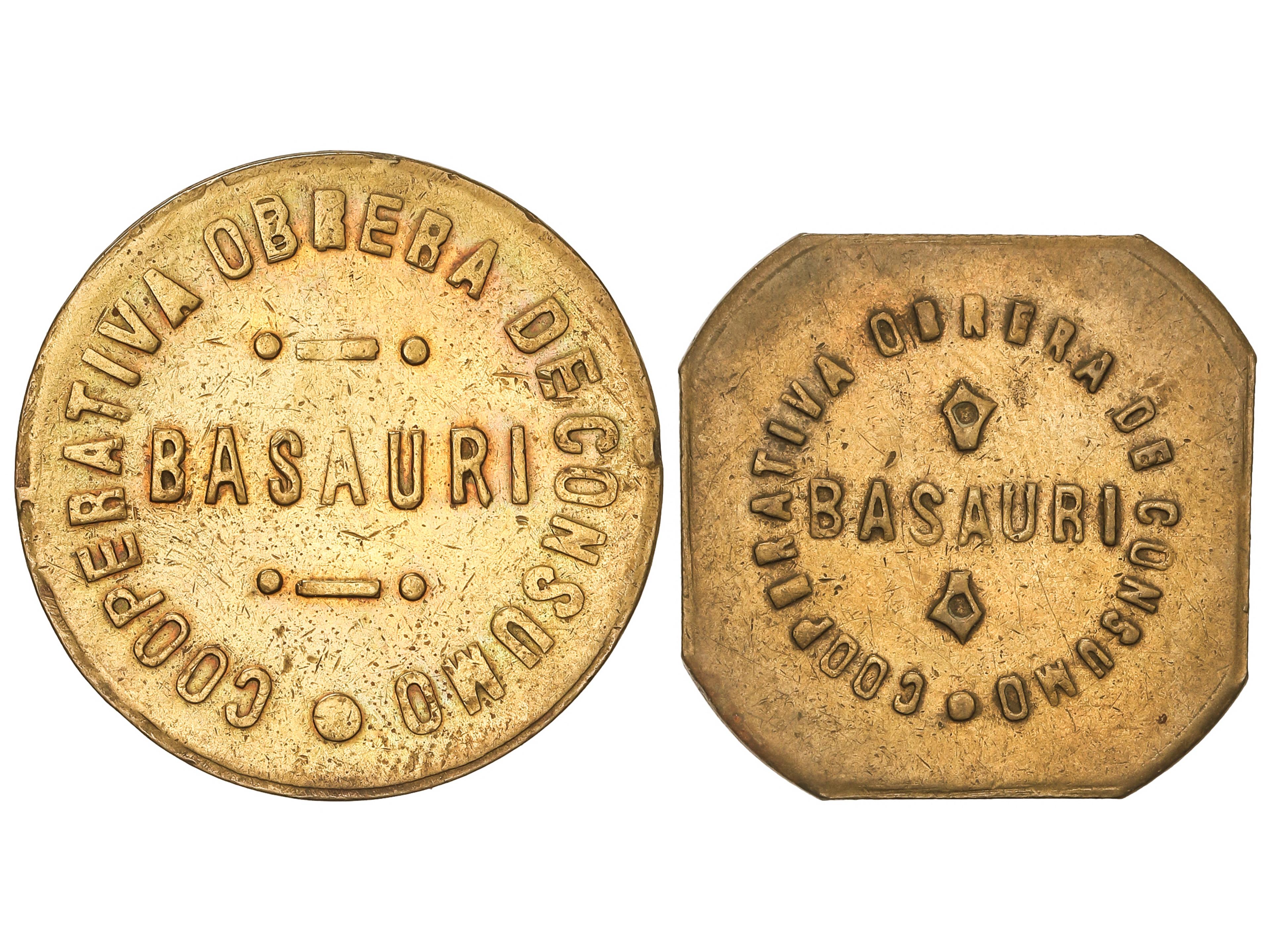 Lote 2 fichas 1 y 2 Kilos de Pan. COOPERATIVA OBRERA DE CONSUMO. BASAURI (Vizcaya). 5,16 y 5,97 grs. Latón. MBC a MBC+.