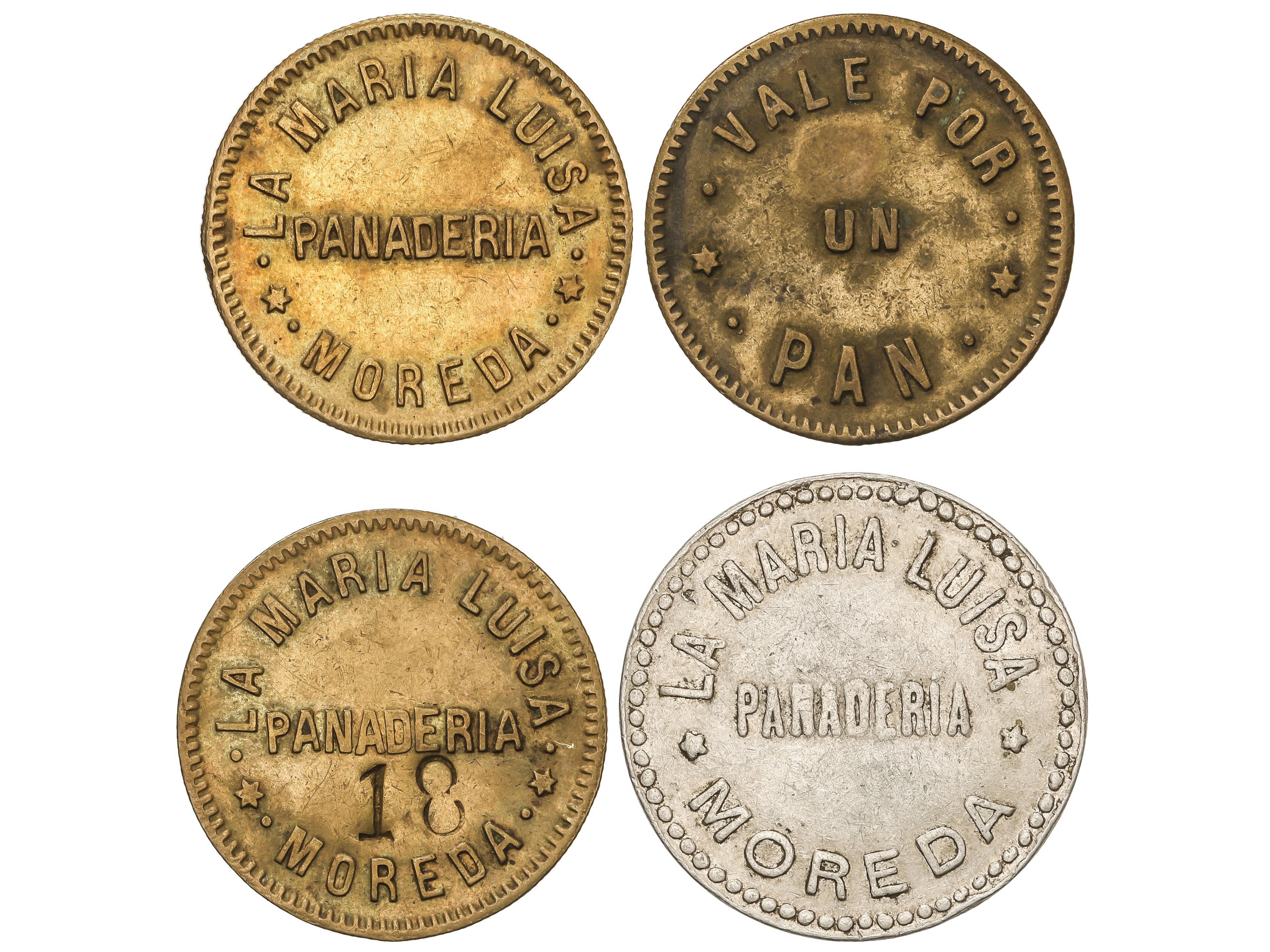 Lote 4 fichas Vale por un Pan. PANADERÍA LA MARIA LUISA. MOREDA (Asturias). Al y latón. Dos con 18 contramarcado. MBC a MBC+.