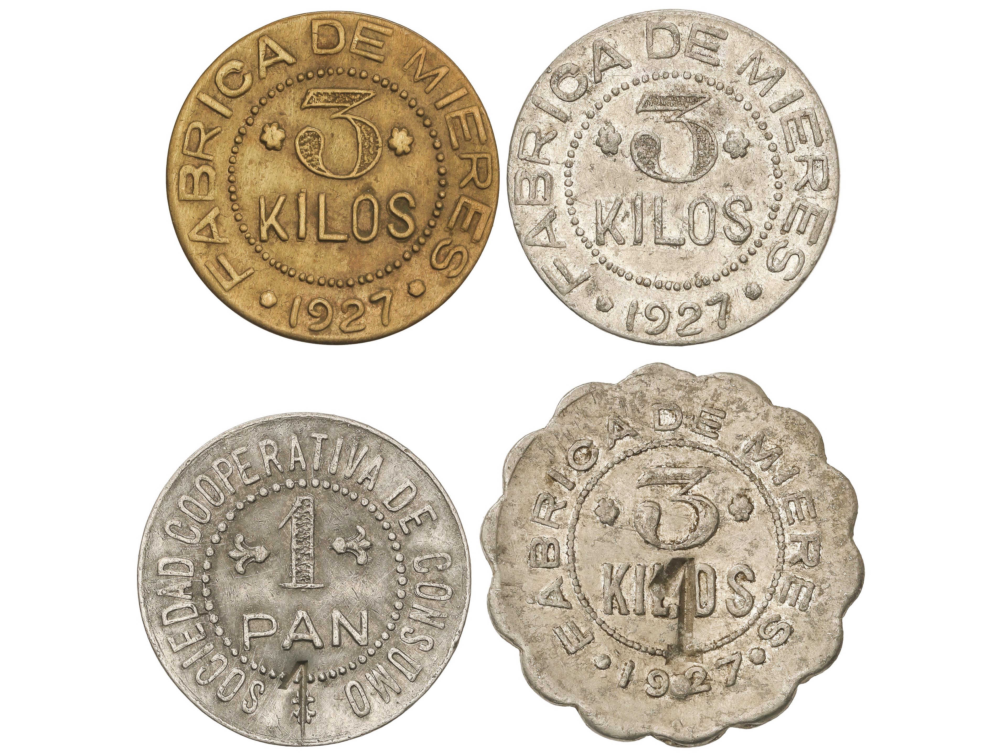 Lote 4 fichas 1 y 3 (3) Kilos de Pan. 1927. FABRICA DE MIERES. SOCIEDAD COOPERATIVA DE CONSUMO. (Asturias). Al y latón. Todas diferentes. MBC a MBC+. (Image1)