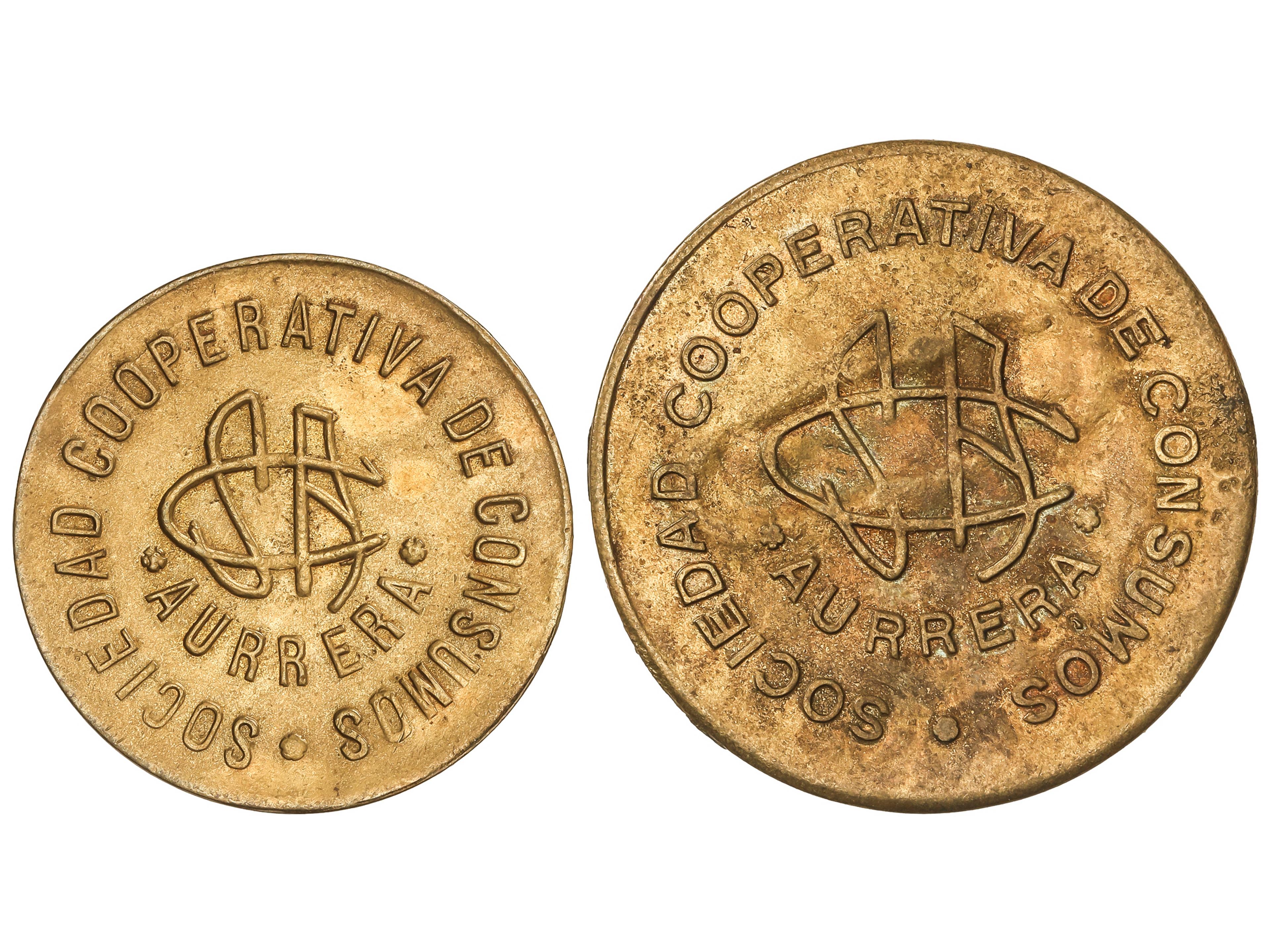 Lote 2 fichas 1 y 2 Kilos de Pan. SOCIEDAD COOPERATIVA DE CONSUMOS AURRERA. (Sestao). 4,77 y 6,91 grs. Latón. 2 Kilos con contramarca. MBC a MBC+. (Image1)