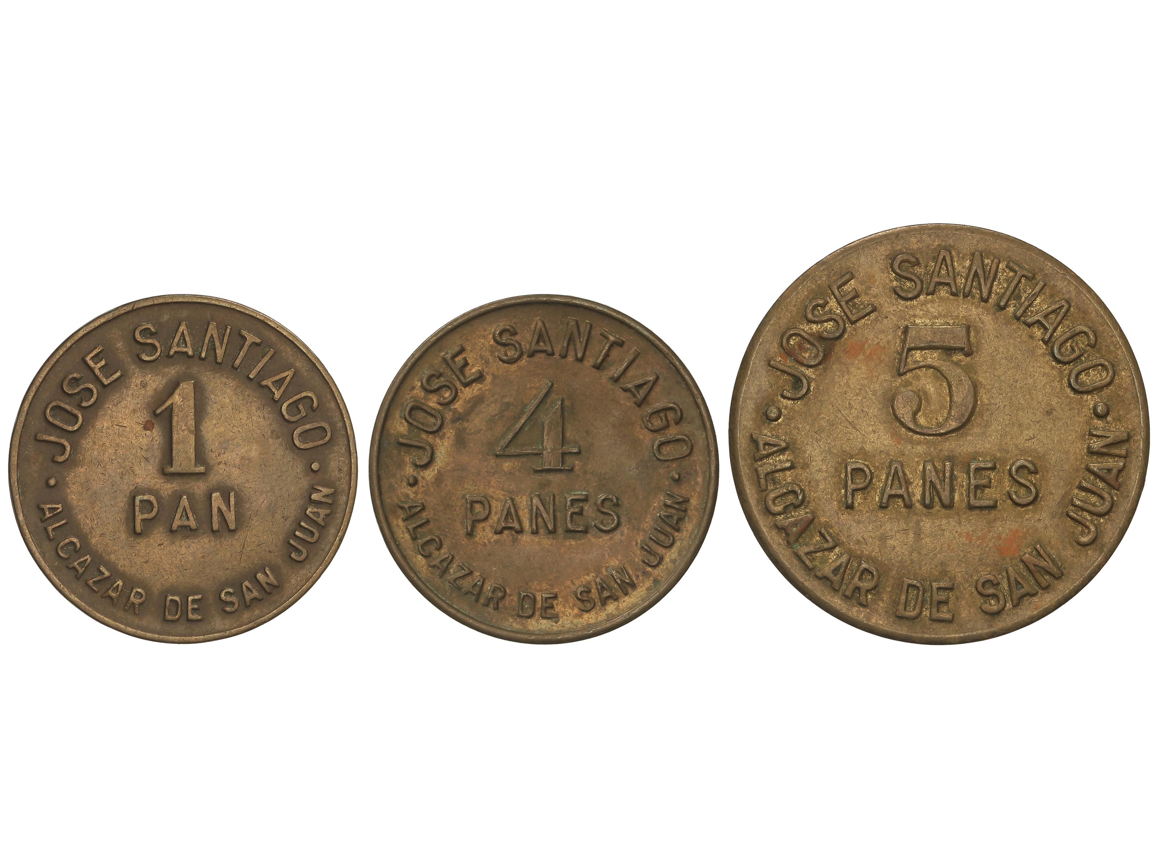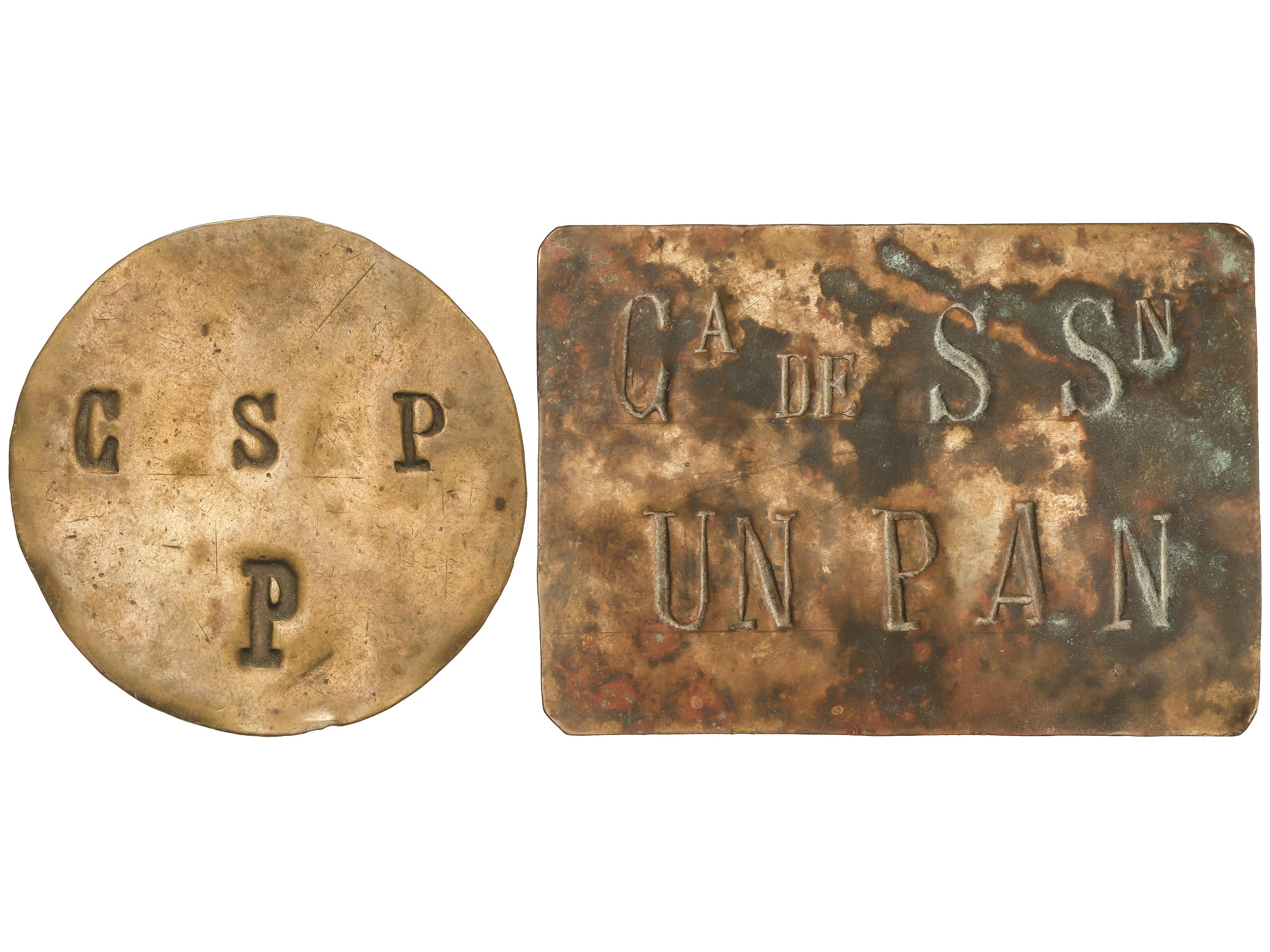 Lote 2 fichas Un Pan. Cª de S. Sn. y C. S. P. ANTEQUERA. 4,27 y 4,92 grs. Latón. (Manchas). MBC a MBC+. (Image1)