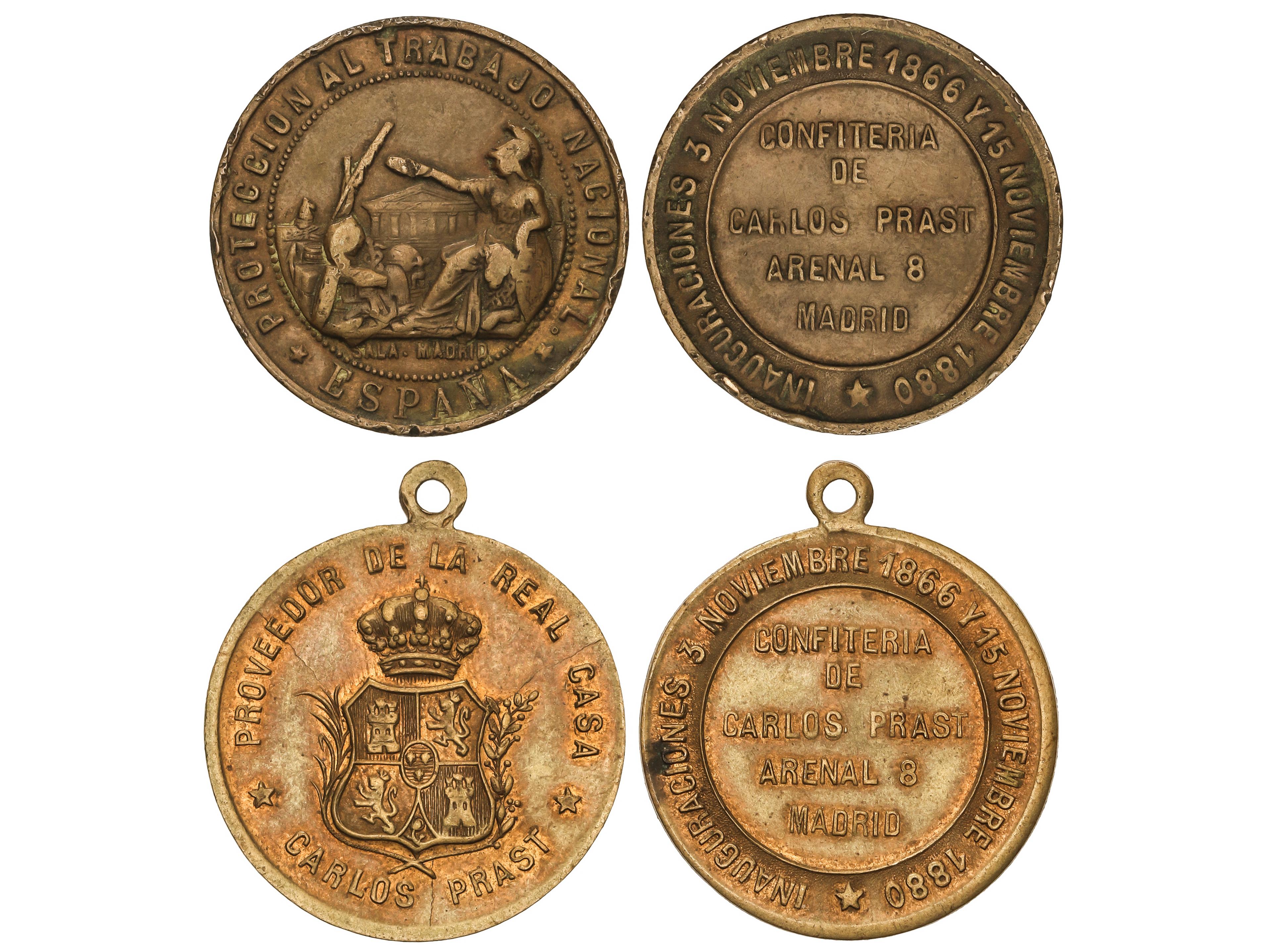 Lote 2 medallas. CONFITERIA DE CARLOS PRAST. MADRID. 4,36 y 4,60 grs. AE,latón. MBC- a MBC. (Image1)