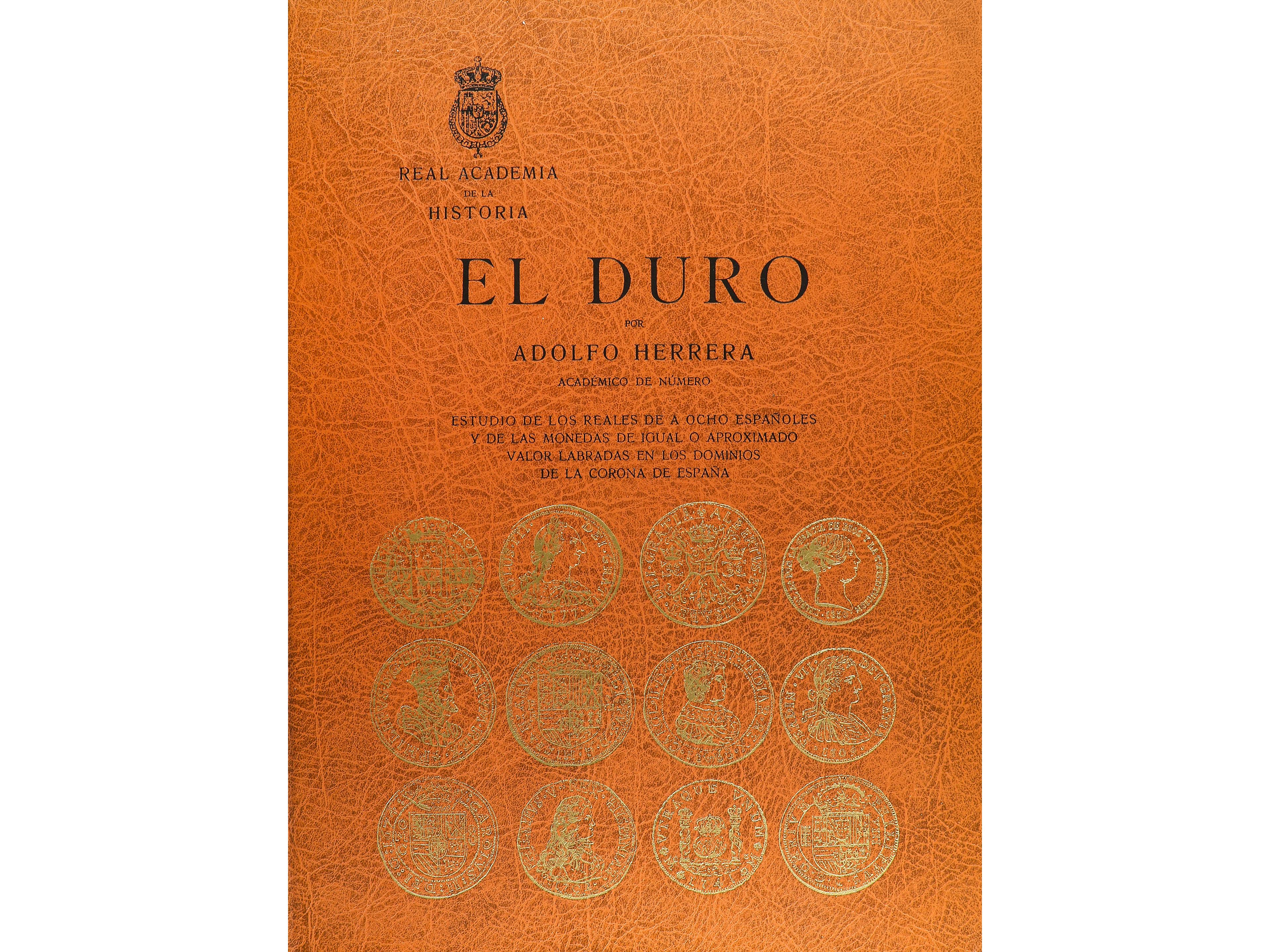 Herrera, Adolfo. EL DURO. Estudio de los reales de a ocho españoles y de las monedas de igual o aproximado valor labradas en los dominios de la corona de España. Madrid, 1914. Los dos tomos encuadernados en un solo volumen.