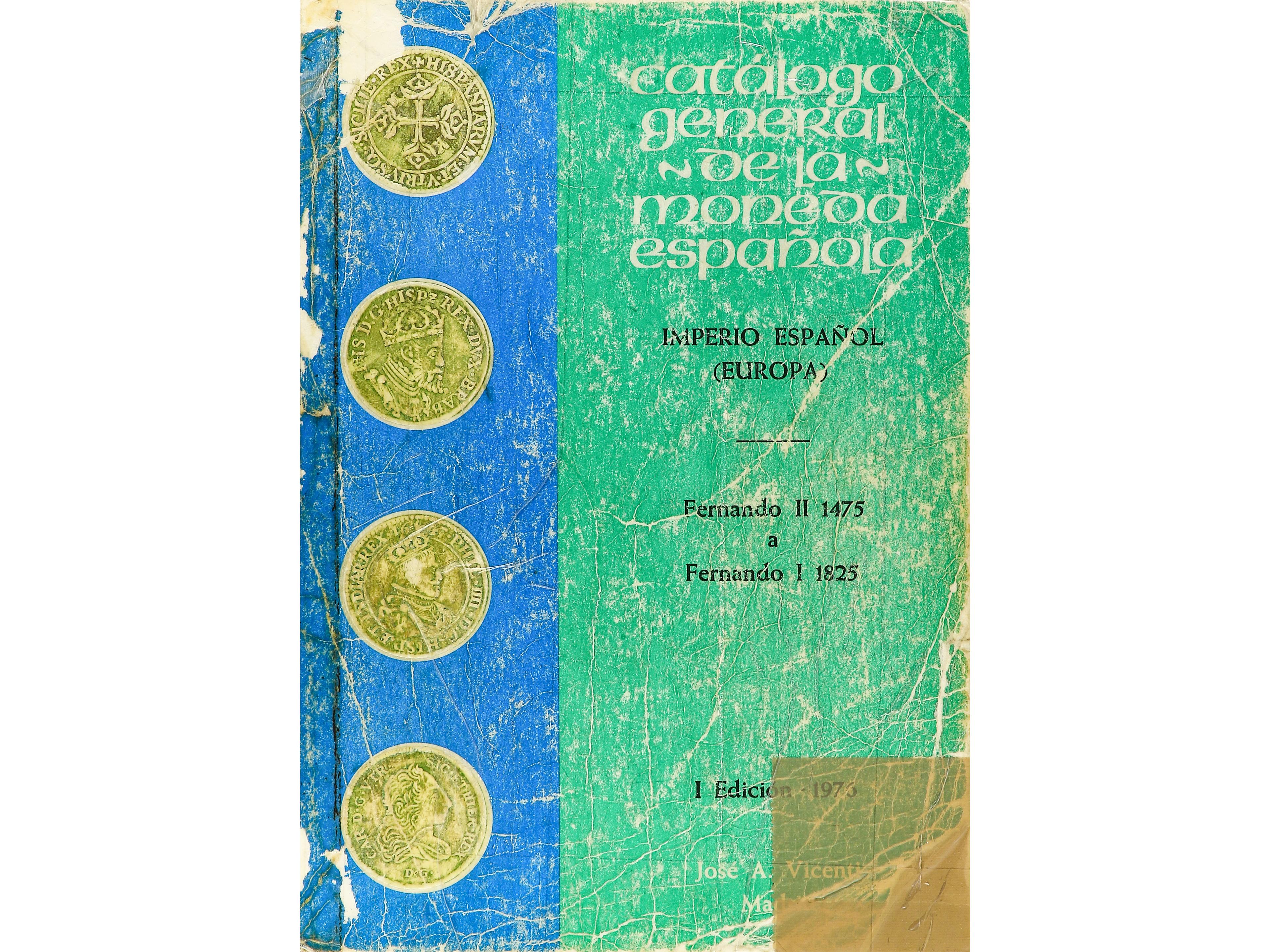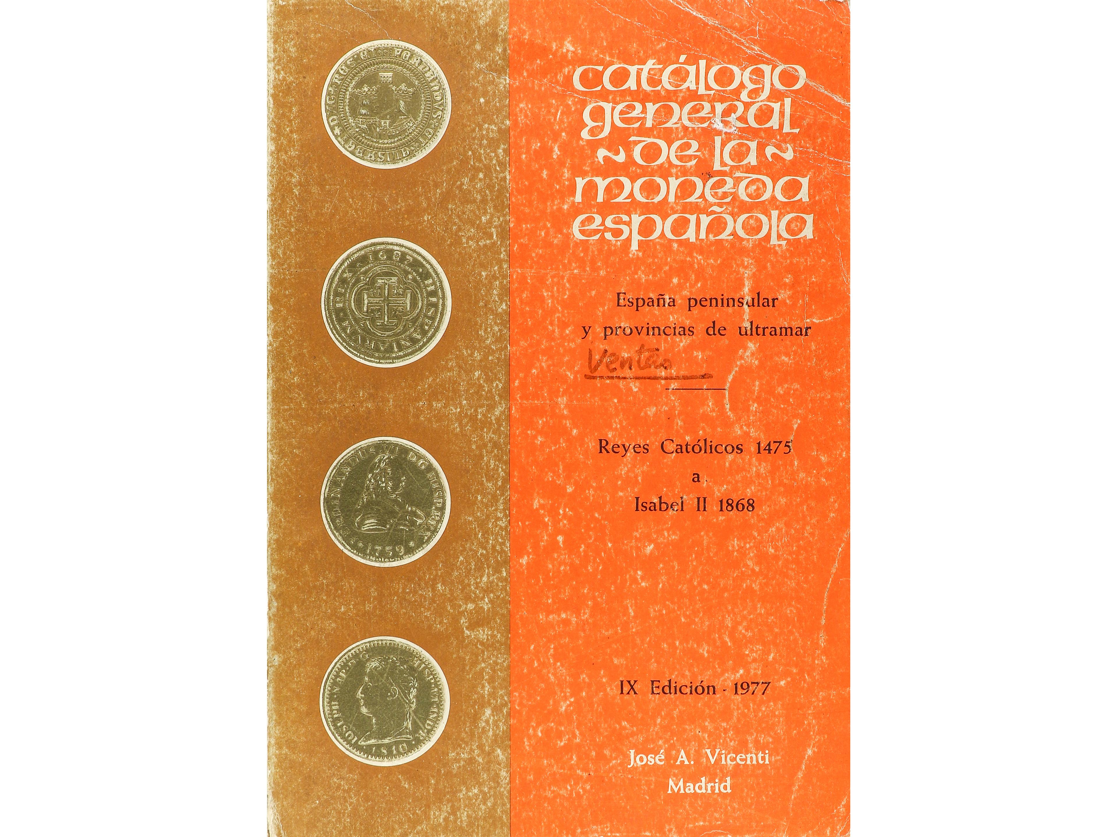 Vicenti, Jose A. Lote 2 libros CATÁLOGO GENERAL DE LA MONEDA ESPAÑOLA ESPAÑA Y PROVINCIAS y IMPERIO ESPAÑOL. FERNANDO II 1475 A FERNANDO I 1825; REYES CATÓLICOS 1475 A ISABEL II 1868. Madrid, 1976 y 1977. (Cubierta y lomo