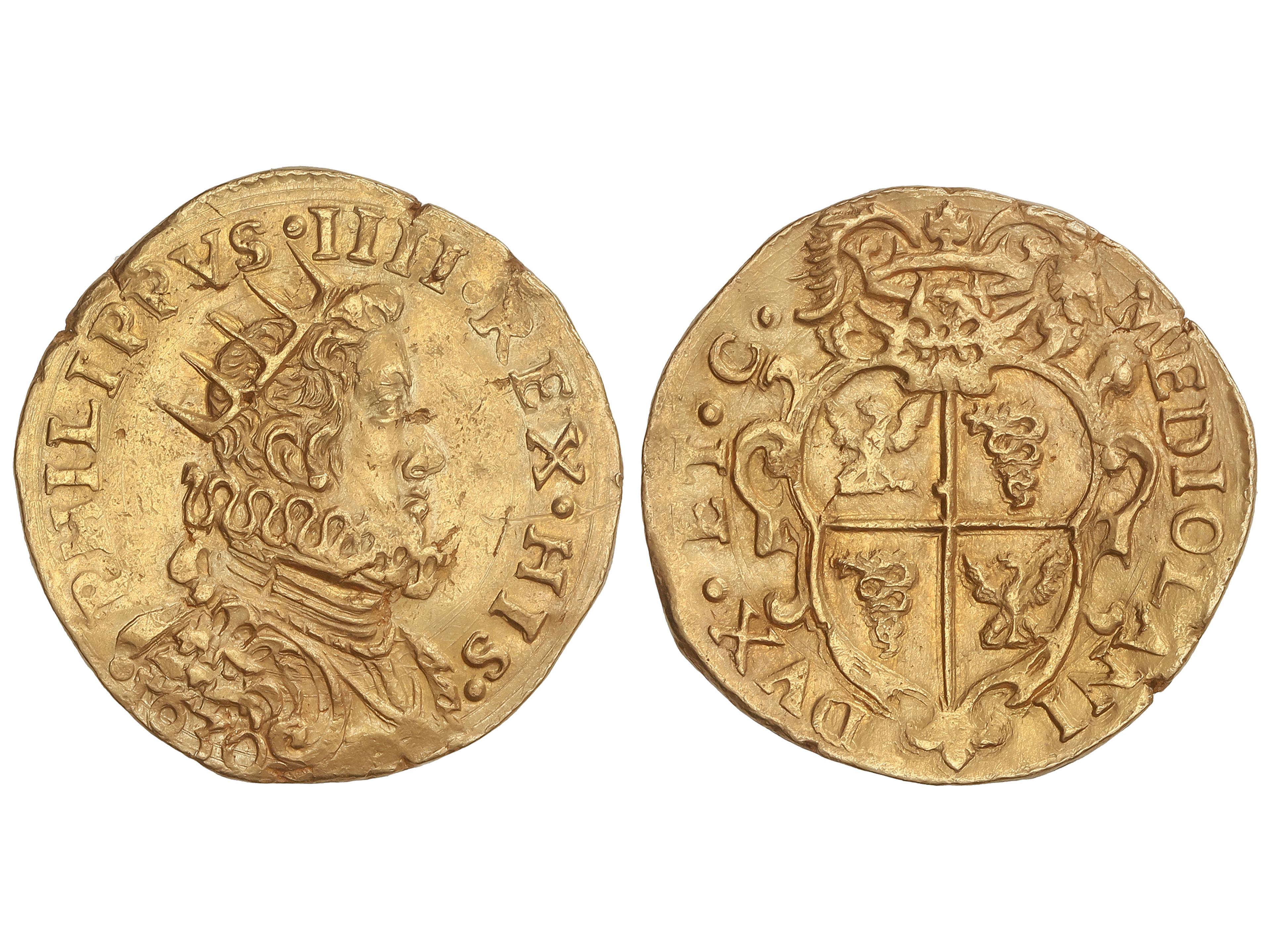 253 image2 Doppie o Quadrupla. 1630. MILÁN. 13,12 grs. AU. Bello ejemplar, gran relieve. (Levísima rayita en anverso). RARA Y MÁS ASÍ. Fr-724; KM-49; Vti-33. EBC. Ex Colección Trastamara - 25 mayo 2017, n. 986. (Image1)