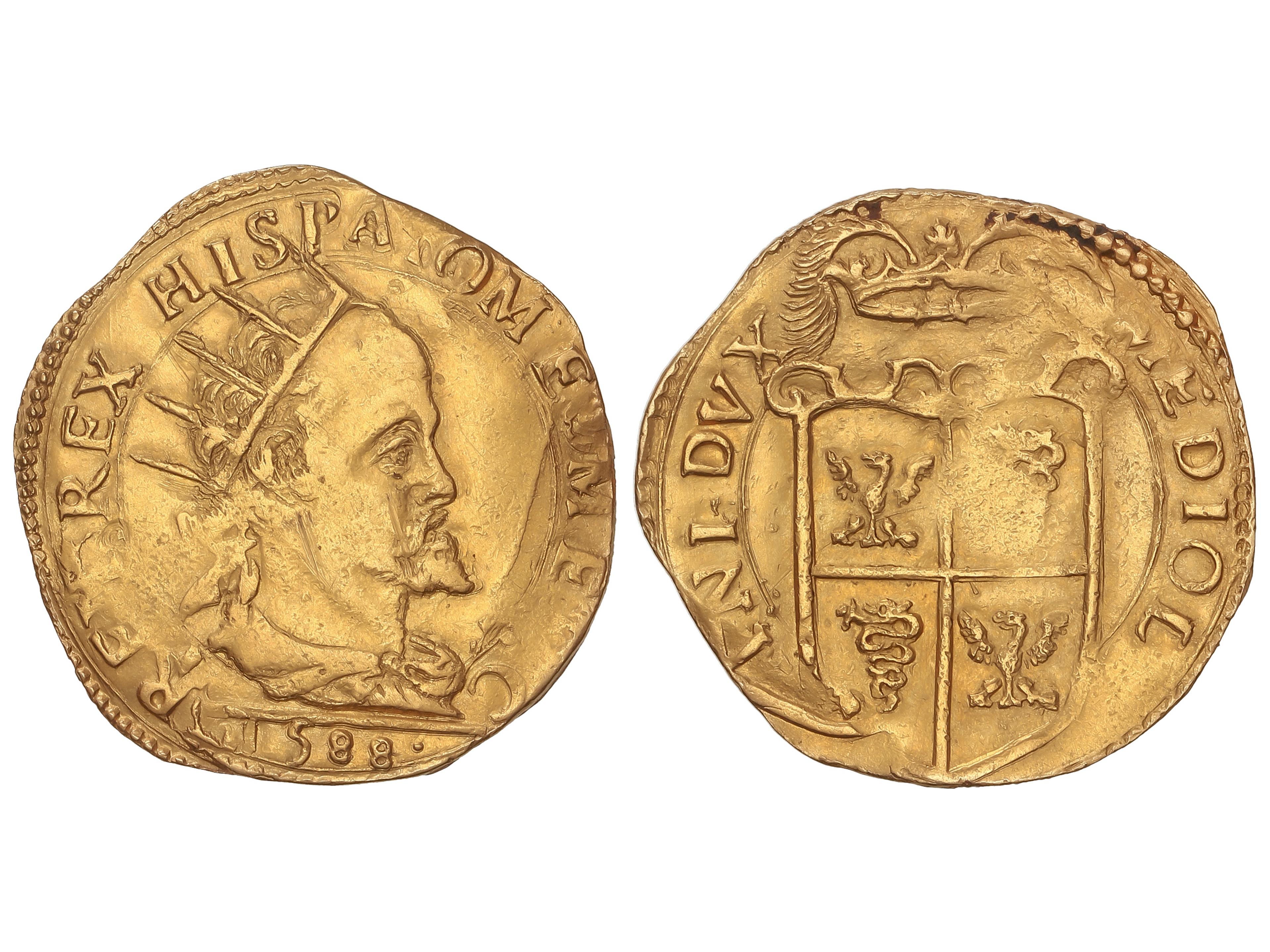 246 imageDoppia. 1588. MILÁN. 6,57 grs. AU. ESCASA. Fr-716; MB-178; Vti-68. EBC-. (Image1)