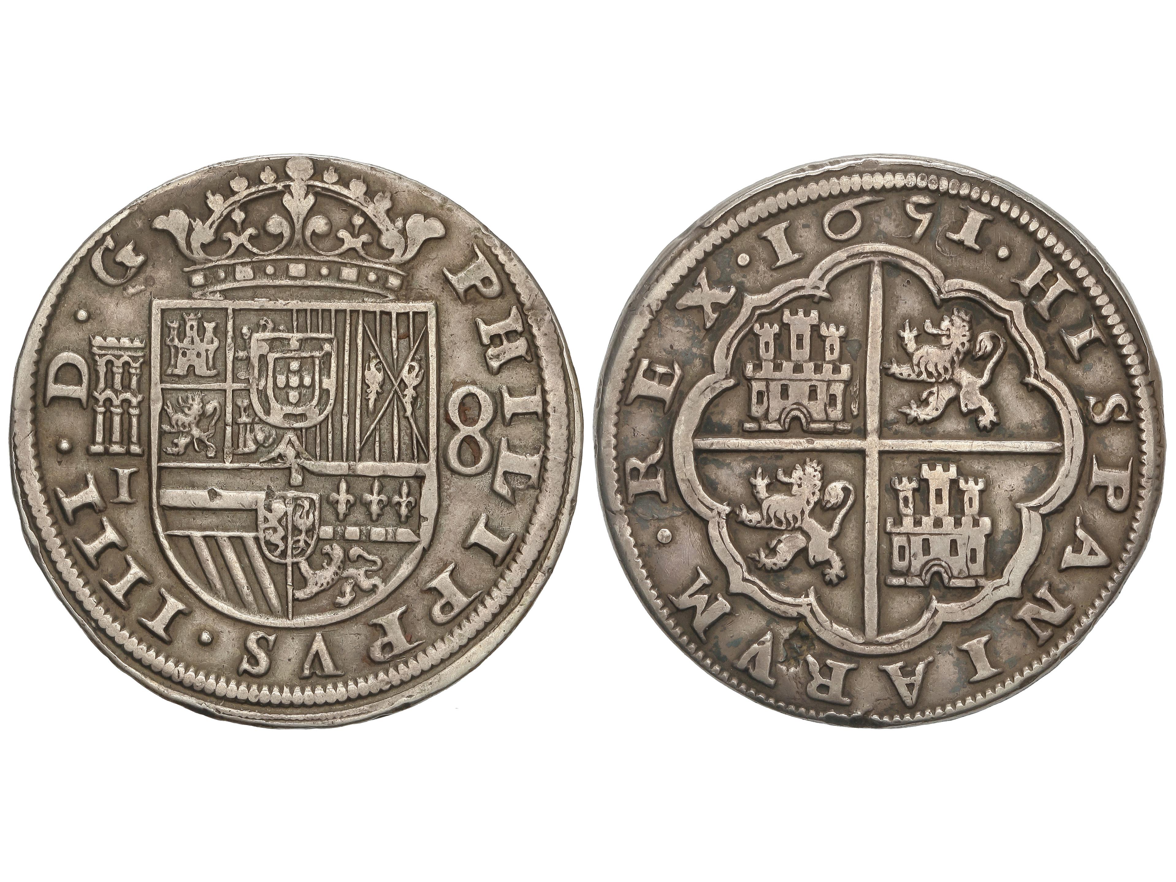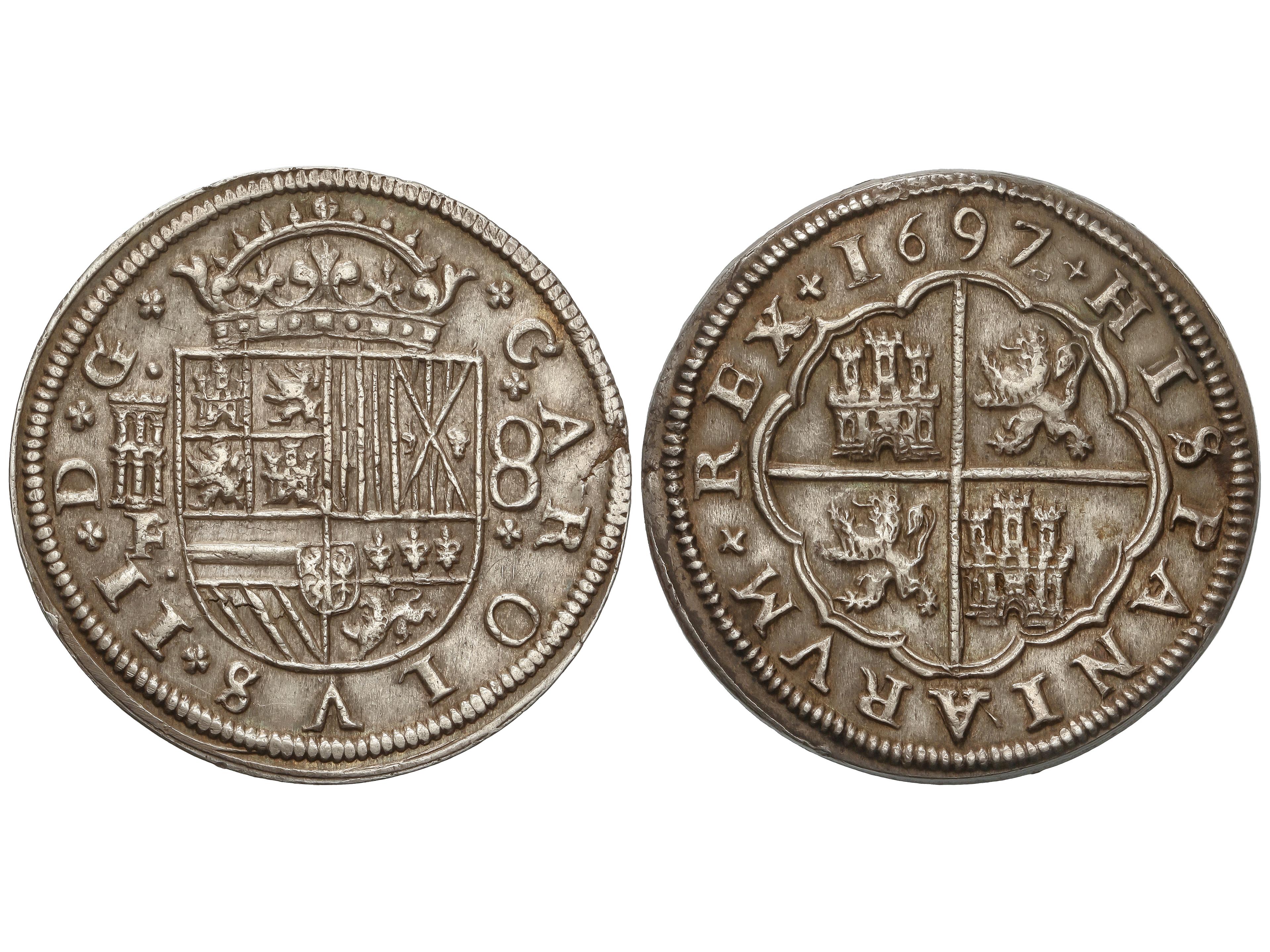 255 image8 Reales. 1697/(8)2. SEGOVIA. F/BR (nexadas). 26,26 grs. Rectificación de fecha visible en la parte inferior derecha del 7. (Pequeña grieta en canto). MUY ESCASA. AC-771 var. EBC. Ex Soler & LLach `Colección Plvs Vltra´ - 27 octubre 2021, n. 1443. (Image1)