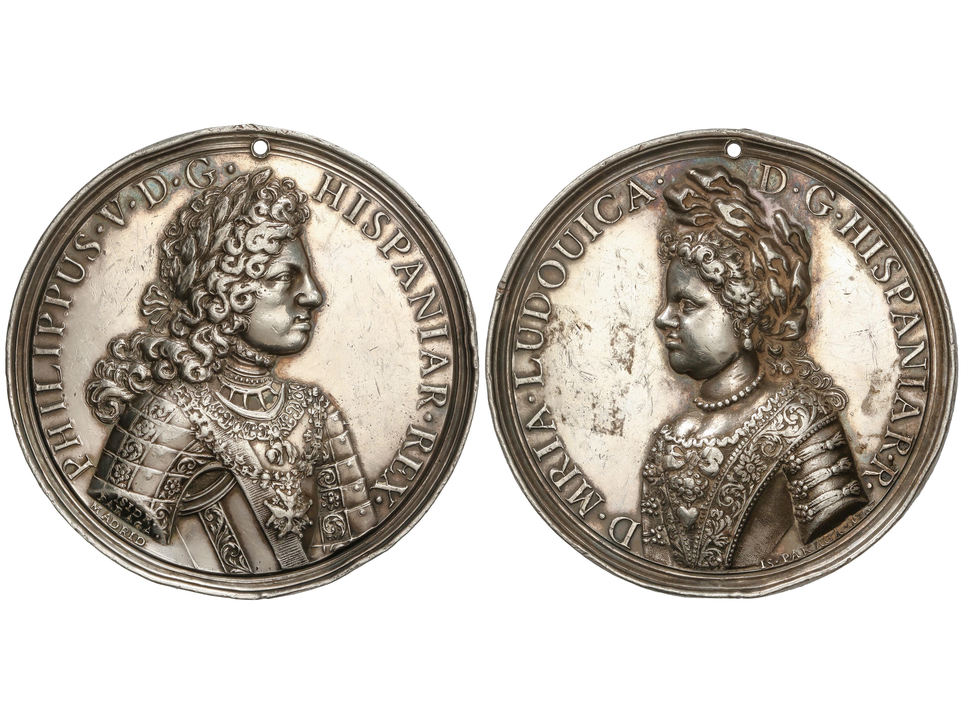 268 imageMedalla. 1707. MADRID. Anv.: Busto de Felipe V a dcha. Rev.: Maria Luisa de Saboya. 55,00 grs. AR. Ø 50 mm. Nacimiento Príncipe Luis I. (Pequeña perforación, limpiada). RARA. V-5 var. metal; VQ-14016 var. metal. MBC+. (Image1)