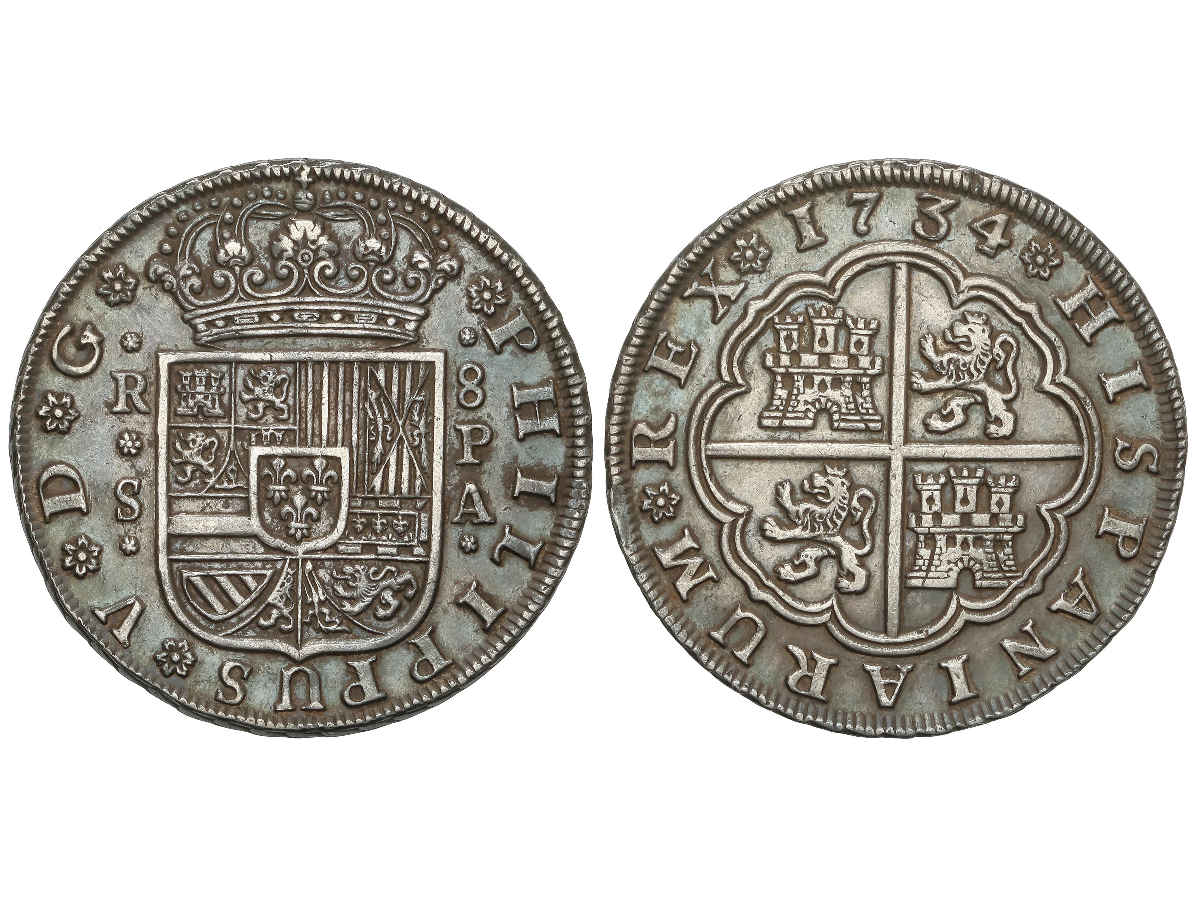 263 image8 Reales. 1734. SEVILLA. P.A. 26,76 grs. Pátina azulada. ESCASA. AC-1627. EBC-/MBC+. Ex Aureo & Calicó 338 - 13 noviembre 2019, n. 300. (Image1)