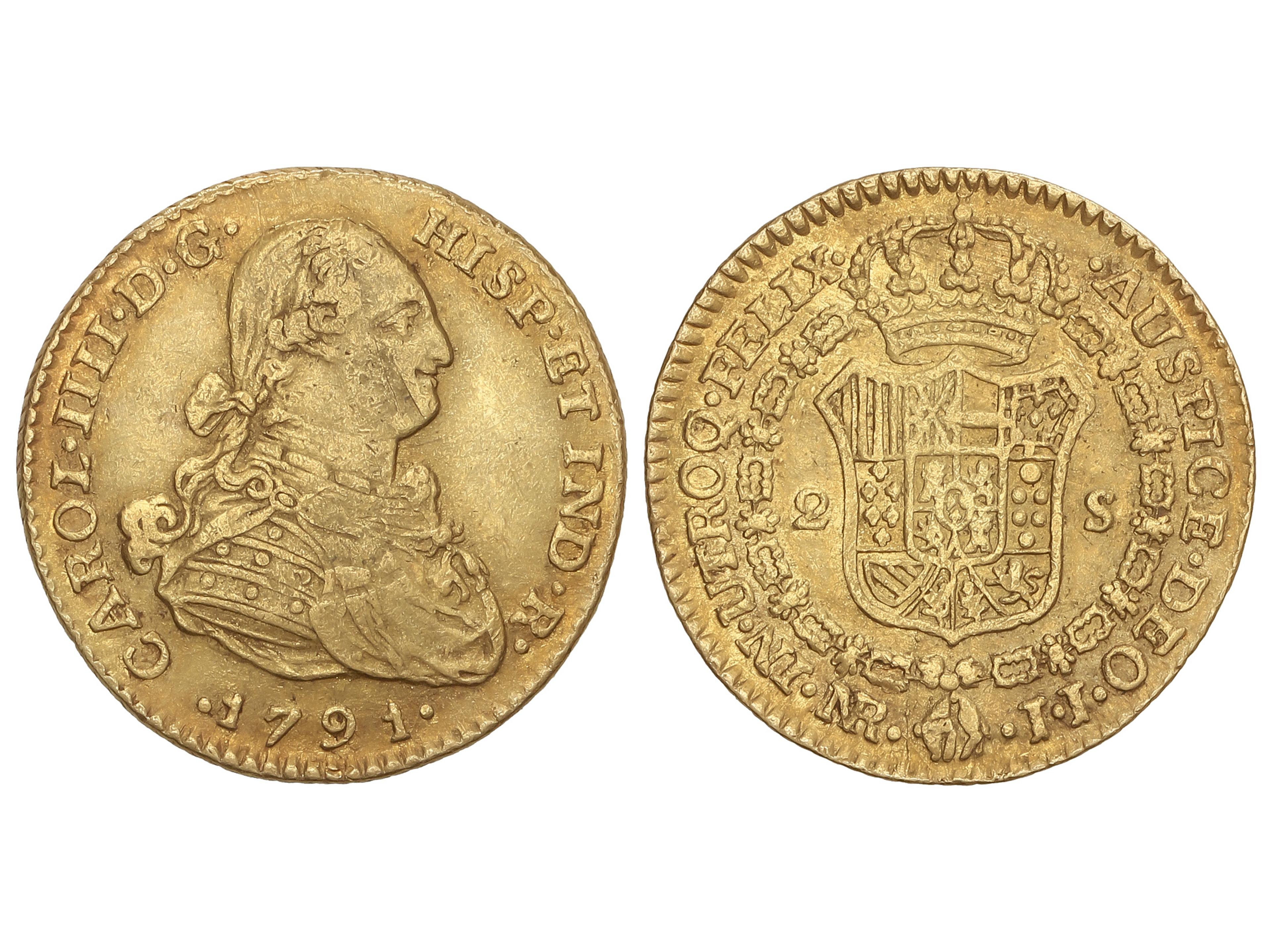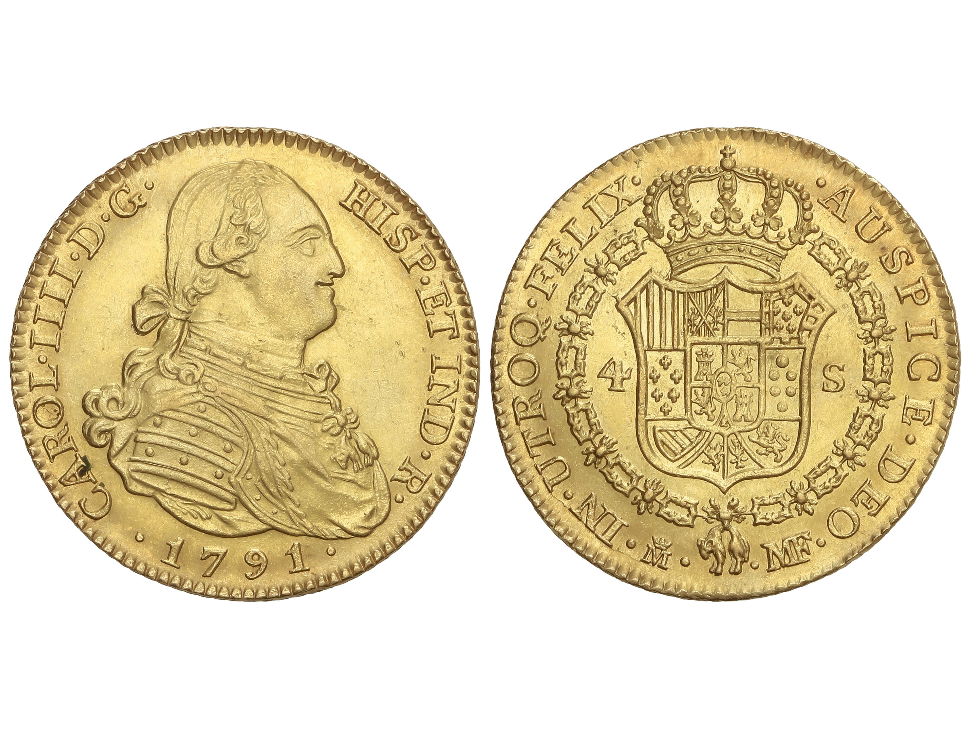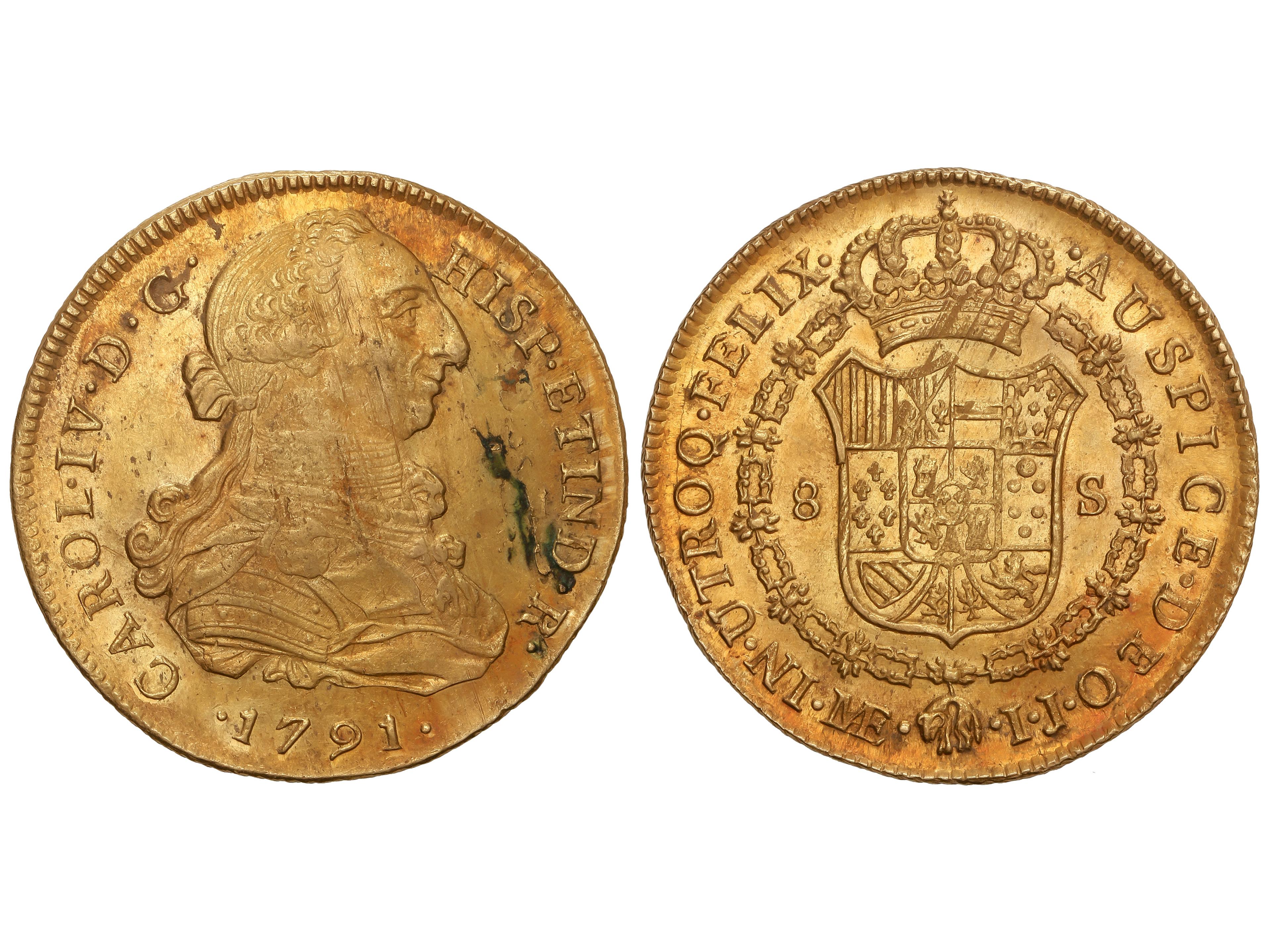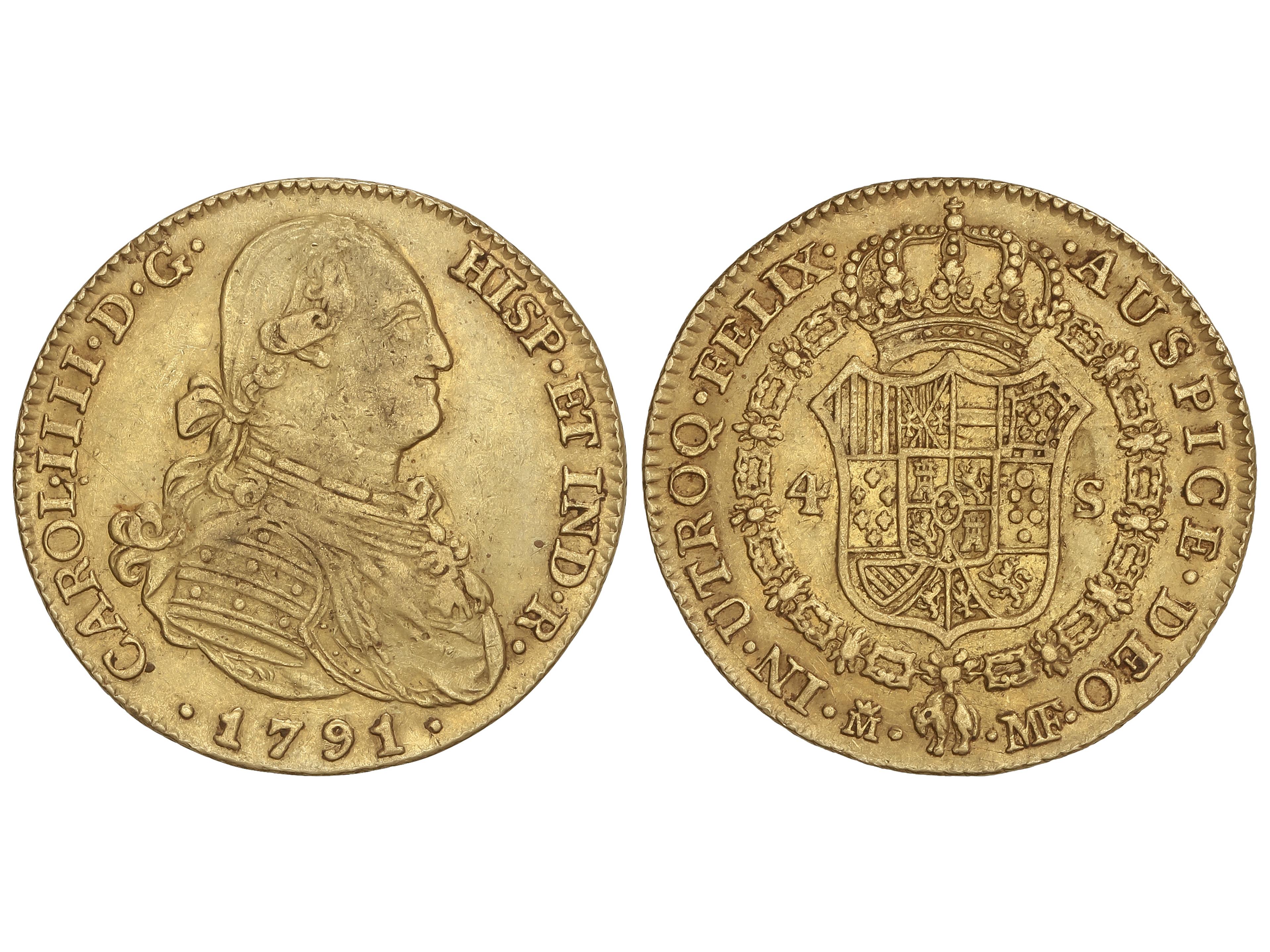 Escudos. 1791. LIMA. I.J. 26,94 grs. Busto de Carlos III. Acuñación algo floja en parte. (Rayitas de ajuste y hojitas con leves concreciones adheridas en anverso). Restos de brillo original. AC-1590; XC-981.