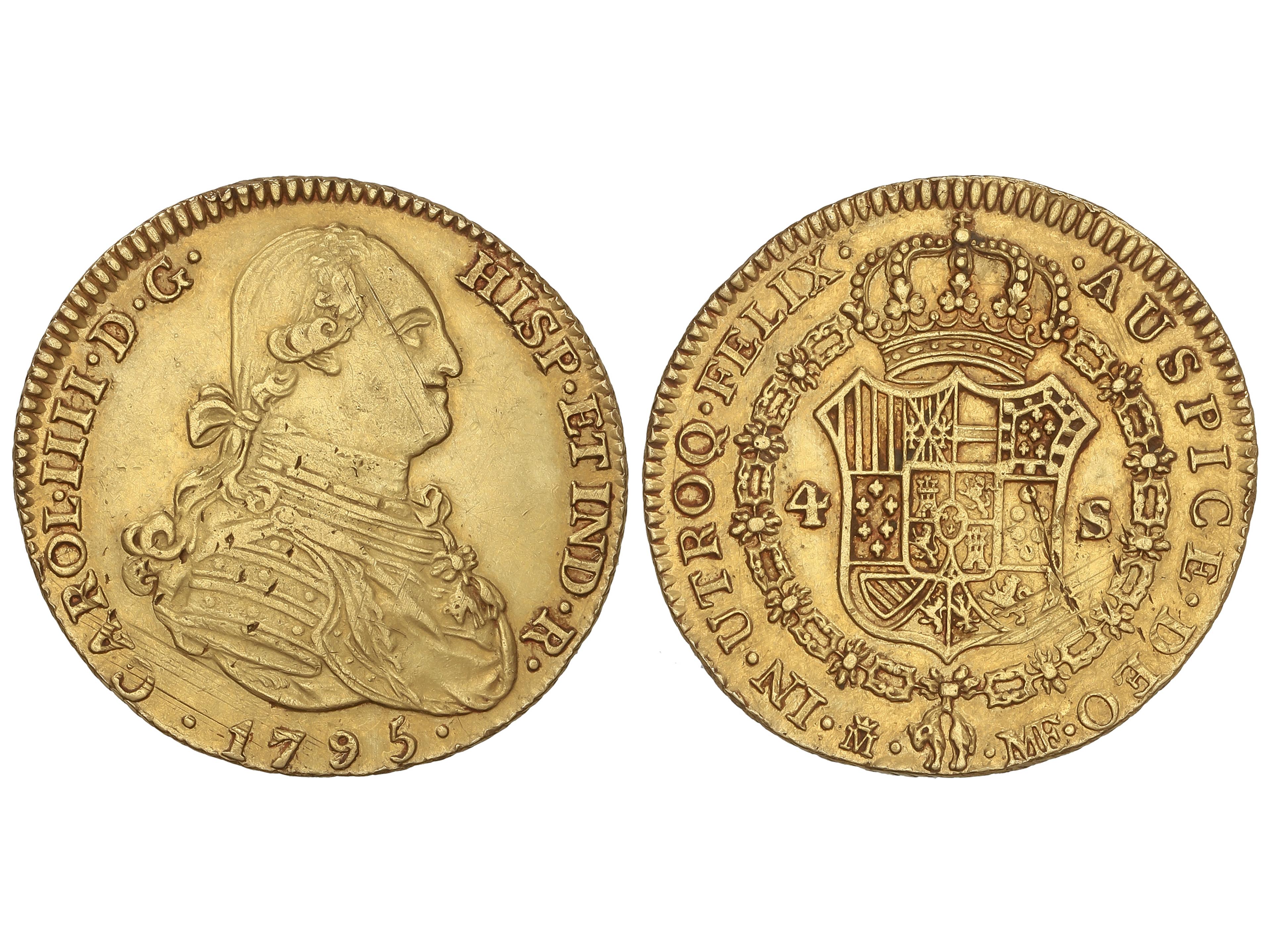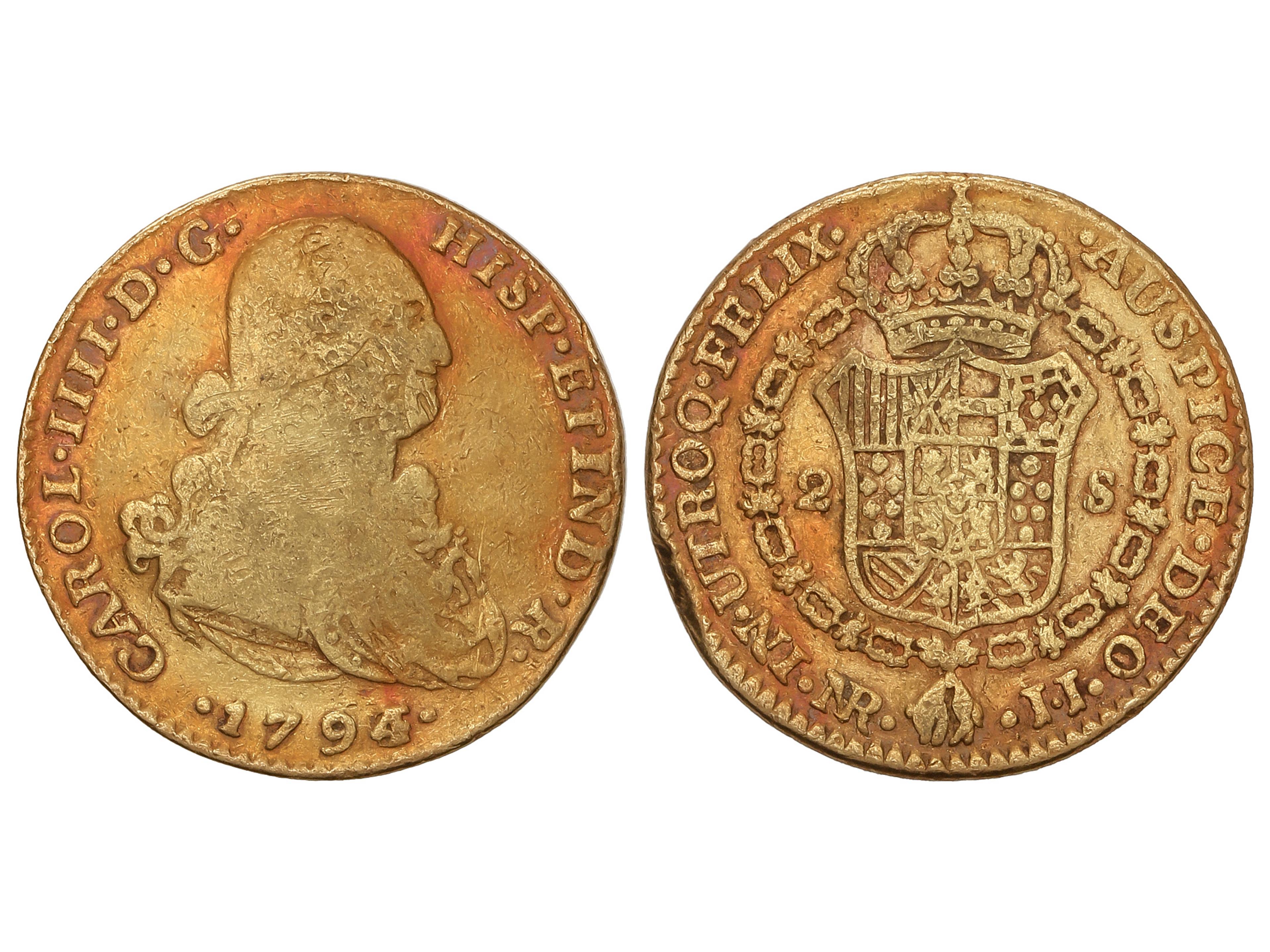 Escudos. 1794/9. NUEVO REINO. J.J. 6,63 grs. Sobrefecha no catalogada. (Descolgada). Leve pátina irisada irregular. AC-1388 var. sobrefecha. MBC-. (Image1)