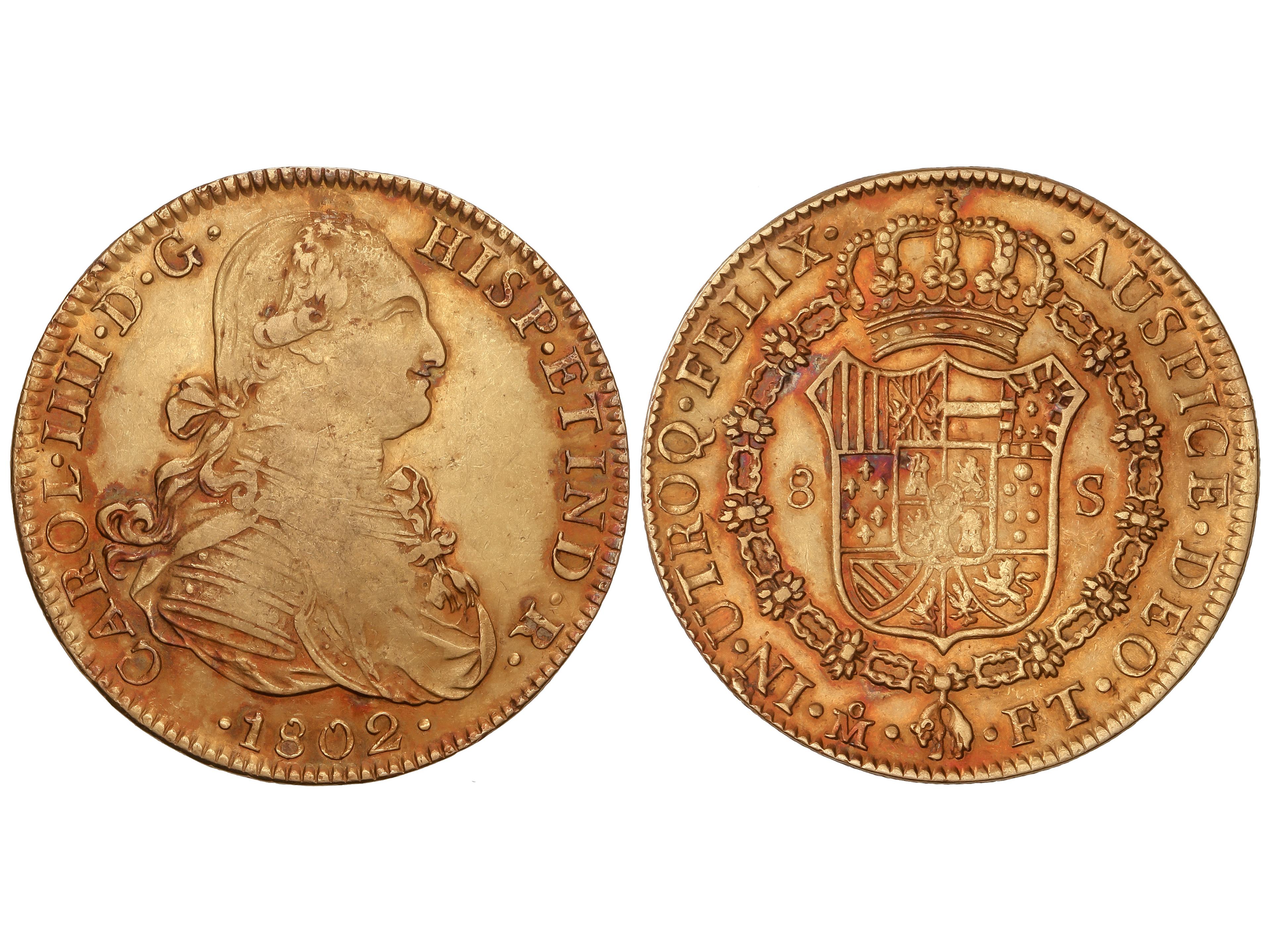 Escudos. 1802. MÉXICO. F.T. 26,95 grs. Pátina irisada irregular. AC-1645; XC-1037. MBC/MBC+. (Image1)